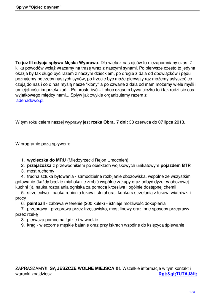 Spływ "Ojciec z synem" To już III edycja spływu Męska Wyprawa. Dla wielu z nas ojców to niezapomniany czas. Z kilku powodów wciąż wracamy na trasę wraz z naszymi synami. Po pierwsze często to jedyna okazja by tak długo być razem z naszym dzieckiem, po drugie z dala od obowiązków i pędu poznajemy potrzeby naszych synów, po trzecie być może pierwszy raz możemy usłyszeć co czują do nas i co o nas myślą nasze "klony" a po czwarte z dala od mam możemy wiele myśli i umiejętności im przekazać... Po prostu być... I choć czasem bywa ciężko to i tak rodzi się coś wyjątkowego między nami... Spływ jak zwykle organizujemy razem z adehadowo.pl. W tym roku celem naszej wyprawy jest rzeka Obra. 7 dni: 30 czerwca do 07 lipca 2013. W programie poza spływem: 1. wycieczka do MRU (Międzyrzecki Rejon Umocnień) 2. przejażdżka z przewodnikiem po obiektach wojskowych unikatowym pojazdem BTR 3. most ruchomy 4. trudna sztuka bytowania - samodzielne rozbijanie obozowiska, wspólne ze wszystkimi gotowanie (każdy będzie miał okazję zrobić wspólne zakupy oraz odbyć dyżur w obozowej kuchni :)), nauka rozpalania ogniska za pomocą krzesiwa i ogólnie dostępnej chemii 5. strzelectwo - nauka robienia łuków i strzał oraz konkurs strzelania z łuków, wiatrówki i procy 6. paintball - zabawa w terenie (200 kulek) - istnieje możliwość dokupienia 7. przeprawy - przeprawa przez trzęsawisko, most linowy oraz inne sposoby przeprawy przez rzekę 8. pierwsza pomoc na lądzie i w wodzie 9. krąg - wieczorne męskie bajanie oraz przy iskrach wspólne do księżyca śpiewanie ZAPRASZAMY!!! SĄ JESZCZE WOLNE MIEJSCA !!!. Wszelkie informacje w tym kontakt i warunki znajdziesz >>TUTAJ< 1/2 Spływ "Ojciec z synem" < 2/2