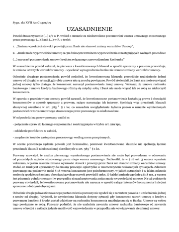 Sygn. akt XVII AmC 1321/09 UZASADNIENIE Powód Stowarzyszenie (...) z/s w P. wniósł o uznanie za niedozwolone postanowień wzorca umownego stosowanego przez pozwanego (...) Bank (...) w P. o treści: 1. „Zmiana wysokości stawek i prowizji przez Bank nie stanowi zmiany warunków Umowy”, 2. „Bank może wypowiedzieć umowę za 30 dniowym terminem wypowiedzenia z następujących ważnych powodów: (…) naruszył postanowienia umowy kredytu związanego z prowadzeniem Rachunku” W uzasadnieniu powód wskazał, że pierwsza z kwestionowanych klauzul w sposób sprzeczny z prawem przewiduje, że zmiana istotnych warunków umowy - wysokość wynagrodzenia banku nie stanowi zmiany warunków umowy. Odnośnie drugiego postanowienia powód podniósł, że kwestionowana klauzula przewiduje uzależnienie jednej umowy od drugiej w sytuacji, gdy obie umowy nie są ze sobą powiązane. Powód stwierdził, że Bank nie może rozwiązać jednej umowy tylko dlatego, że konsument naruszył postanowienia innej umowy. Wskazał, że umowa rachunku bankowego i umowa kredytu bankowego różnią się między sobą i Bank nie może wiązać ich ze sobą na niekorzyść konsumenta. W oparciu o przedstawione zarzuty powód zarzucił, że kwestionowane postanowienia kształtują prawa i obowiązki konsumentów w sposób sprzeczny z prawem, rażąco naruszając ich interesy. Spełniają więc przesłanki klauzuli abuzywnej określone w art. 385 1 § 1 kc, co uzasadnia uwzględnienie żądania pozwu o uznanie wymienionych postanowień wzorca umownego stosowanego przez pozwanego za niedozwolone. W odpowiedzi na pozew pozwany wniósł o: - połączenie spraw do łącznego rozpoznania i rozstrzygnięcia w trybie art. 219 kpc, - oddalenie powództwa w całości, - zasądzenie kosztów zastępstwa procesowego według norm przepisanych, W ocenie pozwanego żądanie powoda jest bezzasadne, ponieważ kwestionowane klauzule nie spełniają łącznie przesłanek klauzuli niedozwolonej określonych w art. 385 1 § 1 kc. Pozwany zauważył, że analiza pierwszego wymienionego postanowienia nie może być prowadzona w oderwaniu od pozostałych zapisów stosowanego przez niego wzorca umownego. Podkreślił, że w § 18 ust. 3 wzorca wyraźnie wskazano, w jakim zakresie zmiana wysokości stawek i prowizji przez Bank nie stanowi zmiany warunków umowy. Dodał, że Bank jest uprawniony do zmiany prowizji i opłat tylko w enumeratywnie wskazanych sytuacjach. Zdaniem pozwanego na podstawie treści § 18 wzorca konsument jest poinformowany, w jakich sytuacjach i w jakim zakresie może się spodziewać zmiany obowiązujących go stawek prowizji i opłat. O każdej zmianie zgodnie z § 18 ust. 4 wzorca jest pisemnie poinformowany i w przypadku niezaakceptowania zmian może wypowiedzieć umowę. Na tej podstawie pozwany stwierdził, że kwestionowane postanowienie nie narusza w sposób rażący interesów konsumenta i nie jest sprzeczne z dobrymi obyczajami. Odnośnie drugiego kwestionowanego postanowienia pozwany nie zgodził się z zarzutem powoda o uzależnieniu jednej z umów od drugiej. Wyjaśnił, że wymieniona klauzula dotyczy sytuacji gdy konsument zawarł umowę o kredyt z pozwanym bankiem i kredyt został udzielony na rachunku konsumenta znajdującym się w Banku. Umowy są wobec tego powiązane ze sobą. Pozwany podniósł, że nie uzależnia zawarcia umowy rachunku bankowego od zawarcia umowy o kredyt a zakłada jedynie możliwość wypowiedzenia w przypadku nie wywiązywania się z innej umowy. W ocenie Banku naruszenie postanowień umowy kredytu związanego z prowadzeniem rachunku w świetle praktyki bankowej należy uznać za ważny powód do wypowiedzenia umowy. Pozwany stwierdził, że kwestionowana klauzula jest zgodna z powszechnie obowiązującymi normami prawa. Precyzyjnie wskazuje termin i przyczyny wypowiedzenia umowy. Uzależnia umowę rachunku bankowego od ewentualnej umowy o kredyt związanej z tym rachunkiem w sposób odpowiadający praktyce działalności gospodarczej banków. W pismach procesowych z dnia 26.11.2009 r. powód podtrzymał w całości żądania pozwu. Podkreślił, że pozwany nie może jednostronnie zmieniać wysokości stawek i prowizji zastrzegając, że taka zmiana nie stanowi zmian zawartej z bankiem umowy oraz nie może zastrzegać sobie prawa do wypowiedzenia umowy rachunku bankowego tylko dlatego, że konsument naruszył inną umowę, która nie ma związku merytorycznego z umową rachunku bankowego. Sąd Ochrony Konkurencji i Konsumentów ustalił co następuje: Bezsporne jest, że pozwany Bank w prowadzonej działalności gospodarczej, przy zawieraniu umów z konsumentami wykorzystuje wzorzec umowny zawierający kwestionowane postanowienia. Okoliczność ta została potwierdzona przez pozwanego w odpowiedzi na pozew. Pozwany nie kwestionował też zgodności brzmienia przytoczonych przez powoda postanowień umownych z klauzulami stosowanymi w praktyce. Wobec tego, w świetle art. 230 kpc, okoliczności te należało uznać za przyznane. Przed przystąpieniem do rozstrzygnięcia sporu konieczne było wyjaśnienie wątpliwości ( nie podnoszonej przez pozwanego) czy pierwsze z kwestionowanych postanowień nie dotyczy głównego świadczenia strony umowy i w związku z tym nie ma do niego zastosowania wyłączenie zawarte w zadaniu drugim art. 385 1 § 1 kc. Zarówno prowizja jak i opłata, o których mowa w kwestionowanym postanowieniu stanowią formę wynagrodzenia należnego bankowi za świadczenie usługi, której dotyczy wzorzec umowny zawierający obie przytoczone przez powoda klauzule. Zgodnie z regulacją art. 385 1 § 1 kc nie podlegają ocenie pod kątem abuzywności te postanowienia wzorca umownego, które określają główne świadczenia, jeżeli zostały sformułowane w sposób jednoznaczny. Oznacza to, że główne świadczenia stron nie mogą być uznane za niedozwolone postanowienia umowne przy zastosowaniu kryteriów określonych w art. 385 1 § 1 kc pod warunkiem 