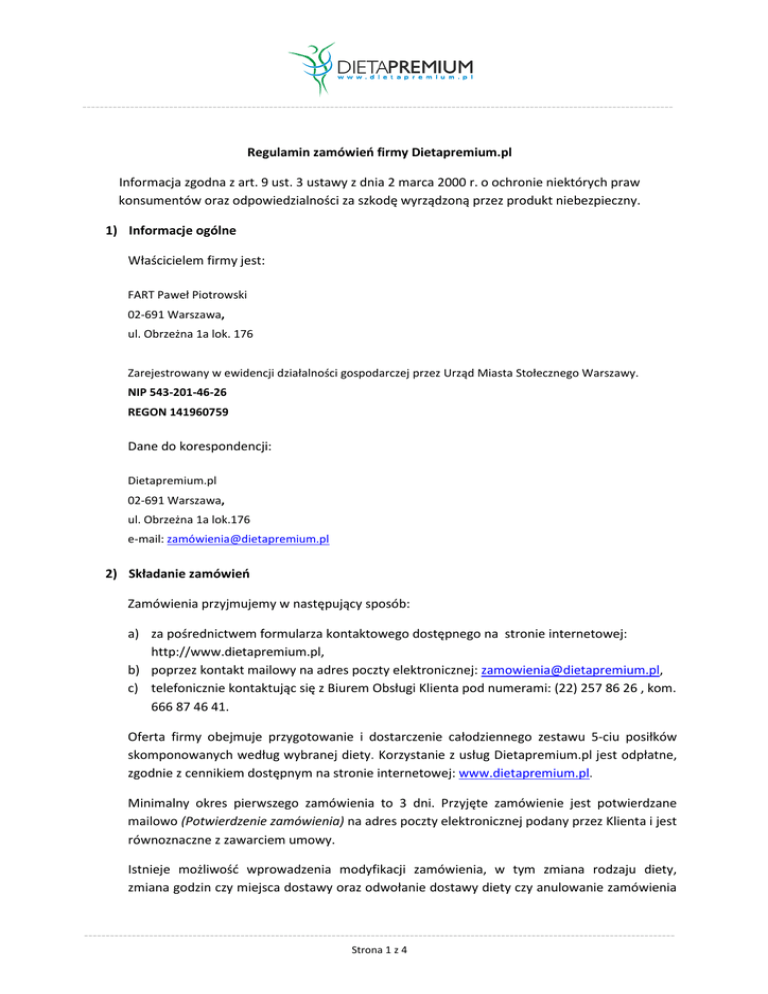---------------------------------------------------------------------------------------------------------------------------------------- Regulamin zamówień firmy Dietapremium.pl Informacja zgodna z art. 9 ust. 3 ustawy z dnia 2 marca 2000 r. o ochronie niektórych praw konsumentów oraz odpowiedzialności za szkodę wyrządzoną przez produkt niebezpieczny. 1) Informacje ogólne Właścicielem firmy jest: FART Paweł Piotrowski 02-691 Warszawa, ul. Obrzeżna 1a lok. 176 Zarejestrowany w ewidencji działalności gospodarczej przez Urząd Miasta Stołecznego Warszawy. NIP 543-201-46-26 REGON 141960759 Dane do korespondencji: Dietapremium.pl 02-691 Warszawa, ul. Obrzeżna 1a lok.176 e-mail: zamó[email protected] 2) Składanie zamówień Zamówienia przyjmujemy w następujący sposób: a) za pośrednictwem formularza kontaktowego dostępnego na stronie internetowej: http://www.dietapremium.pl, b) poprzez kontakt mailowy na adres poczty elektronicznej: [email protected], c) telefonicznie kontaktując się z Biurem Obsługi Klienta pod numerami: (22) 257 86 26 , kom. 666 87 46 41. Oferta firmy obejmuje przygotowanie i dostarczenie całodziennego zestawu 5-ciu posiłków skomponowanych według wybranej diety. Korzystanie z usług Dietapremium.pl jest odpłatne, zgodnie z cennikiem dostępnym na stronie internetowej: www.dietapremium.pl. Minimalny okres pierwszego zamówienia to 3 dni. Przyjęte zamówienie jest potwierdzane mailowo (Potwierdzenie zamówienia) na adres poczty elektronicznej podany przez Klienta i jest równoznaczne z zawarciem umowy. Istnieje możliwość wprowadzenia modyfikacji zamówienia, w tym zmiana rodzaju diety, zmiana godzin czy miejsca dostawy oraz odwołanie dostawy diety czy anulowanie zamówienia ---------------------------------------------------------------------------------------------------------------------------------------Strona 1 z 4 ---------------------------------------------------------------------------------------------------------------------------------------diety pod warunkiem, że zmiany takie zostaną przez Klienta zgłoszone najpóźniej do godziny 10:00 dnia roboczego poprzedzającego dostawę diety. W przypadku dostawy poniedziałkowej, zmiany są przyjmowane do soboty do godziny 10:00. Zmiany zgłoszone po wskazanych powyżej terminach nie zostaną wprowadzone z przyczyn technicznych. Zmiany wprowadzone w zamówieniu każdorazowo skutkują przesłaniem potwierdzenia drogą mailową. W przypadku gdy z tytułu wprowadzenia modyfikacji zamówienia w zakresie terminów dostaw, miejsca dostawy czy zmiany rodzaju diety, powstanie nadpłata środków - może ona być wykorzystana na poczet kolejnego zamówienia lub zostać zwrócona Klientowi (po potwierdzeniu takiej woli oświadczeniem Klienta). W przypadku gdy z tytułu wprowadzenia modyfikacji zamówienia powstanie niedopłata – Klient jest zobowiązany do uregulowania należności. 1. Sposoby dostawy Dostawy są realizowane w dni robocze i soboty w godzinach porannych. Obszary bezpłatnych stref dostaw są dostępne na stronie internetowej: http://www.dietapremium.pl Dostawy są realizowane także do 30 km od granic bezpłatnej strefy dostaw. Opłata za dostawę diety poza bezpłatną strefę zawsze ustalana jest indywidualnie - w takiej sytuacji należy skontaktować się Biurem Obsługi Klienta aby poznać cenę i możliwe godziny dostaw. Szczegółowy adres dostawy oraz wskazany przedział godzinowy realizacji dostawy diety są ujęte w Potwierdzeniu Zamówienia przesyłanym Klientowi na adres poczty elektronicznej. Dietapremium.pl nie odpowiada za niedostarczenie diety z winy nieleżącej po stronie firmy, w tym, w szczególności w sytuacji gdy pod wskazanym adresem i w potwierdzonym przedziale godzinowym nie ma osoby upoważnionej do odbioru zestawu. 2. Sposoby płatności Za dostawę diety obowiązuje system przedpłaty. W przypadku braku płatności do drugiego dnia trwania zamówienia – firma Dietapremium.pl może wstrzymać realizację dalszych dostaw. Istnieje możliwość dokonania wpłaty w następujący sposób: a) przelewem na rachunek bankowy (mBank) 53 1140 2004 0000 3102 7458 0364. W tytule przelewu należy podać imię i nazwisko osoby, której dotyczy zamówienie, (Szczegółowe dane do przelewu wraz z numerem rachunku bankowego do wpłaty oraz wymaganymi danymi podawane są w Potwierdzeniu zamówienia przesyłanym Klientowi), ---------------------------------------------------------------------------------------------------------------------------------------Strona 2 z 4 ---------------------------------------------------------------------------------------------------------------------------------------b) gotówką (w pierwszym dniu dostawy u kuriera). 3. Reklamacje Dietapremium.pl odpowiada wobec Klientów będących konsumentami za niezgodność przedmiotu usługi z umową. Jeżeli usługa wykonana jest w sposób niezgodny z umową, kupujący może żądać doprowadzenia go do stanu zgodnego z umową lub wymianę na nowy, chyba że jest to niemożliwe lub wymagające nadmiernych kosztów. Sprzedawca nie odpowiada za niezgodność przedmiotu usługi z umową, gdy kupujący w chwili zawarcia umowy o tej niezgodności wiedział, lub oceniając rozsądnie, powinien był wiedzieć. Wszelkie reklamacje odnośnie umowy i usługi należy zgłaszać do Biura Obsługi Klienta pod numerami telefonów: (22) 257 86 26 , kom. 666 87 46 41 lub za pomocą poczty elektronicznej na adres e-mai: zamó[email protected] w terminie 3 dni roboczych od momentu ujawnienia się niezgodności. 4. Ochrona danych osobowych Dane osobowe naszych Klientów chronione są zgodnie z Ustawą o ochronie danych osobowych z 29.08.1997 r (Dz. U. Nr 133, poz. 883) oraz Ustawą o świadczeniu usług drogą elektroniczną (Dz. U. Nr 133, poz. 1204). Dane przekazane nam przez Klientów przetwarzane są przez firmę Dietapremium.pl z siedzibą w Warszawie, przy ul. Obrzeżnej 1a lok.176 wyłącznie w celu real
