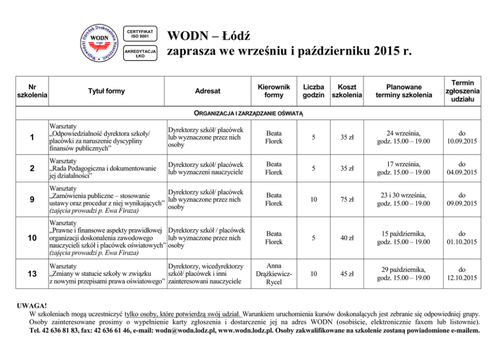 CERTYFIKAT ISO 9001 AKREDYTACJA ŁKO Nr szkolenia Tytuł formy WODN – Łódź zaprasza we wrześniu i październiku 2015 r. Adresat Kierownik formy Liczba godzin Koszt szkolenia Planowane terminy szkolenia Termin zgłoszenia udziału ORGANIZACJA I ZARZĄDZANIE OŚWIATĄ 1 Warsztaty „Odpowiedzialność dyrektora szkoły/ placówki za naruszenie dyscypliny finansów publicznych” Dyrektorzy szkół/ placówek lub wyznaczone przez nich osoby Beata Florek 5 35 zł 24 września, godz. 15.00 – 19.00 do 10.09.2015 2 Warsztaty „Rada Pedagogiczna i dokumentowanie jej działalności” Dyrektorzy szkół/ placówek lub wyznaczeni nauczyciele Beata Florek 5 35 zł 17 września, godz. 15.00 – 19.00 do 04.09.2015 9 Warsztaty Dyrektorzy szkół/ placówek „Zamówienia publiczne – stosowanie lub wyznaczone przez nich ustawy oraz procedur z niej wynikających” osoby (zajęcia prowadzi p. Ewa Firaza) Beata Florek 10 75 zł 23 i 30 września, godz. 15.00 – 19.00 do 09.09.2015 10 Warsztaty „Prawne i finansowe aspekty prawidłowej Dyrektorzy szkół / placówek organizacji doskonalenia zawodowego lub wyznaczone przez nich nauczycieli szkół i placówek oświatowych” osoby (zajęcia prowadzi p. Ewa Firaza) Beata Florek 5 40 zł 15 października, godz. 15.00 – 19.00 do 01.10.2015 13 Warsztaty Dyrektorzy, wicedyrektorzy „Zmiany w statucie szkoły w związku szkół/ placówek i inni z nowymi przepisami prawa oświatowego” zainteresowani nauczyciele Anna DrążkiewiczRycel 10 45 zł 29 października, godz. 15.00 – 19.00 do 12.10.2015 UWAGA! W szkoleniach mogą uczestniczyć tylko osoby, które potwierdzą swój udział. Warunkiem uruchomienia kursów doskonalących jest zebranie się odpowiedniej grupy. Osoby zainteresowane prosimy o wypełnienie karty zgłoszenia i dostarczenie jej na adres WODN (osobiście, elektronicznie faxem lub listownie). Tel. 42 636 81 83, fax: 42 636 61 46, e-mail: [email protected], www.wodn.lodz.pl. Osoby zakwalifikowane na szkolenie zostaną powiadomione e-mailem. 14 Warsztaty „Szkoła dobrze postrzegana – inspirujące metody kreowania wizerunku placówki” Dyrektorzy, wicedyrektorzy szkół/ placówek i inni zainteresowani nauczyciele Anna Góra 10 45 zł 19 i 26 października, godz. 15.00 – 19.00 do 05.10.2015 17 Warsztaty „Dokumentacja w pracy nauczyciela szkoły podstawowej i gimnazjum” Nauczyciele szkół podstawowych i gimnazjów Anna DrążkiewiczRycel Anna Śladek 5 35 zł 22 października, godz. 15.00 – 19.00 do 05.10.2015 18 Warsztaty „Administrator Bezpieczeństwa Informacji w szkole/ placówce oświatowej – rola i zadania” Osoby pełniące funkcję Administratora Bezpieczeństwa Informacji w szkole/ placówce oświatowej Anna Śladek 5 35 zł 28 października, godz. 15.00 – 19.00 do 12.10.2015 19 Warsztaty Dyrektorzy, wicedyrektorzy „Doskonalenie kluczowych kompetencji szkół / placówek, inni dyrektora szkoły – komunikacja, mediacja zainteresowani nauczyciele (zajęcia prowadzi p. Małgorzata Staciwa)” Anna Góra 5 35 zł 26 października, godz. 15.00 – 19.00 do 12.10.2015 21 Warsztaty Dyrektorzy, wicedyrektorzy „Dyrektor jako pracodawca” szkół/ placówek, inni (zajęcia prowadzi p. Małgorzata Staciwa) zainteresowani nauczyciele Anna Góra 5 35 zł 21 września, godz. 15.00 – 19.00 do 14.09.2015 254 Szkolenie rady pedagogicznej „Ewaluacja wewnętrzna jako narzędzie rozwoju szkoły/ placówki” rady pedagogiczne Beata Florek 4 do uzgodnienia z placówką zamawiającą 255 Szkolenie rady pedagogicznej „Rada Pedagogiczna i dokumentowanie jej pracy” rady pedagogiczne Beata Florek 4 do uzgodnienia z placówką zamawiającą 256 Szkolenie rady pedagogicznej „Odpowiedzialność prawna nauczycieli, rodziców i uczniów” rady pedagogiczne Beata Florek 4 do uzgodnienia z placówką zamawiającą 257 Szkolenie rady pedagogicznej „Program i harmonogram poprawy efektywności kształcenia – jego konstruowanie i wdrażanie i wdrażanie w szkole” rady pedagogiczne Beata Florek 4 do uzgodnienia z placówką zamawiającą 2 UWAGA! W szkoleniach mogą uczestniczyć tylko osoby, które potwierdzą swój udział. Warunkiem uruchomienia kursów doskonalących jest zebranie się odpowiedniej grupy. Osoby zainteresowane prosimy o wypełnienie karty zgłoszenia i dostarczenie jej na adres WODN (osobiście, elektronicznie faxem lub listownie). Tel. 42 636 81 83, fax: 42 636 61 46, e-mail: [email protected], www.wodn.lodz.pl. Osoby zakwalifikowane na szkolenie zostaną powiadomione. 258 Szkolenie rady pedagogicznej „Ewaluacja zewnętrzna i co dalej?rady pedagogiczne wykorzystanie wniosków poewaluacyjnych w planowaniu pracy szkoły” Beata Florek 4 do uzgodnienia z placówką zamawiającą 259 Szkolenie rady pedagogicznej „Budowanie koncepcji pracy szkoły/ placówki” rady pedagogiczne Anna Śladek 4 do uzgodnienia z placówką zamawiającą 260 Szkolenie rady pedagogicznej „Efektywna współpraca nauczycieli rady pedagogiczne w zespołach jako jedno z wymagań wobec szkół i placówek” Anna Śladek 4 do uzgodnienia z placówką zamawiającą 4 do uzgodnienia z placówką zamawiającą 261 Szkolenie rady pedagogicznej „Prawo oświatowe dla nauczycieli” rady pedagogiczne Anna DrążkiewiczRycel Anna Śladek 262 Szkolenie rady pedagogicznej „Obowiązki nauczycieli w zakresie ochrony danych osobowych” rady pedagogiczne Anna Góra Anna Śladek 4 do uzgodnienia z placówką zamawiającą 263 Szkolenie rady pedagogicznej „Wystąpienia publiczne - skutecznie i bezstresowo” rady pedagogiczne Anna Góra Anna DrążkiewiczRycel 4 do uzgodnienia z placówką zamawiającą 264 Szkolenie rady pedagogicznej „Jak stosować zasady marketingu w placówce oświatowej?” rady pedagogiczne Anna Góra 4 do uzgodnienia z placówką zamawiającą 265 Szkolenie rady pedagogicznej „Obserwacje, hospitacje i lekcje koleżeńskie inaczej” rady pedagogiczne Anna Góra 4 do uzgodnienia z placówką zamawiaj