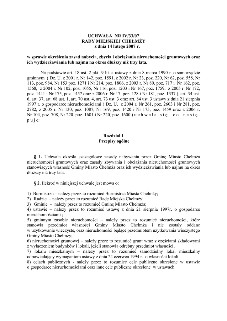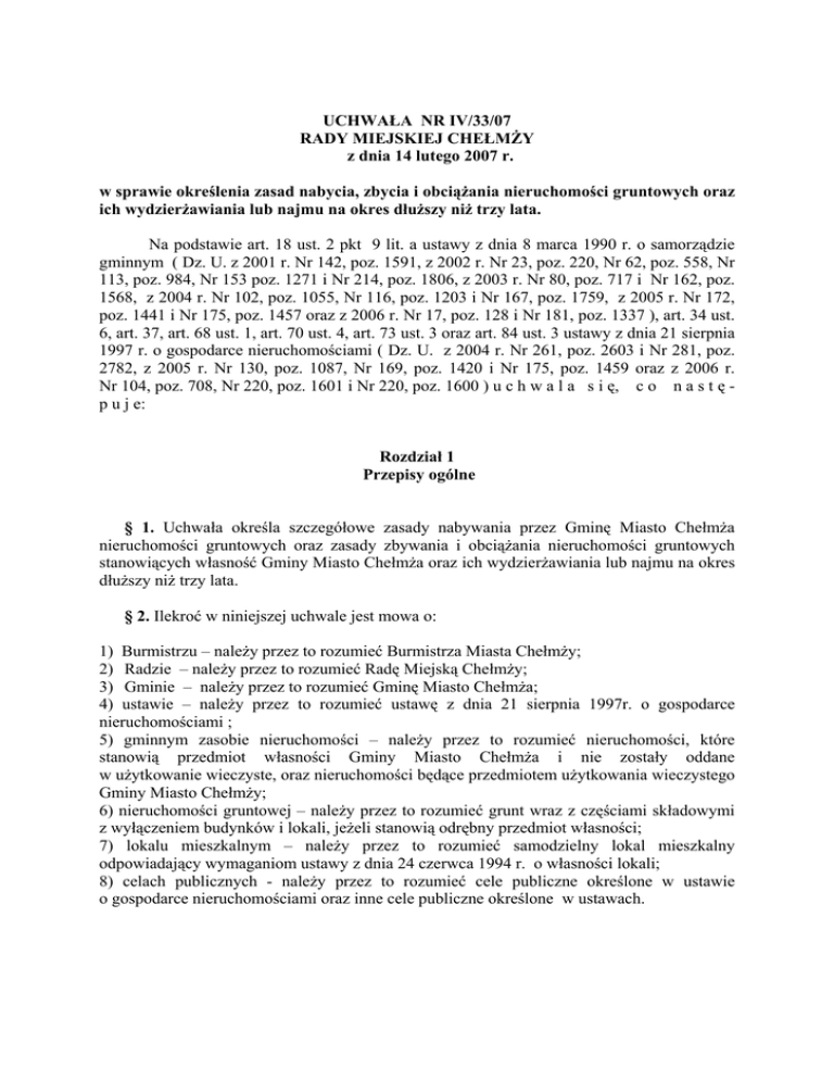 UCHWAŁA NR IV/33/07 RADY MIEJSKIEJ CHEŁMŻY z dnia 14 lutego 2007 r. w sprawie określenia zasad nabycia, zbycia i obciążania nieruchomości gruntowych oraz ich wydzierżawiania lub najmu na okres dłuższy niż trzy lata. Na podstawie art. 18 ust. 2 pkt 9 lit. a ustawy z dnia 8 marca 1990 r. o samorządzie gminnym ( Dz. U. z 2001 r. Nr 142, poz. 1591, z 2002 r. Nr 23, poz. 220, Nr 62, poz. 558, Nr 113, poz. 984, Nr 153 poz. 1271 i Nr 214, poz. 1806, z 2003 r. Nr 80, poz. 717 i Nr 162, poz. 1568, z 2004 r. Nr 102, poz. 1055, Nr 116, poz. 1203 i Nr 167, poz. 1759, z 2005 r. Nr 172, poz. 1441 i Nr 175, poz. 1457 oraz z 2006 r. Nr 17, poz. 128 i Nr 181, poz. 1337 ), art. 34 ust. 6, art. 37, art. 68 ust. 1, art. 70 ust. 4, art. 73 ust. 3 oraz art. 84 ust. 3 ustawy z dnia 21 sierpnia 1997 r. o gospodarce nieruchomościami ( Dz. U. z 2004 r. Nr 261, poz. 2603 i Nr 281, poz. 2782, z 2005 r. Nr 130, poz. 1087, Nr 169, poz. 1420 i Nr 175, poz. 1459 oraz z 2006 r. Nr 104, poz. 708, Nr 220, poz. 1601 i Nr 220, poz. 1600 ) u c h w a l a s i ę, c o n a s t ę p u j e: Rozdział 1 Przepisy ogólne § 1. Uchwała określa szczegółowe zasady nabywania przez Gminę Miasto Chełmża nieruchomości gruntowych oraz zasady zbywania i obciążania nieruchomości gruntowych stanowiących własność Gminy Miasto Chełmża oraz ich wydzierżawiania lub najmu na okres dłuższy niż trzy lata. § 2. Ilekroć w niniejszej uchwale jest mowa o: 1) Burmistrzu – należy przez to rozumieć Burmistrza Miasta Chełmży; 2) Radzie – należy przez to rozumieć Radę Miejską Chełmży; 3) Gminie – należy przez to rozumieć Gminę Miasto Chełmża; 4) ustawie – należy przez to rozumieć ustawę z dnia 21 sierpnia 1997r. o gospodarce nieruchomościami ; 5) gminnym zasobie nieruchomości – należy przez to rozumieć nieruchomości, które stanowią przedmiot własności Gminy Miasto Chełmża i nie zostały oddane w użytkowanie wieczyste, oraz nieruchomości będące przedmiotem użytkowania wieczystego Gminy Miasto Chełmży; 6) nieruchomości gruntowej – należy przez to rozumieć grunt wraz z częściami składowymi z wyłączeniem budynków i lokali, jeżeli stanowią odrębny przedmiot własności; 7) lokalu mieszkalnym – należy przez to rozumieć samodzielny lokal mieszkalny odpowiadający wymaganiom ustawy z dnia 24 czerwca 1994 r. o własności lokali; 8) celach publicznych - należy przez to rozumieć cele publiczne określone w ustawie o gospodarce nieruchomościami oraz inne cele publiczne określone w ustawach. Rozdział 2 Nabywanie nieruchomości gruntowych do gminnego zasobu nieruchomości § 3.1. Burmistrz może bez zgody Rady nabywać na własność albo w użytkowanie wieczyste nieruchomości gruntowe do gminnego zasobu nieruchomości jedynie w przypadku, gdy jest to niezbędne do realizacji celów publicznych. 2. Przedmiotem nabycia mogą być nieruchomości stanowiące własność osób fizycznych i prawnych oraz przysługujące tym osobom prawo użytkowania wieczystego. 3. Nabycie nieruchomości niezbędnych dla realizacji celów publicznych przez Gminę może być dokonane tylko w ramach środków przewidzianych na te cele w uchwale budżetowej. 4. Nabycie nieruchomości należy poprzedzić rokowaniami przeprowadzonymi pomiędzy Burmistrzem, a właścicielem lub użytkownikiem wieczystym nieruchomości, mającymi na celu ustalenie warunków nabycia, w tym także ceny nieruchomości. 5. Podstawą do rokowań przy nabywaniu nieruchomości, mających na celu również ustalenie ceny nabycia nieruchomości jest opinia szacunkowa wykonana przez rzeczoznawcę majątkowego. 6. Upoważnia się Burmistrza do występowania z wnioskami do Wojewody KujawskoPomorskiego o przekazanie mienia Skarbu Państwa na rzecz Gminy w trybie przepisów ustawy z dnia 10 maja 1990 r. - Przepisy wprowadzające ustawę o samorządzie terytorialnym i pracownikach samorządowych ( Dz. U z 1990 r. Nr 32, poz. 131 z późn. zm. ) oraz przepisów ustawy z dnia 13 października 1998 r. - Przepisy wprowadzające ustawy reformujące administrację publiczną ( Dz. U. z 1998 r. Nr 133, poz. 872 z późn. zm. ), jeżeli jest ono związane z realizacją jej zadań. § 4. Zasady określone w § 3 ust. 2-5 stosuje się też odpowiednio w przypadku ustanowienia na rzecz Gminy ograniczonych praw rzeczowych na nieruchomościach stanowiących własność osób trzecich. Rozdział 3 Zbywanie nieruchomości gruntowych stanowiących własność Gminy § 5.1. Zbycie nieruchomości gruntowej może nastąpić w szczególności w drodze: 1) 2) 3) 4) 5) sprzedaży; oddania jej w użytkowanie wieczyste; zamiany; darowizny; zrzeczenia się; 6) wniesienia prawa własności nieruchomości lub prawa użytkowania wieczystego aportem do spółki prawa handlowego; 7) przekazania nieruchomości jako majątku tworzonej fundacji lub jako wyposażenie gminnej osoby prawnej. 2. Sprzedaż nieruchomości lub oddanie w użytkowanie wieczyste nieruchomości gruntowej następuje w drodze przetargu lub w drodze bezprzetargowej, jeżeli spełnione zostaną określone warunki, o których mowa jest w ustawie bądź w niniejszej uchwale. 3. Burmistrz przeznaczając nieruchomość do zbycia równocześnie z ogłoszeniem wykazu nieruchomości przeznaczonych do zbycia zobowiązany jest zawiadomić osoby, którym przysługuje pierwszeństwo nabycia nieruchomości objętych wykazem. 4. Warunki zbycia lub oddania w użytkowanie wieczyste w drodze bezprzetargowej ustala Burmistrz w rokowaniach przeprowadzanych z nabywcą. 5. Protokół z przeprowadzonego przetargu oraz protokół z rokowań przy zbyciu lub oddaniu w użytkowanie wieczyste w drodze bezprzetargowej stanowią podstawę do zawarcia przez Burmistrza umowy w formie aktu notarialnego. 6. W umowach sprzedaży nieruchomości gruntowych, w których zastosowana została jakakolwiek bonifikata od ceny sprzedaży zastrzegane będzie na rzecz Gminy prawo pierwokupu nieruchomości na czas lat 5. W innych uzasad