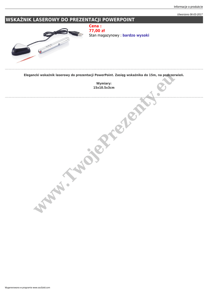 Informacje o produkcie Utworzono 06-03-2017 WSKAŹNIK LASEROWY DO PREZENTACJI POWERPOINT Cena : 77,00 zł Stan magazynowy : bardzo wysoki w w w .T w oj y. e eP re ze nt Wymiary: 15x10.5x3cm u Elegancki wskaźnik laserowy do prezentacji PowerPoint. Zasięg wskaźnika do 15m, na podczerwień. Wygenerowano w programie www.oscGold.com