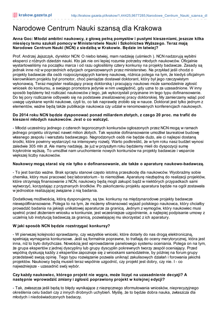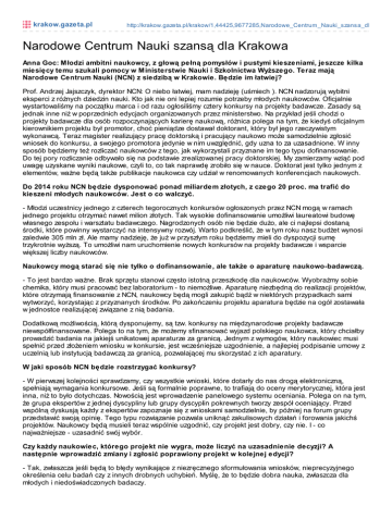 krakow.gazeta.pl http://krakow.gazeta.pl/krakow/1,44425,9677285,Narodowe_Centrum_Nauki_szansa_dla_Krako Narodowe Centrum Nauki szansą dla Krakowa Anna Goc: M łodzi ambitni naukowcy, z głową pełną pomysłów i pustymi kieszeniami, jeszcze kilka miesięcy temu szukali pomocy w M inisterstwie Nauki i Szkolnictwa Wyższego. Teraz mają Narodowe Centrum Nauki (NCN) z siedzibą w Krakowie. Będzie im łatwiej? Prof. Andrzej Jajszczyk, dyrektor NCN: O niebo łatwiej, mam nadzieję (uśmiech ). NCN nadzorują wybitni eksperci z różnych dziedzin nauki. Kto jak nie oni lepiej rozumie potrzeby młodych naukowców. Oficjalnie wystartowaliśmy na początku marca i od razu ogłosiliśmy cztery konkursy na projekty badawcze. Zasady są jednak inne niż w poprzednich edycjach organizowanych przez ministerstwo. Na przykład jeśli chodzi o projekty badawcze dla osób rozpoczynających karierę naukową, różnica polega na tym, że kiedyś oficjalnym kierownikiem projektu był promotor, choć pieniądze dostawał doktorant, który był jego rzeczywistym wykonawcą. Teraz magister realizujący pracę doktorską i pracujący naukowo może samodzielnie zgłosić wniosek do konkursu, a swojego promotora jedynie w nim uwzględnić, gdy uzna to za uzasadnione. W inny sposób będziemy też rozliczać naukowców z tego, jak wykorzystali przyznane im tego typu dofinansowanie. Do tej pory rozliczanie odbywało się na podstawie zrealizowanej pracy doktorskiej. My zamierzamy wziąć pod uwagę uzyskane wyniki naukowe, czyli to, co tak naprawdę zrobiło się w nauce. Doktorat jest tylko jednym z elementów, ważne będą także publikacje naukowca czy udział w renomowanych konferencjach naukowych. Do 2014 roku NCN będzie dysponować ponad miliardem złotych, z czego 20 proc. ma trafić do kieszeni młodych naukowców. Jest o co walczyć. - Młodzi uczestnicy jednego z czterech tegorocznych konkursów ogłoszonych przez NCN mogą w ramach jednego projektu otrzymać nawet milion złotych. Tak wysokie dofinansowanie umożliwi laureatowi budowę własnego zespołu i warsztatu badawczego. Nagrodzonych osób nie będzie dużo, ale ci najlepsi dostaną środki, które powinny wystarczyć na intensywny rozwój. Warto podkreślić, że w tym roku nasz budżet wynosi zaledwie 305 mln zł. Ale mamy nadzieję, że już w przyszłym roku będziemy mieli do dyspozycji sumę trzykrotnie wyższą. To umożliwi nam uruchomienie nowych konkursów na projekty badawcze i wsparcie większej liczby naukowców. Naukowcy mogą starać się nie tylko o dofinansowanie, ale także o aparaturę naukowo-badawczą. - To jest bardzo ważne. Brak sprzętu stanowi często istotną przeszkodę dla naukowców. Wyobraźmy sobie chemika, który musi pracować bez laboratorium - to niemożliwe. Aparaturę niezbędną do realizacji projektów, które otrzymają finansowanie z NCN, naukowcy będą mogli zakupić bądź w niektórych przypadkach sami wytworzyć, korzystając z przyznanych środków. Po zakończeniu projektu aparatura będzie na ogół zostawała w jednostce realizującej związane z nią badania. Dodatkową możliwością, którą dysponujemy, są tzw. konkursy na międzynarodowe projekty badawcze niewspółfinansowane. Polega to na tym, że możemy sfinansować wyjazd polskiego naukowca, który chciałby prowadzić badania na jakiejś unikatowej aparaturze za granicą. Jednym z wymogów, który naukowiec musi spełnić przed złożeniem wniosku w konkursie, jest wcześniejsze uzgodnienie, a najlepiej podpisanie umowy z uczelnią lub instytucją badawczą za granicą, pozwalającej mu skorzystać z ich aparatury. W jaki sposób NCN będzie rozstrzygać konkursy? - W pierwszej kolejności sprawdzamy, czy wszystkie wnioski, które dotarły do nas drogą elektroniczną, spełniają wymagania konkursowe. Jeśli są formalnie poprawne, to trafiają do oceny merytorycznej, która jest inna, niż to było dotychczas. Nowością jest wprowadzenie panelowego systemu oceniania. Polega on na tym, że grupa ekspertów z jednej dyscypliny lub grupy dyscyplin pokrewnych tworzy zespół oceniający. Przed wspólną dyskusją każdy z ekspertów zapoznaje się z wnioskami samodzielnie, by później na forum grupy przedstawić swoją opinię. Tego typu rozwiązanie pozwala uniknąć zakulisowych działań i forowania jakichś projektów. Naukowcy będą musieli teraz wspólnie uzgodnić, czy projekt jest dobry, czy nie. I - co najważniejsze - uzasadnić swój wybór. Czy każdy naukowiec, którego projekt nie wygra, może liczyć na uzasadnienie decyzji? A następnie wprowadzić zmiany i zgłosić poprawiony projekt w kolejnej edycji? - Tak, zwłaszcza jeśli będą to błędy wynikające z niezręcznego sformułowania wniosków, nieprecyzyjnego określenia celu badań czy z innych drobnych uchybień. Myślę, że to będzie dobra nauka, zwłaszcza dla młodych i niedoświadczonych badaczy. Często w naszej rozmowie pada określenie "dla młodych naukowców" - czyli jakich? Są jakieś bariery wiekowe dla uczestników konkursów? - Nie ma żadnych barier wiekowych, choć zgodnie z ustawą, na podstawie której NCN funkcjonuje, znaczna część naszych środków powinna trafić do naukowców poniżej 35. roku życia. Nie zamykamy jednak drogi tym starszym. Mówiąc o młodych, mam na myśli raczej etap rozwoju naukowego. Dwa rodzaje naszych konkursów są skierowane do osób, które rozpoczynają karierę naukową i albo dopiero się doktoryzują, albo obroniły doktorat nie dawniej niż w ciągu ostatnich pięciu lat. Naukowcy mają czas do 15 czerwca na przesyłanie wniosków. Czy możemy już powiedzieć, z których miast napłynęło ich do najwięcej? - Nie mamy jeszcze takich danych. Ale łatwo przewidzieć, że najwięcej zainteresowanych będzie z największych ośrodków naukowych w Polsce - Krakowa, Warszawy, Wrocławia, Poznania czy Gdańska. Zawsze tak było i nie przypuszczam, żeby mogło być inaczej. Choć oczywiście czekamy na