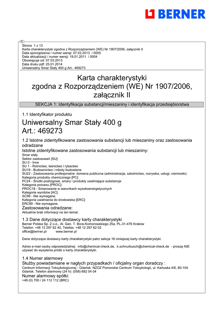 Strona 1 z 13 Karta charakterystyki zgodna z Rozporządzeniem (WE) Nr 1907/2006, załącznik II Data sporządzenia / numer wersji: 07.03.2013 / 0005 Data aktualizacji / numer wersji: 19.01.2011 / 0004 Obowiązuje od: 07.03.2013 Data druku pdf: 25.01.2014 Uniwersalny Smar Stały 400 g Art.: 469273 Karta charakterystyki zgodna z Rozporządzeniem (WE) Nr 1907/2006, załącznik II SEKCJA 1: Identyfikacja substancji/mieszaniny i identyfikacja przedsiębiorstwa 1.1 Identyfikator produktu Uniwersalny Smar Stały 400 g Art.: 469273 1.2 Istotne zidentyfikowane zastosowania substancji lub mieszaniny oraz zastosowania odradzane Istotne zidentyfikowane zastosowania substancji lub mieszaniny: Smar stały Sektor zastosowań [SU]: SU 0 - Inne SU 1 - Rolnictwo, leśnictwo i rybactwo SU19 - Budownictwo i roboty budowlane SU22 - Zastosowania profesjonalne: domena publiczna (administracja, szkolnictwo, rozrywka, usługi, rzemiosło) Kategoria produktu chemicznego [PC]: PC24 - Środki poślizgowe, smary i produkty uwalniające substancje Kategoria procesu [PROC]: PROC18 - Smarowanie w warunkach wysokoenergetycznych Kategorie wyrobów [AC]: AC99 - Nie wymagane. Kategoria uwalniania do środowiska [ERC]: ERC99 - Nie wymagane. Zastosowania odradzane: Aktualnie brak informacji na ten temat. 1.3 Dane dotyczące dostawcy karty charakterystyki Berner Polska Sp. Z o.o., Al. Gen. T. Bora-Komorowskiego 25a, PL-31-476 Kraków Telefon: +48 12 297 62 40, Telefax: +48 12 297 62 02 [email protected] www.berner.pl Dane dotyczące dostawcy karty charakterystyki patrz sekcja 16 niniejszej karty charakterystyki. Adres e-mail osoby odpowiedzialnej: [email protected], [email protected] - proszę NIE używać do wysyłania próśb o karty charakterystyki. 1.4 Numer alarmowy Służby powiadamiane w nagłych przypadkach / oficjalny organ doradczy : Centrum Informacji Toksykologicznej - Gdańsk. NZOZ Pomorskie Centrum Toksykologii, ul. Kartuska 4/6, 80-104 Gdańsk. Telefon alarmowy (24 h): (058) 682 04 04 Numer alarmowy spółki: +49 (0) 700 / 24 112 112 (BRC) Strona 2 z 13 Karta charakterystyki zgodna z Rozporządzeniem (WE) Nr 1907/2006, załącznik II Data sporządzenia / numer wersji: 07.03.2013 / 0005 Data aktualizacji / numer wersji: 19.01.2011 / 0004 Obowiązuje od: 07.03.2013 Data druku pdf: 25.01.2014 Uniwersalny Smar Stały 400 g Art.: 469273 SEKCJA 2: Identyfikacja zagrożeń 2.1 Klasyfikacja substancji lub mieszaniny 2.1.1 Klasyfikacja zgodnie z rozporządzeniem (WE) Nr 1272/2008 (CLP) Zgodnie z rozporządzeniem (WE) Nr 1272/2008 (CLP) mieszanina nie została sklasyfikowana jako niebezpieczna. 2.1.2 Klasyfikacja zgodnie z dyrektywami 67/548/EWG oraz 1999/45/WE (łącznie ze zmianami) Zgodnie z dyrektywą 1999/45/WE mieszanina nie została sklasyfikowana jako niebezpieczna. 2.2 Elementy oznakowania 2.2.1 Oznakowanie zgodnie z rozporządzeniem (WE) Nr 1272/2008 (CLP) Nie dotyczy 2.3 Inne zagrożenia Mieszanina nie zawiera substancji vPvB (PBT = very persistent, very bioaccumulative) bądź nie jest wykazana w załączniku XIII rozporządzenia (WE) 1907/2006. Mieszanina nie zawiera substancji PBT (PBT = persistent, bioaccumulative, toxic) bądź nie jest wykazana w załączniku XIII rozporządzenia (WE) 1907/2006. SEKCJA 3: Skład/informacja o składnikach Olej mineralny Mydło litowe Substancja biologicznie czynna 3.1 Substancja n.s. 3.2 Mieszanina -Numer rejestracji (REACH) Index EINECS, ELINCS, NLP CAS Stęż.% Klasyfikacja zgodnie z dyrektywą 67/548/EWG Klasyfikacja zgodnie z rozporządzeniem (WE) Nr 1272/2008 (CLP) ------ SEKCJA 4: Środki pierwszej pomocy 4.1 Opis środków pierwszej pomocy Drogi oddechowe Nie wymagane. Kontakt ze skórą Umyć dokładnie dużą ilością wody, zanieczyszczone, nasycone ubrania niezwłocznie usunąć. Kontakt z oczami Przez kilka minut dokładnie spłukać dużą ilością wody, jeżeli potrzeba, udać się do lekarza. Drogi pokarmowe Jamę ustną dokładnie przepłukać wodą. Nie wywoływać wymiotów, podać dużą ilość wody do picia, natychmiast udać się do lekarza. Strona 3 z 13 Karta charakterystyki zgodna z Rozporządzeniem (WE) Nr 1907/2006, załącznik II Data sporządzenia / numer wersji: 07.03.2013 / 0005 Data aktualizacji / numer wersji: 19.01.2011 / 0004 Obowiązuje od: 07.03.2013 Data druku pdf: 25.01.2014 Uniwersalny Smar Stały 400 g Art.: 469273 4.2 Najważniejsze ostre i opóźnione objawy oraz skutki narażenia Jeśli dotyczy, objawy występujące z opóźnieniem i działanie podane są w punkcie 11. lub wśród dróg wchłaniania w punkcie 4.1. Przy dłuższym kontakcie: Wysuszenie skóry. W określonych przypadkach objawy zatrucia mogą pojawić się dopiero po dłuższym czasie/po kilku godzinach. 4.3 Wskazania dotyczące wszelkiej natychmiastowej pomocy lekarskiej i szczególnego postępowania z poszkodowanym n.b. SEKCJA 5: Postępowanie w przypadku pożaru 5.1 Środki gaśnicze Odpowiednie środki gaśnicze Dwutlenek wegla (CO2). Piana. proszek gaśniczy Niewłaściwe środki gaśnicze Pełny strumień wody 5.2 Szczególne zagrożenia związane z substancją lub mieszaniną W przypadku pożaru mogą powstać: Tlenki węgla Toksyczne produkty rozkładu termicznego. 5.3 Informacje dla straży pożarnej Sprzęt ochrony dróg oddechowych niezależny od powietrza otoczenia. Zagrożone pojemniki chłodzić wodą. Skażoną wodę gaśniczą zneutralizować zgodnie z przepisami administracyjnymi SEKCJA 6: Postępowanie w przypadku niezamierzonego uwolnienia do środowiska 6.1 Indywidualne środki ostrożności, wyposażenie ochronne i procedury w sytuacjach awaryjnych Unikać kontaktu z oczami i skórą. W danym przypadku mieć na względzie niebezpieczeństwo poślizgu Nie nosić ze sobą w kieszeniach spodni żadnych ścierek do czyszczenia nasączonych produktem. 6.2 Środki ostrożności w zakresie ochrony środowiska Przy ulatnianiu się większej ilości zatamować. Usunąć nieszczelność, jeśli jest to bezpieczne. Nie wprowadzać do kanalizacji. Unika