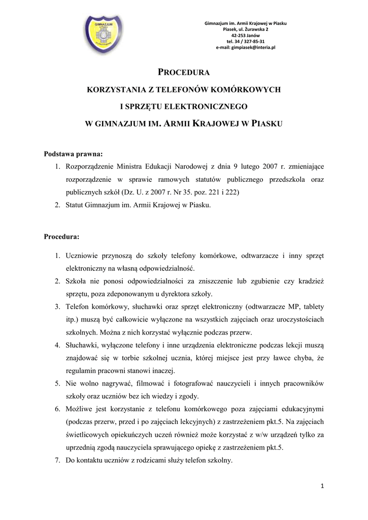 Gimnazjum im. Armii Krajowej w Piasku Piasek, ul. Żurawska 2 42-253 Janów tel. 34 / 327-85-31 e-mail: [email protected] PROCEDURA KORZYSTANIA Z TELEFONÓW KOMÓRKOWYCH I SPRZĘTU ELEKTRONICZNEGO W GIMNAZJUM IM. ARMII KRAJOWEJ W PIASKU Podstawa prawna: 1. Rozporządzenie Ministra Edukacji Narodowej z dnia 9 lutego 2007 r. zmieniające rozporządzenie w sprawie ramowych statutów publicznego przedszkola oraz publicznych szkół (Dz. U. z 2007 r. Nr 35. poz. 221 i 222) 2. Statut Gimnazjum im. Armii Krajowej w Piasku. Procedura: 1. Uczniowie przynoszą do szkoły telefony komórkowe, odtwarzacze i inny sprzęt elektroniczny na własną odpowiedzialność. 2. Szkoła nie ponosi odpowiedzialności za zniszczenie lub zgubienie czy kradzież sprzętu, poza zdeponowanym u dyrektora szkoły. 3. Telefon komórkowy, słuchawki oraz sprzęt elektroniczny (odtwarzacze MP, tablety itp.) muszą być całkowicie wyłączone na wszystkich zajęciach oraz uroczystościach szkolnych. Można z nich korzystać wyłącznie podczas przerw. 4. Słuchawki, wyłączone telefony i inne urządzenia elektroniczne podczas lekcji muszą znajdować się w torbie szkolnej ucznia, której miejsce jest przy ławce chyba, że regulamin pracowni stanowi inaczej. 5. Nie wolno nagrywać, filmować i fotografować nauczycieli i innych pracowników szkoły oraz uczniów bez ich wiedzy i zgody. 6. Możliwe jest korzystanie z telefonu komórkowego poza zajęciami edukacyjnymi (podczas przerw, przed i po zajęciach lekcyjnych) z zastrzeżeniem pkt.5. Na zajęciach świetlicowych opiekuńczych uczeń również może korzystać z w/w urządzeń tylko za uprzednią zgodą nauczyciela sprawującego opiekę z zastrzeżeniem pkt.5. 7. Do kontaktu uczniów z rodzicami służy telefon szkolny. 1 Gimnazjum im. Armii Krajowej w Piasku Piasek, ul. Żurawska 2 42-253 Janów tel. 34 / 327-85-31 e-mail: [email protected] 8. W szczególnych przypadkach na prośbę ucznia nauczyciel może wyrazić zgodę, by uczeń skorzystał z własnego telefonu i zadzwonił do rodziców (opiekunów prawnych). 9. W przypadku naruszenia powyższych ustaleń nauczyciel ma obowiązek odebrania telefonu, a następnie zdeponowania zabranego od ucznia urządzenia u dyrektora szkoły. Zdeponowanie winno być w obecności ucznia, po uprzednim wyłączeniu telefonu. 10. Po odbiór telefonu zgłaszają się rodzice lub prawni opiekunowie ucznia. Zostają oni zapoznani z sytuacją i pouczeni o konsekwencjach (w tym konsekwencjach prawnych związanych z naruszeniem prywatności pracowników szkoły). 11. W przypadku, kiedy uczeń odmawia oddania telefonu lub innego urządzenia, nauczyciel lub wychowawca przekazuje informację dyrektorowi szkoły. Wychowawca udziela uczniowi pisemnej nagany i zawiadamia o tym fakcie rodziców (opiekunów prawnych). 12. W przypadku łamania powyższych zasad uczeń otrzymuje punkty ujemne z zachowania zgodnie ze Statutem. 13. Wszelkie objawy permanentnego łamania zasad współżycia społecznego w szkole mogą być traktowane jako przejaw demoralizacji i skutkować skierowaniem sprawy do sądu rodzinnego. 14. Nauczyciel wychowawca ma obowiązek zapoznać wszystkich uczniów z powyższym regulaminem, co uczniowie potwierdzają podpisem w zeszycie klasowym. 2