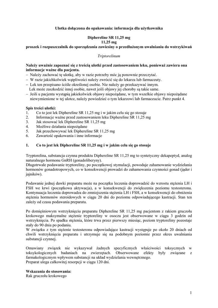 Ulotka dołączona do opakowania: informacja dla użytkownika Diphereline SR 11,25 mg 11,25 mg proszek i rozpuszczalnik do sporządzania zawiesiny o przedłużonym uwalnianiu do wstrzykiwań Triptorelinum Należy uważnie zapoznać się z treścią ulotki przed zastosowaniem leku, ponieważ zawiera ona informacje ważne dla pacjenta. − Należy zachować tę ulotkę, aby w razie potrzeby móc ją ponownie przeczytać. − W razie jakichkolwiek wątpliwości należy zwrócić się do lekarza lub farmaceuty. − Lek ten przepisano ściśle określonej osobie. Nie należy go przekazywać innym. Lek może zaszkodzić innej osobie, nawet jeśli objawy jej choroby są takie same. − Jeśli u pacjenta wystąpią jakiekolwiek objawy niepożądane, w tym wszelkie objawy niepożądane niewymienione w tej ulotce, należy powiedzieć o tym lekarzowi lub farmaceucie. Patrz punkt 4. Spis treści ulotki: 1. Co to jest lek Diphereline SR 11,25 mg i w jakim celu się go stosuje 2. Informacje ważne przed zastosowaniem leku Diphereline SR 11,25 mg 3. Jak stosować lek Diphereline SR 11,25 mg 4. Możliwe działania niepożądane 5. Jak przechowywać lek Diphereline SR 11,25 mg 6. Zawartość opakowania i inne informacje 1. Co to jest lek Diphereline SR 11,25 mg i w jakim celu się go stosuje Tryptorelina, substancja czynna produktu Diphereline SR 11,25 mg to syntetyczny dekapeptyd, analog naturalnego hormonu GnRH (gonadoliberyny). Długotrwałe podawanie tryptoreliny, po początkowej stymulacji, powoduje zahamowanie wydzielania hormonów gonadotropowych, co w konsekwencji prowadzi do zahamowania czynności gonad (jąder i jajników). Podawanie jednej dawki preparatu może na początku leczenia doprowadzić do wzrostu stężenia LH i FSH we krwi (początkowa aktywacja), a w konsekwencji do zwiększenia poziomu testosteronu. Kontynuacja leczenia doprowadza do zmniejszenia stężenia LH i FSH, a w konsekwencji do obniżenia stężenia hormonów steroidowych w ciągu 20 dni do poziomu odpowiadającego kastracji. Stan ten zależy od czasu podawania preparatu. Po domięśniowym wstrzyknięciu preparatu Diphereline SR 11,25 mg pacjentom z rakiem gruczołu krokowego maksymalne stężenie tryptoreliny w osoczu jest obserwowane w ciągu 3 godzin od wstrzyknięcia. Po spadku stężenia, które trwa przez pierwszy miesiąc, poziom tryptoreliny pozostaje stały do 90 dnia po podaniu. W związku z tym stężenie testosteronu odpowiadające kastracji występuje po około 20 dniach od chwili wstrzyknięcia preparatu i utrzymuje się na podobnym poziomie przez okres uwalniania substancji czynnej. Omawiany związek nie wykazywał żadnych specyficznych właściwości toksycznych w toksykologicznych badaniach na zwierzętach. Obserwowane efekty były związane z farmakologicznym wpływem substancji na układ wydzielania wewnętrznego. Preparat ulega całkowitej resorpcji w ciągu 120 dni. Wskazania do stosowania: Rak gruczołu krokowego 1 Leczenie raka gruczołu krokowego kiedy wymagane jest obniżenie stężenia testosteronu do stężenia charakterystycznego dla braku czynności gruczołów płciowych (stężenia kastracyjnego). Pacjenci, którzy nie byli poddawani terapii hormonalnej, lepiej reagują na leczenie tryptoreliną. U dzieci lek Diphereline SR 11,25 mg jest stosowany w leczeniu dojrzewania płciowego, które pojawia się w bardzo wczesnym wieku (przedwczesne dojrzewanie płciowe). 2. Informacje ważne przed zastosowaniem leku Diphereline SR 11,25 mg Kiedy nie stosować leku Diphereline SR 11,25 mg − jeśli pacjent ma uczulenie na tryptorelinę, gonadoliberynę (GnRH), inne analogi GnRH lub którykolwiek z pozostałych składników leku Diphereline SR 11,25 mg − jesli pacjentka jest w ciąży lub karmi piersią Ostrzeżenia i środki ostrożności Istnieją doniesienia o występowaniu depresji u pacjentów przyjmujących lek Diphereline SR 11,25 mg, w tym przypadków ciężkiej depresji. Jeśli w trakcie przyjmowania leku Diphereline SR 11,25 mg wystąpią nastroje depresyjne, należy poinformować o tym lekarza. Mężczyźni W przypadku stosowania leków zapobiegających krzepnięciu krwi, w miejscu iniekcji może wystąpić zasinienie. Na początku leczenia obserwowano zwiększone stężenie testosteronu w organizmie. Może to spowodować nasilenie objawów, związanych z nowotworem. W takim przypadku należy skontaktować się z lekarzem. Lekarz może zalecić dodatkowy lek (antyandrogen), aby zapobiec nasileniu tych objawów. W pierwszych tygodniach leczenia lek Diphereline SR 11,25 mg, podobnie jak inne analogi GnRH, w izolowanych przypadkach może powodować ucisk (kompresję) rdzenia kręgowego lub blokadę cewki moczowej (drogi, którą wydalany jest mocz). Jeżeli takie objawy wystąpią, pacjent będzie kontrolowany przez lekarza i otrzyma stosowne leczenie. Tryptorelina nie indukuje dalszego zmniejszenia stężenia testosteronu u pacjentów po orchidektomii (wycięcie jądra). Wyniki testów diagnostycznych funkcji osi przysadkowo-gonadalnej, wykonywanie w czasie leczenia lub po zaprzestaniu terapii lekiem Diphereline SR 11,25 mg mogą być mylące. Jeżeli lek Diphereline SR 11,25 mg lub inne analogi GnRH są stosowane przez długi okres czasu u dorosłych, może wzrastać ryzyko ubytku masy kostnej lub osłabienia kości, szczególnie w przypadku osób nadużywających alkoholu, palących papierosy, z dodatnim wywiadem rodzinnym w kierunku osteoporozy (schorzenie, które wpływa na wytrzymałość kości), niedożywionych lub stosujących leki przeciwdrgawkowe (w leczeniu padaczki lub napadów drgawek) lub kortykosteroidy (steroidy). W przypadku wystąpienia niepokojących objawów ze strony kości, w tym objawów sugerujących osteoporozę, należy powiedzieć o tym lekarzowi. Może to wpłynąć na sposób leczenia, stosowany przez lekarza. Należy powiedzieć lekarzowi o cukrzycy, chorobach serca. W przypadku powiększenia (łagodnego guza) przysadki mózgowej, gdy pacjent nie jest tego świ