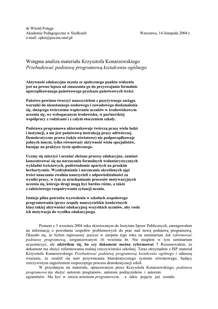 dr Witold Potęga Akademia Pedagogiczna w Siedlcach e-mail: [email protected] Warszawa, 14 listopada 2004 r. Wstępna analiza materiału Krzysztofa Konarzewskiego Przebudować podstawę programową kształcenia ogólnego Aktywność edukacyjna ucznia ze społecznego punktu widzenia jest na pewno lepsza od zmuszania go do przyswajania formalnie uporządkowanego państwowego przekazu państwowych treści. Państwo powinno tworzyć nauczycielom z pozytywnego zaciągu warunki do nieustannego osobowego i zawodowego doskonalenia się, służącego twórczemu wspieraniu uczniów w środowiskowym uczeniu się, we wzbogacanym środowisku, w partnerskiej współpracy z rodzicami i z całym otoczeniem szkoły. Podstawa programowa ukierunkowuje twórczą pracę wielu ludzi i instytucji, a nie jest państwową instrukcją pracy odtwórczej. Demokratyczne prawo (także oświatowe) nie podporządkowuje jednych innym, tylko równoważy aktywność wielu specjalistów, bazując na praktyce życia społecznego. Uczmy się mierzyć i oceniać złożone procesy edukacyjne, zamiast koncentrować się na narzucaniu formalnych woluntarystycznych wykładni treściowych, podświadomie opartych na pruskim herbartyzmie. Wyodrębnianie i narzucanie określonych ujęć treści nauczania zwalnia nauczycieli z odpowiedzialności za wyniki pracy, w tym za uruchamianie procesów motywacyjnych uczenia się, którego drogi mogą być bardzo różne, a także z całościowego rozpatrywania sytuacji ucznia. Istnieje pilna potrzeba wyzwolenia w szkołach zespołowego programowania (przez zespoły nauczycielskie konkretnych klas) takiej aktywności edukacyjnej wszystkich uczniów, aby rosła ich motywacja do wysiłku edukacyjnego Pismem z 3 września 2004 roku skierowanym do Instytutu Spraw Publicznych, zareagowałem na informację o powołaniu zespołów problemowych do prac nad nową podstawą programową. Okazało się, że byłem zaproszony jeszcze w sierpniu tego roku na seminarium Jak reformować podstawę programową, zorganizowanym 16 września br. Nie mogłem w tym seminarium uczestniczyć, ale zdziwiłem się, bo czy dokument można reformować ? Rozumowałem, że dokument ma służyć reformowaniu realnej rzeczywistości szkolnej. Teraz otrzymałem z ISP materiał Krzysztofa Konarzewskiego Przebudować podstawę programową kształcenia ogólnego i odnoszę wrażenie, że zrodził się nurt przywracania biurokratycznego systemu oświatowego, będący rzeczywistym zagrożeniem rozpoczętego procesu demokratyzacji szkół. W przysłanym mi materiale, opracowanym przez Krzysztofa Konarzewskiego, podstawa programowa ma służyć autorom programów, autorom podręczników i autorom egzaminów. Ma być w istocie minimum programowym, a takie pojęcie już zostało skompromitowane. Nie znajdujemy wprawdzie informacji o przesłankach tworzenia owego minimum, ale faktyczną przesłanką jest wykładnia kształcenia materialnego, postpeerelowskiego (przyswajania wiadomości, zapamiętywania podręcznikowych analiz, wyrabiania postaw). Są centralistyczne nawroty w polityce państwowej Rosji, Białorusi i innych państw postkomunistycznych, a Krzysztof Konarzewski proponuje nawrót w wykładni urzędowej polskiej polityki oświatowej, łącznie z powołaniem strażników państwowego programu nauczania. Wielce zasłużony dla polskiej demokracji Lech Wałęsa, gdy doszedł do władzy, chciał rządzić dekretami. Społeczeństwo jednak odrzuciło ten wariant rozwoju, gdyż utrwalają się metody stosowanych regulacji międzyludzkich i dlatego żaden cel nie usprawiedliwia niedemokratycznych metod postępowania. Będą prawdopodobnie odrzucone niedemokratyczne nawroty w oświacie, bo Polska osadza się w demokratycznej Europie, ale chyba szkoda czasu na przepychanie przestarzałych rozstrzygnięć (minimów programowych i ich strażników) ? Gorszym wariantem jest przepisywanie do szkolnych dokumentów sztywnych zaleceń i robienie swego. Jedyne zdanie z dostarczonego materiału podmiotowo traktujące ucznia wspomaganie wszechstronnego i harmonijnego rozwoju ucznia autor Przebudowy…nazywa hasłem ideologicznym i zabrania umieszczania na liście celów szkolnych. O szkołach nic w tym dokumencie nie ma. Wiadomo tylko, że nauczyciel ma być zniewolony minimum programowym, formalnie nazwanym podstawą programową. Uczniowie, nauczyciele, szkoły, rodzice… mają być podstawie programowej (ręcznemu sterowaniu) podporządkowani. Jest natomiast propozycja wpisania zagadkowej misji szkoły. Jest też zapowiedź powrotu do wykładów. Czy w zerówce także ? Upominam się o trójpodmiotowość szkoły i nie zniewalanie jej, bo jesteśmy dopiero na początku drogi budowania się społeczeństwa obywatelskiego. Gdy w PRL – u krytykowano nauczyciela, to on obwiniał program nauczania i kończyły się możliwości naprawy pracy. Od czasów Jana Amosa Komeńskiego kiełkowało w świadomości społecznej rozumowanie, że szkoła jest dla wszystkich, choć ogólna to zróżnicowana, bo uczniowie i nauczyciele są różni. Jan Jakub Rousseau taką szkołę, jaką projektuje pan Krzysztof Konarzewski na tyle skutecznie zwalczał, że znaleźli się wybitni kontynuatorzy pracy nad efektywniejszą pedagogiką praktyczną, właśnie wspierający naturalny rozwój jednostek w ramach autonomicznej szkoły, której państwo przynajmniej nie powinno przeszkadzać. W Europie faszyści w XX wieku palili książki Marii Montessori, pedagoga skutecznie pomagającego dzieciom w uczeniu się przez wycofanie się nauczyciela z dyrygowania ich aktywnością. Wraz z paleniem przez faszystów tekstów wolnościowych propozycji pedagogicznych, nastąpił nawrót do centralnego ręcznego sterowania, jedynie słusznego oczywiście. Narzucane treści nauczania znów stały się ważniejsze od wspierania uczniów. Powszechnie w świecie znany i szanowany dorobek Marii Montessori nie powstałby, gdyby dokumenty oświatowe na początku XX wieku tworzył we W