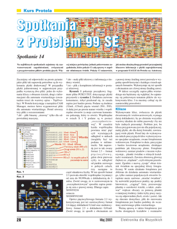 Kurs Protela Spotkania z Protelem 99 SE Spotkanie 14 Na najbliższych spotkaniach zajmiemy się zaa− wansowanymi zagadnieniami, związanymi z przygotowaniem plików produkcyjnych. Wię− cej miejsca poświęcimy jednak pokrewnemu za− gadnieniu, które pokaże Ci całą sprawę w zupeł− nie odmiennym świetle. Pokażę Ci mianowicie, jak można okrężną drogą przenieść przynajmniej kluczowe informacje z płytki zaprojektowanej w programie EAGLE do Protela czy Autotraxa. Zacznijmy od odpowiedzi na proste pytanie: jakie pliki tak naprawdę potrzebne są do wy− konania płytki drukowanej? W przypadku płytki jednostronnej w najprostszym przy− padku wystarczą dwa pliki: jeden do wyko− nania kliszy z obrazem ścieżek, drugi z infor− macjami dla automatu wiertarskiego (ewen− tualnie trzeci do warstwy opisu – TopOver− lay). W Protelu korzystając z narzędzia CAM Manager, możesz łatwo wygenerować pliki dla automatu wiertarskiego. Protel utworzy trzy pliki z rozszerzeniami: *.drl – plik binarny „strawny” tylko dla od− powiedniej maszyny, *.drr – mały plik tekstowy z informacją o śre− dnicy wierteł, *.txt – plik z kompletem informacji w posta− ci tekstowej. Rysunek 1 pokazuje początkowy frag− ment pliku PCB23.TXT, dotyczącego płytki przystawki z rysunku 2. Dodałem czerwone komentarze, żebyś przekonał się, że zasada zapisu jest bardzo prosta. Podane są średnice (32mil...125mil) pięciu wierteł (T01...T05). A dalej jest po prostu numer wiertła i współ− rzędne otworów (a moje czerwone komenta− rze pokazują, który to otwór). Współrzędne w osiach X i Y podane są w postaci „oszczędnościo− wej”. W zasadzie każda współrzędna powinna mieć pięć cyfr wyrażających odległość w milsach (mogłaby być też podana w milime− trach). Tak napraw− dę jest to tak zwany format 2.3 – format p i ę c i o c y f r o w y, gdzie dwie pierwsze cyfry to odległość od punktu zerowego w pełnych calach, trzy następne to część ułamkowa liczby. W ten sposób format 2.3 pozwala określić współrzędne (wymiary) od zera do 99,999cala z dokładnością do 1 milsa. Zwróć uwagę, że w zastosowanym tu „oszczędnościowym” sposobie zapisu pomi− ja się zera z prawej strony. Dlatego zapis: X036Y0216 oznacza X02600Y02160 Oprócz pięciocyfrowego formatu 2.3 wy− korzystywany jest też sześciocyfrowy format 2.4 dający dokładność 0,1mil oraz siedmiocy− frowy format 2.5 o dokładności 0,01mil. Zwróć uwagę, że sposób z obcinaniem zer z prawej strony (trailing zeros) pozwala w wy− godny sposób korzystać z każdego z trzech opi− sanych formatów. Wykorzystuje się też sposób z obcinaniem zer z lewej strony (leading zeros). W dalsze szczegóły zapisu pliku wiertar− skiego nie będziemy się wgłębiać, bo zajmie− my się pokrewnym tematem plików do wy− konywania klisz. I tu musimy cofnąć się do zamierzchłej przeszłości. Rys. 1 Rys. 2 28 Klisze Wykonywanie klisz, zwłaszcza do płytek dwustronnych i wielowarstwowych, wymaga dużej dokładności, by po złożeniu wszystkie warstwy idealnie do siebie pasowały i by nie było żadnych przesunięć. Problem jest, bo klisza przygotowana jest nie dla pojedynczej, małej płytki, ale dla dużej formatki, zawiera− jącej wiele płytek. Przed laty do wykonywa− nia takich precyzyjnych klisz wykorzystywa− no specjalne urządzenie, zwane fotoploterem wektorowym. Fotoploter to duże, precyzyjne i bardzo kosztowne urządzenie, działające podobnie jak klasyczny ploter. Fotoploter wektorowy zamiast pisaków z tuszem wyko− rzystuje... plamki świetlne o różnych kształ− tach i rozmiarach. Zawiera obrotową głowicę (bęben) ze „slajdami”, czyli różnymi przesło− nami. Zgodnie z nazwą „rysuje” obraz ście− żek światłem na specjalnej kliszy fotogra− ficznej. W sumie działanie fotoplotera jest zbliżone do działania automatu wiertarskie− go, tylko zamiast pojedynczych otworów fo− toploter może zarówno „strzelać światłem”, by naświetlić pojedyncze punkty, np. punkty lutownicze, „ciągnąć” linie, przesuwając plamkę o szerokości ścieżki, a także „malo− wać” większe obszary za pomocą plamki o mniejszej średnicy (takie tryby pracy nazy− wa się odpowiednio flash, stroke i paint). Jak się słusznie domyślasz, plik do sterowania fotoploterem jest bardzo podobny do wcze− śniej omówionego pliku wiertarskiego. Ważną sprawą w takim fotoploterze jest liczba dostępnych kształtów i rozmiarów Elektronika dla Wszystkich Kurs Protela plamek świetlnych, która wynika z liczby „slajdów” – przesłon na bębnie. Jeśli dostęp− na np. jest okrągła plamka o średnicy 100mil, to można błyskawicznie naświetlić zarówno punkty lutownicze o tej średnicy, jak i tak szerokie ścieżki. Jednak do naświetlenia punktu lub ścieżki o średnicy np. 115mil trzeba wykorzystać inne, mniejsze plamki świetlne i „namalować” je stopniowo. Fotoploter powinien mieć jak najwięcej kształtów i rozmiarów plamek świetlnych, nazywanych aperturami. W praktyce każdy fotoploter działający na opisywanej zasadzie, czyli fotoploter wektorowy, miał liczbę aper− tur ograniczoną do najwyżej kilkudziesięciu. Tym samym program przygotowujący pliki dla fotoplotera musiał inteligentnie dobrać sposób naświetlania, by zlecone zadanie zre− alizować za pomocą apertur dostępnych w konkretnym fotoploterze, z którego korzy− stał wytwórca płytek. Programowi takiemu koniecznie trzeba było podać informacje o aperturach dostępnych w konkretnym foto− ploterze. Nawet popularny, stary Autotrax, czy nawet Easytrax, potrafi stworzyć pliki dla fotoplotera. A informacje o aperturach za− warte są w pliku STANDARD.APT (ew. in− nych z rozszerzeniem .apt). Nie chodzi tu oczywiście o wiertła (ozna− czane T01...), tylko o różne plamki świetlne. Dla Twojej ciekawości podam, ż