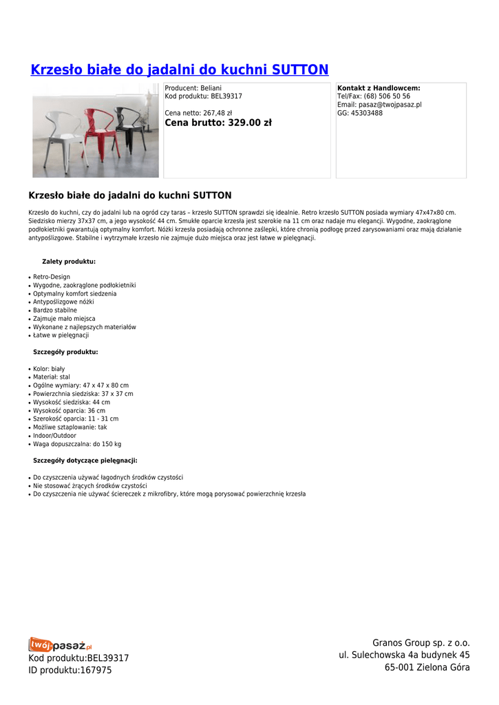 Krzesło białe do jadalni do kuchni SUTTON Producent: Beliani Kod produktu: BEL39317 Cena netto: 267,48 zł Kontakt z Handlowcem: Tel/Fax: (68) 506 50 56 Email: [email protected] GG: 45303488 Cena brutto: 329.00 zł Krzesło białe do jadalni do kuchni SUTTON Krzesło do kuchni, czy do jadalni lub na ogród czy taras – krzesło SUTTON sprawdzi się idealnie. Retro krzesło SUTTON posiada wymiary 47x47x80 cm. Siedzisko mierzy 37x37 cm, a jego wysokość 44 cm. Smukłe oparcie krzesła jest szerokie na 11 cm oraz nadaje mu elegancji. Wygodne, zaokrąglone podłokietniki gwarantują optymalny komfort. Nóżki krzesła posiadają ochronne zaślepki, które chronią podłogę przed zarysowaniami oraz mają działanie antypoślizgowe. Stabilne i wytrzymałe krzesło nie zajmuje dużo miejsca oraz jest łatwe w pielęgnacji. Zalety produktu: ● ● ● ● ● ● ● ● Retro-Design Wygodne, zaokrąglone podłokietniki Optymalny komfort siedzenia Antypoślizgowe nóżki Bardzo stabilne Zajmuje mało miejsca Wykonane z najlepszych materiałów Łatwe w pielęgnacji Szczegóły produktu: ● ● ● ● ● ● ● ● ● ● Kolor: biały Materiał: stal Ogólne wymiary: 47 x 47 x 80 cm Powierzchnia siedziska: 37 x 37 cm Wysokość siedziska: 44 cm Wysokość oparcia: 36 cm Szerokość oparcia: 11 - 31 cm Możliwe sztaplowanie: tak Indoor/Outdoor Waga dopuszczalna: do 150 kg Szczegóły dotyczące pielęgnacji: ● ● ● Do czyszczenia używać łagodnych środków czystości Nie stosować żrących środków czystości Do czyszczenia nie używać ściereczek z mikrofibry, które mogą porysować powierzchnię krzesła Kod produktu:BEL39317 ID produktu:167975 Granos Group sp. z o.o. ul. Sulechowska 4a budynek 45 65-001 Zielona Góra