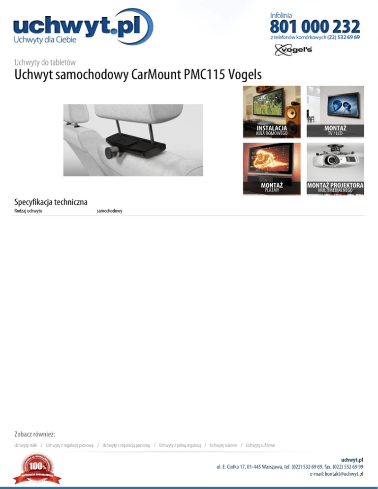 Uchwyty do tabletów Uchwyt samochodowy CarMount PMC115 Vogels INSTALACJA MONTAŻ MONTAŻ MONTAŻ PROJEKTORA KINA DOMOWEGO PLAZMY TV / LCD MULTIMEDIALNEGO Specyfikacja techniczna Rodzaj uchwytu samochodowy Zobacz również: Uchwyty stałe / Uchwyty z regulacją pionową / Uchwyty z regulacją poziomą / Uchwyty z pełną regulacją / Uchwyty ścienne / Uchwyty sufitowe uchwyt.pl ul. E. Ciołka 17, 01-445 Warszawa, tel. (022) 532 69 69, fax. (022) 532 69 99 e-mail: [email protected]
