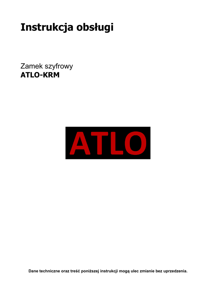Instrukcja obsługi Zamek szyfrowy ATLO-KRM Dane techniczne oraz treść poniższej instrukcji mogą ulec zmianie bez uprzedzenia. Odbiornik zgodny jest z warunkami dyrektywy 89/336/EEC dotyczącej przestrzegania przez kraje członkowskie przepisów zgodności elektromagnetycznej oraz warunkami dyrektyw 73/23/EEC i 93/68/EEC dotyczących przestrzegania przez kraje członkowskie przepisów niskiego napięcia i bezpieczeństwa związanego z obsługą urządzeń elektrycznych. Symbol ten informuje, że danego urządzenia elektrycznego lub elektronicznego, po zakończeniu jego eksploatacji, nie wolno wyrzucać razem z odpadami gospodarczymi. Urządzenie należy przekazać do wyspecjalizowanego punktu zbiórki. Szczegółowe informacje o najbliższym punkcie zbiórki można uzyskać u władz lokalnych. Ponadto produkt można oddać lokalnemu dystrybutorowi podczas zakupu innego urządzenia o podobnych właściwościach. Odpowiednia utylizacja urządzenia pozwala zachować cenne zasoby naturalne i uniknąć negatywnego wpływu na zdrowie i środowisko, które może być zagrożone w przypadku niewłaściwego postępowania z odpadami. 1. Skrócona wersja konfiguracji Wejście do trybu programowania * kod master # domyślny kod MASTER to 999999 Wyjście z trybu programowania * Funkcje dostępne w trybie programowania: Zmiana hasła administratora 0 nowy kod # nowy kod # Dodawanie użytkownika z hasłem PIN 1 numer ID # PIN # numer ID – (identyfikator użytkownika w systemie) numer z zakresu 1...2000 PIN – czterocyfrowe hasło z wyłączeniem zarezerwowanego numeru 1234 Dodawanie użytkownika z kartą RFID 1 odczyt karty # Można dodawać wielu użytkowników po kolei , bez potrzeby wychodzenia z trybu programowania. Usuwanie użytkowników - z hasłem PIN - z kartą RFID 2 2 numer ID # odczyt karty # Otwarcie drzwi za pomocą hasła PIN Wprowadź PIN i zatwierdź # Otwarcie drzwi za pomocą karty RFID Zbliż kartę do czytnika 2. Montaż urządzenia a) Odkręć śrubę (PIN TORX) z dolnej części panelu przedniego b) Zdejmij przedni panel c) Wywierć dwa otwory i za pomocą dwóch kołków zamocuj tylny panel do podłoża d) Podłącz kable urządzenia e) Zamontuj przedni panel i przykręć dolną śrubę 3. Podłączenie Oznaczenie Kolor przewodu Funkcja BELL A różowy Wyjście przycisku dzwonka BELL B różowy Wyjście przycisku dzwonka D0 zielony Magistrala danych D1 biały Magistrala danych ALARM szary Wyjście alarmowe OPEN żółty Podłączenie przycisku otwarcia zamka D_IN brązowy Podłączenie czujnika otwarcia drzwi + 12V czerwony Zasilanie DC 12V GND czarny Masa zasilania NO niebieski Styk NO przekaźnika COM fioletowy Styk wspólny przekaźnika NC pomarańczowy Styk NC przekaźnika UWAGA: Maksymalny prąd przepływający przez styk wyjścia BELL1, BELL2 wynosi 20 mA! 4. Aby przywrócić ustawienia domyślne a) odłącz zasilanie urządzenia b) naciśnij i przytrzymaj #, następnie podłącz zasilanie c) Po usłyszeniu dwóch krótkich sygnałów można puścić przycisk #. System przywrócił ustawienia domyślne. Funkcja ta resetuje kod MASTER oraz inne opcje do wartości domyślnych, pozostawiając w pamięci wszystkich zapisanych użytkowników. 5. Alarm antywłamaniowy Urządzenie używa fotorezystora jako alarmu antywłamaniowego. Jeśli klawiatura urządzenia została usunięta, alarm załączy się. 6. Sygnały świetlne i dźwiękowe Operacja LED czerwona LED zielona Włączenie - - pulsuje - Użycie klawiatury - - Operacja poprawna - świeci Operacja niepoprawna - - Wejście w tryb programowania świeci - Wyjście z trybu programowania - - świeci - - świeci świeci - Stan bezczynności W trybie programowania Otwarcie drzwi Alarm Dźwięk - - alarm 7. Programowanie 7.1 Ustawienia użytkownika Aby wejść w tryb programowania *kod master# domyślny kod MASTER to 999999 Aby wyjść z trybu programowania * Poniższe instrukcje muszą zostać wywołane po zalogowaniu Aby zmienić kod MASTER Ustawienia trybu pracy: Wejście tylko na kartę wejście na kartę oraz PIN Wejście na kartę lub PIN 0nowy kod#nowy kod# kod master może być 6-, 7- lub 8-cyfrowy. 30# Wejście tylko na kartę 31# Wejście na kartę oraz PIN 32# Wejście na kartę lub PIN (domyślnie) Dodawanie użytkowników w trybie 32# (karta lub PIN) (domyślnie). Aby dodać użytkownika z PINem 1numer ID#PIN#* Numer id może być dowolną liczbą z zakresu 1~2000. PIN może być dowolnymi czterema cyframi z wyłączeniem kombinacji "1234", która jest zarezerwowana. Można dodać wielu użytkowników jednym poleceniem: 1numer ID#PIN#numer ID#PIN#...* Aby usunąć użytkownika z PINem 2numer ID# * Można usunąć wielu użytkowników jednym poleceniem Aby zmienić PIN użytkownika z PINem (To polecenie musi zostać wykonane poza trybem programowania) *numer ID#stary PIN#nowy PIN#nowy PIN# Aby dodać użytkownika z kartą (metoda 1) Najszybsza metoda dodania karty, automatycznie generująca numer id. 1odczyt karty# można dodać wiele kart jednym poleceniem Aby dodać użytkownika z kartą (metoda 2) Alternatywna metoda dodawania użytkownika z kartą, z ręcznym wprowadzeniem numeru id. Jeden numer id może zostać przypisany do jednej karty. 1numer ID#odczyt karty# aby dodać wiele kart jednym poleceniem należy przed każdym nowym numer ID wcisnąć klawisz 1 Aby dodać użytkownika z kartą (metoda 3) Numer karty to ostatnie 8 cyfr wydrukowanych na karcie. Autogeneracja numeru id. 1numer karty# * można dodać wiele kart jednym poleceniem Aby dodać użytkownika z kartą (metoda 4) Ręcznie podawany numer id i numer karty 1numer ID#numer karty# można dodać wiele kart jednym poleceniem Aby usunąć użytkownika z kartą poprzez kartę. 2odczyt karty# można usunąć wielu użytkowników jednym poleceniem Aby usunąć użytkownika z kartą poprzez numer ID Ta opcja może zostać wykorzystana, jeśli użytkownik zgubił kartę. 2numer ID#* można usunąć wielu użytkowników jednym poleceniem Aby usunąć u