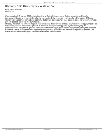 Publiczna Szkoła Podstawowa nr 19 w Kędzierzynie-Koźlu Obchody Dnia Dziewczynek w klasie 3a Autor: Maria Matusiak 10.03.2015. W poniedziałek 9 marca 2015r. świętowaliśmy Dzień Dziewczynek. Dzięki staraniom chłopców dziewczynki bardo przyjemnie bawiły się tego dnia. Były życzenia i miłe gesty od kolegów. Chłopcy namalowali wcześniej portrety koleżanek. Zadaniem dziewczynek było odgadnięcie, na którym portrecie jest ich postać. Zadanie nie było łatwe... Chłopcy dokonali też wyboru najsympatyczniejszej dziewczynki z klasy. Wyrażali oni swoją sympatię do koleżanek poprzez oddawanie głosów w ankiecie przygotowanej przez wychowawczynię. Po podsumowaniu wszystkich głosów konkurs został rozstrzygnięty i miano najsympatyczniejszej zdobyła Marlenka Daniel. Otrzymała ona dyplom pamiątkowy i gratulacje od swoich kolegów i koleżanek. Na koniec wszystkie dziewczynki zostały obdarowane słodkościami. http://sp19kkozle.wodip.opole.pl Kreator PDF Utworzono 6 March, 2017, 21:50