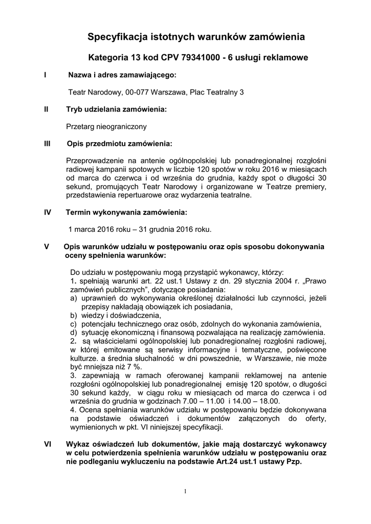 Specyfikacja istotnych warunków zamówienia Kategoria 13 kod CPV 79341000 - 6 usługi reklamowe I Nazwa i adres zamawiającego: Teatr Narodowy, 00-077 Warszawa, Plac Teatralny 3 II Tryb udzielania zamówienia: Przetarg nieograniczony III Opis przedmiotu zamówienia: Przeprowadzenie na antenie ogólnopolskiej lub ponadregionalnej rozgłośni radiowej kampanii spotowych w liczbie 120 spotów w roku 2016 w miesiącach od marca do czerwca i od września do grudnia, każdy spot o długości 30 sekund, promujących Teatr Narodowy i organizowane w Teatrze premiery, przedstawienia repertuarowe oraz wydarzenia teatralne. IV Termin wykonywania zamówienia: 1 marca 2016 roku – 31 grudnia 2016 roku. V Opis warunków udziału w postępowaniu oraz opis sposobu dokonywania oceny spełnienia warunków: Do udziału w postępowaniu mogą przystąpić wykonawcy, którzy: 1. spełniają warunki art. 22 ust.1 Ustawy z dn. 29 stycznia 2004 r. „Prawo zamówień publicznych”, dotyczące posiadania: a) uprawnień do wykonywania określonej działalności lub czynności, jeżeli przepisy nakładają obowiązek ich posiadania, b) wiedzy i doświadczenia, c) potencjału technicznego oraz osób, zdolnych do wykonania zamówienia, d) sytuację ekonomiczną i finansową pozwalająca na realizację zamówienia. 2. są właścicielami ogólnopolskiej lub ponadregionalnej rozgłośni radiowej, w której emitowane są serwisy informacyjne i tematyczne, poświęcone kulturze. a średnia słuchalność w dni powszednie, w Warszawie, nie może być mniejsza niż 7 %. 3. zapewniają w ramach oferowanej kampanii reklamowej na antenie rozgłośni ogólnopolskiej lub ponadregionalnej emisję 120 spotów, o długości 30 sekund każdy, w ciągu roku w miesiącach od marca do czerwca i od września do grudnia w godzinach 7.00 – 11.00 i 14.00 – 18.00. 4. Ocena spełniania warunków udziału w postępowaniu będzie dokonywana na podstawie oświadczeń i dokumentów załączonych do oferty, wymienionych w pkt. VI niniejszej specyfikacji. VI Wykaz oświadczeń lub dokumentów, jakie mają dostarczyć wykonawcy w celu potwierdzenia spełnienia warunków udziału w postępowaniu oraz nie podleganiu wykluczeniu na podstawie Art.24 ust.1 ustawy Pzp. 1 1. Na potwierdzenie spełnienia warunków określonych w art. 22 ust. 1 pkt. od a) do d), Wykonawca złoży oświadczenie o spełnianiu warunków udziału w postępowaniu (pkt. V.1. SIWZ). 2. W zakresie potwierdzenia niepodlegania wykluczeniu na podstawie art.24 ust. 1 ustawy, należy przedłożyć: a) oświadczenie o braku podstaw do wykluczenia. b) Aktualny odpis z właściwego rejestru lub z centralnej ewidencji i informacji o działalności gospodarczej, jeżeli odrębne przepisy wymagają wpisu do rejestru, w celu wykazania braku podstaw do wykluczenia w oparciu o art. 24 ust.1 pkt. 2 ustawy Pzp, wystawiony nie wcześniej niż 6 miesięcy przed upływem terminu składania ofert. c) Aktualne zaświadczenie właściwego naczelnika urzędu skarbowego potwierdzające, że Wykonawca nie zalega z opłacaniem podatków lub zaświadczenie, że uzyskał przewidziane prawem zwolnienie, odroczenie lub rozłożenie na raty zaległych płatności lub wstrzymanie w całości wykonania decyzji właściwego organu – wystawione nie wcześniej niż 3 miesiące przed upływem terminu składania ofert. d) Aktualne zaświadczenie właściwego oddziału Zakładu Ubezpieczeń Społecznych lub Kasy Rolniczego Ubezpieczenia Społecznego potwierdzającego, że Wykonawca nie zalega z opłacaniem składek na ubezpieczenie zdrowotne i społeczne lub potwierdzenie, że uzyskał przewidziane prawem zwolnienie, odroczenie lub rozłożenie na raty zaległych płatności lub wstrzymanie w całości wykonania decyzji właściwego organu – wystawione nie wcześniej niż 3 miesiące przed upływem terminu składania ofert. 3. Do oferty wykonawca załączy listę podmiotów należących do tej samej grupy kapitałowej w rozumieniu ustawy z dnia 16 lutego 2007 r. o ochronie konkurencji i konsumentów, albo informację o tym, że nie należy do grupy kapitałowej. 4. Inne dokumenty: 1) zobowiązanie do zawarcia umowy na warunkach określonych w niniejszej specyfikacji. 2) na potwierdzenie, że Wykonawca spełnia warunki wymienione w pkt. V.2 i V.3 SIWZ , należy załączyć do oferty: a) oświadczenie, że Wykonawca jest właścicielem ogólnopolskiej lub ponadregionalnej rozgłośni radiowej i dysponuje na jej antenie pasmem reklamowym, umożliwiającym prowadzenie kampanii spotowej poświęconej kulturze. b) aktualne (z ostatnich sześciu miesięcy) i wiarygodne badania rynkowe, przedstawiające średni poziom słuchalności w Warszawie. c) oświadczenie o dysponowaniu czasem antenowym w terminie od 1 marca 2016 do 31 czerwca 2016 oraz od 1 września 2016 do 31 grudnia 2016, przeznaczonym na reklamę spotową poświęconą kulturze, w godzinach 7.00 – 11.00 i 14.00 – 18.00. 2 VII Informacja na temat wadium: nie dotyczy VIII Informacja o sposobie porozumiewania się zamawiającego z wykonawcami oraz przekazywania oświadczeń i dokumentów, a także wskazanie osób uprawnionych do porozumiewania się z wykonawcami 1. Wszystkie oświadczenia, wnioski, zawiadomienia, dokumenty oraz informacje Zamawiający i Wykonawca przekazują faksem na numer (0 22) 69 20 741 lub drogą elektroniczną z zachowaniem postanowień art. 27 ust. 2 ustawy Prawo zamówień publicznych. 2. Osobą upoważnioną ze strony Zamawiającego do porozumiewania się z Wykonawcami jest Hanna Zoll (tel: 22 69 20 663). Zapytania, dotyczące treści specyfikacji należy kierować pisemnie drogą elektroniczną do Hanny Zoll ([email protected]), wyłącznie w dni powszednie w godzinach od 9.00 do 16.00 lub faksem (nr faksu: 22 69 20 741). IX Termin związania ofertą: Przystępujący do przetargu związani będą ofertą przez okres 30 dni; bieg terminu rozpoczyna się wraz z upływem terminu składania ofert. X Opis sposobu przygotowywania ofe