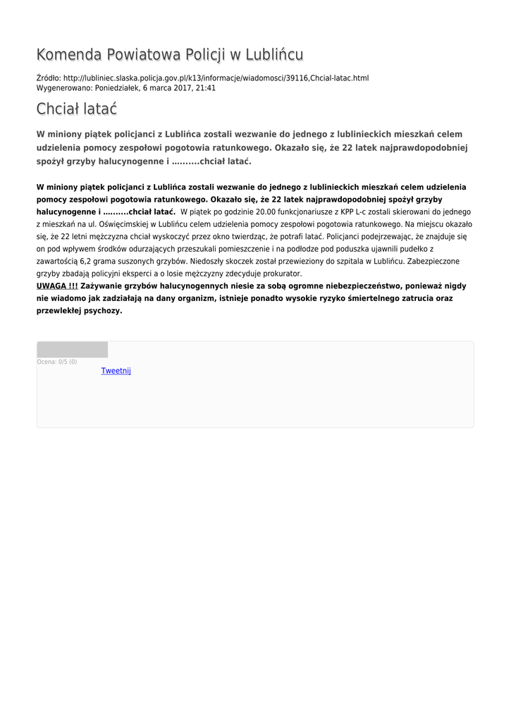 Komenda Powiatowa Policji w Lublińcu Źródło: http://lubliniec.slaska.policja.gov.pl/k13/informacje/wiadomosci/39116,Chcial-latac.html Wygenerowano: Poniedziałek, 6 marca 2017, 21:41 Chciał latać W miniony piątek policjanci z Lublińca zostali wezwanie do jednego z lublinieckich mieszkań celem udzielenia pomocy zespołowi pogotowia ratunkowego. Okazało się, że 22 latek najprawdopodobniej spożył grzyby halucynogenne i ….......chciał latać. W miniony piątek policjanci z Lublińca zostali wezwanie do jednego z lublinieckich mieszkań celem udzielenia pomocy zespołowi pogotowia ratunkowego. Okazało się, że 22 latek najprawdopodobniej spożył grzyby halucynogenne i ….......chciał latać. W piątek po godzinie 20.00 funkcjonariusze z KPP L-c zostali skierowani do jednego z mieszkań na ul. Oświęcimskiej w Lublińcu celem udzielenia pomocy zespołowi pogotowia ratunkowego. Na miejscu okazało się, że 22 letni mężczyzna chciał wyskoczyć przez okno twierdząc, że potrafi latać. Policjanci podejrzewając, że znajduje się on pod wpływem środków odurzających przeszukali pomieszczenie i na podłodze pod poduszka ujawnili pudełko z zawartością 6,2 grama suszonych grzybów. Niedoszły skoczek został przewieziony do szpitala w Lublińcu. Zabezpieczone grzyby zbadają policyjni eksperci a o losie mężczyzny zdecyduje prokurator. UWAGA !!! Zażywanie grzybów halucynogennych niesie za sobą ogromne niebezpieczeństwo, ponieważ nigdy nie wiadomo jak zadziałają na dany organizm, istnieje ponadto wysokie ryzyko śmiertelnego zatrucia oraz przewlekłej psychozy. Ocena: 0/5 (0) Tweetnij