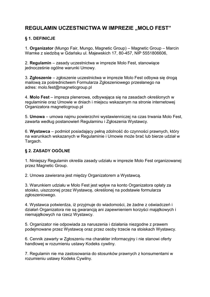 REGULAMIN UCZESTNICTWA W IMPREZIE „MOLO FEST” § 1. DEFINICJE 1. Organizator (Mungo Fair, Mungo, Magnetic Group) – Magnetic Group – Marcin Warnke z siedzibą w Gdańsku ul. Majewskich 17, 80-457, NIP 5551806606, 2. Regulamin – zasady uczestnictwa w imprezie Molo Fest, stanowiące jednocześnie ogólne warunki Umowy. 3. Zgłoszenie – zgłoszenie uczestnictwa w imprezie Molo Fest odbywa się drogą mailową za pośrednictwem Formularza Zgłoszeniowego przesłanego na adres: [email protected] 4. Molo Fest – impreza plenerowa, odbywająca się na zasadach określonych w regulaminie oraz Umowie w dniach i miejscu wskazanym na stronie internetowej Organizatora magneticgroup.pl 5. Umowa – umowa najmu powierzchni wystawienniczej na czas trwania Molo Fest, zawarta według postanowień Regulaminu i Zgłoszenia Wystawcy. 6. Wystawca – podmiot posiadający pełną zdolność do czynności prawnych, który na warunkach wskazanych w Regulaminie i Umowie może brać lub bierze udział w Targach. § 2. ZASADY OGÓLNE 1. Niniejszy Regulamin określa zasady udziału w imprezie Molo Fest organizowanej przez Magnetic Group. 2. Umowa zawierana jest między Organizatorem a Wystawcą. 3. Warunkiem udziału w Molo Fest jest wpływ na konto Organizatora opłaty za stoisko, uiszczonej przez Wystawcę, określonej na podstawie formularza zgłoszeniowego. 4. Wystawca potwierdza, iż przyjmuje do wiadomości, że żadne z oświadczeń i działań Organizatora nie są gwarancją ani zapewnieniem korzyści majątkowych i niemajątkowych na rzecz Wystawcy. 5. Organizator nie odpowiada za naruszenia i działania niezgodne z prawem podejmowane przez Wystawcę oraz przez osoby trzecie na stoiskach Wystawcy. 6. Cennik zawarty w Zgłoszeniu ma charakter informacyjny i nie stanowi oferty handlowej w rozumieniu ustawy Kodeks cywilny. 7. Regulamin nie ma zastosowania do stosunków prawnych z konsumentami w rozumieniu ustawy Kodeks Cywilny. § 3. ZASADY UCZESTNICTWA 1. Warunkiem udziału w Molo Fest jest: - wypełnienie i przesłanie do Organizatora Zgłoszenia w formie elektronicznej, - akceptacja Regulaminu, - opłacenie pełnej kwoty opłaty za stanowisko wynikającej ze Zgłoszenia. 2. Wysłanie Formularza Zgłoszeniowego oznacza akceptację regulaminu oraz złożenie oferty uczestnictwa w Molo Fest. Zawarcie Umowy następuje z chwilą potwierdzenia przyjęcia przez Organizatora Zgłoszenia Wystawcy. 3. Istotne warunki Umowy znajdują się w Zgłoszeniu. W szczególnych przypadkach Organizator zastrzega sobie prawo odrzucenia Zgłoszenia bez podania przyczyny. Wystawcy nie przysługują z tego tytułu roszczenia. O przyjęciu Zgłoszenia Wystawca zostanie poinformowany drogą elektroniczną, na wskazany adres e-mail. 4.Uczestnictwo Wystawcy w Molo Fest może zostać odwołane przez Organizatora w przypadku: - braku wpłaty opłaty za stoisko w terminie do 10 dni od dnia przyjęcia Zgłoszenia, nie później niż do dnia 23 kwietnia 2015 r. - nieprzestrzegania przez Wystawcę przepisów Regulaminu, dobrych obyczajów lub zasad uczciwej konkurencji. W powyższych przypadkach Organizator może: rozwiązać umowę ze skutkiem natychmiastowym z zachowaniem prawa do opłaty, żądać uiszczenia przez Wystawcę wszelkich należności z tytułu uczestnictwa Targach lub żądać odszkodowania. 5. W przypadku rezygnacji Wystawcy z uczestnictwa w Targach w terminie krótszym niż 10 dni przed datą rozpoczęcia, nie przysługuje mu prawo zwrotu wpłaconych kwot. Jeżeli na miejsce Wystawcy nie zostanie zgłoszony inny uczestnik, Organizator może dochodzić całości kwoty należnej za uczestnictwo w Targach, jeżeli nie została uiszczona. 6. Przesyłając Zgłoszenie, Wystawca wyraża zgodę na używanie przez Organizatora logotypu oraz wizerunku firmy dla celów związanych z organizacją Targów. 7. Wystawca oświadcza, że wyraża zgodę na przesłanie drogą elektroniczną faktury z tytułu umowy najmu powierzchni wystawienniczej podczas Targów, wystawionej przez Organizatora zgodnie z obowiązującymi przepisami, w formacie PDF. 8. Organizator zobowiązuje się przesłać fakturę drogą elektroniczną w formacie PDF udostępnioną w sposób gwarantujący autentyczność jej pochodzenia, integralność oraz czytelność treści. Przesłanie faktury w formie elektronicznej wyklucza możliwość jej wysłania w formie papierowej. § 4. REZYGNACJA Z UCZESTNICTWA 1. Wystawca może zrezygnować z uczestnictwa w Molo Fest w terminie nie krótszym niż 10 dni przed dniem ich rozpoczęcia. Wystawca otrzyma wówczas pełny zwrot kwoty wyznaczonej Formularzem Zgłoszeniowym. 2. W przypadku rezygnacji z udziału po tym terminie, Wystawca zostaje obciążony 100% kwoty określonej w Zgłoszeniu. 3. Za termin złożenia rezygnacji z uczestnictwa w Targach przyjmuje się datę otrzymania przez Organizatora stosownego oświadczenia Wystawcy, złożonego drogą mailową na adres [email protected] 4. Za rezygnację z udziału w Molo Fest uważa się również brak zagospodarowania przestrzeni wystawienniczej przez Wystawcę do godziny 11:00 w dniu rozpoczęcia Targów. § 5. ZASADY ORGANIZACYJNE 1. Organizator wyznacza czas dostępu do powierzchni wystawienniczych dla przygotowania stoiska i ekspozycji w programie imprezy targowej. Montaż stoiska nie może odbywać się w godzinach otwarcia Molo Fest dla pozostałych uczestników, w szczególności kupujących. 2. Lokalizacja i przestrzeń wystawiennicza Wystawcy wyznaczane są przez Organizatora. 3. Poprawa lub zmiana ekspozycji oraz inne działania organizacyjne Wystawcy mogą być dokonywane tylko w godzinach, w których impreza jest nieczynna dla innych uczestników i kupujących. 4. Demontaż stoiska nie może zostać rozpoczęty przed godziną zakończenia imprezy, wskazaną w programie imprezy przez Organizatora. 5. W przypadku braku doprowadzenia do stanu pierwotnego powierzchni wystawienniczej po demontażu stoiska, Organizator zleci czynności porządkujące na kos
