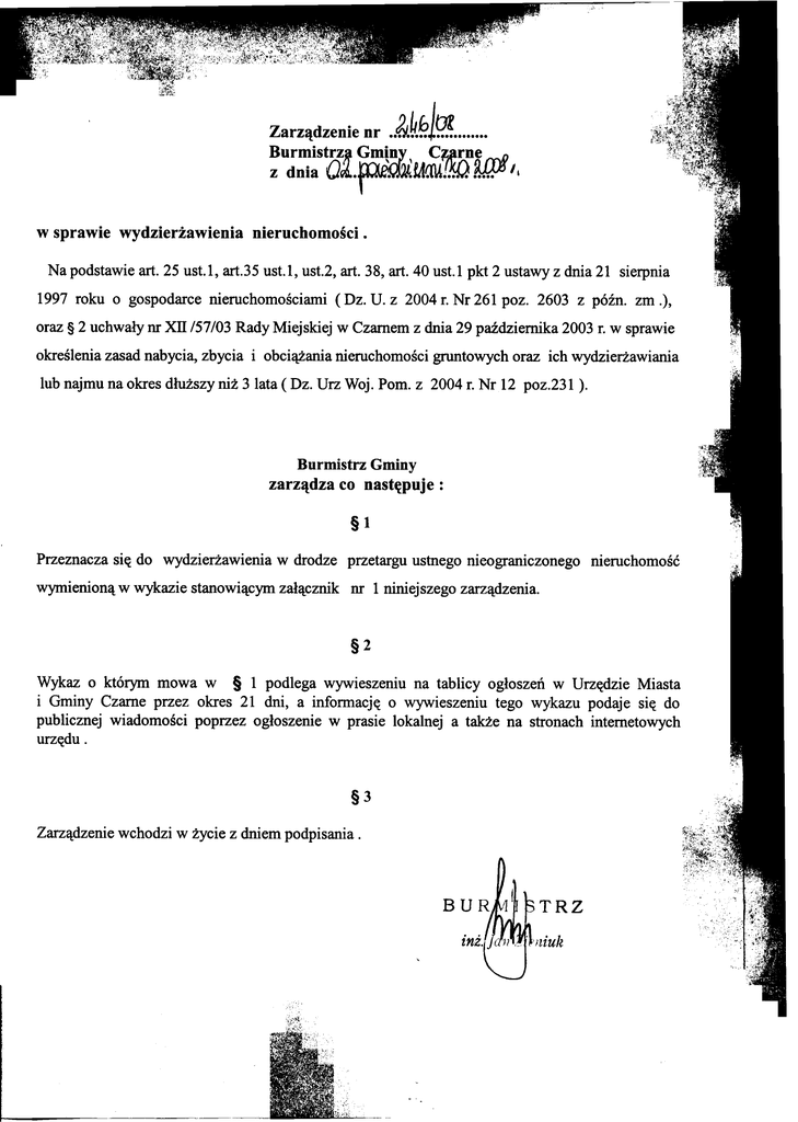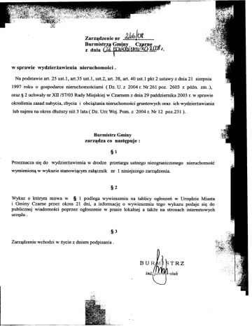 Z d o 9~blm arz¹ zenie nr ooqyo.o.o~oooooooooooo Burmistrz'A ~~ cfc" ~ftt; c~~nW z dnia Q~.rv.:Yo,.?J:L³1aulo~ 0..0. , I Wsprawiewydzier¿awienia nieruchomoœci o Na podstawie art. 25 ust.l, art.35 ust.l, ust.2, art. 38, art. 40 ust.1 pkt 2 ustawy z dnia 21 sierpnia 1997 roku o gospodarce nieruchomoœciami (Dz. U. z 2004 r. Nr 261 poz. 2603 z póŸno zm .), oraz § 2 uchwa³y nr xn /57/03 Rady Miejskiej w Czarnem z dnia 29 paŸdziernika 2003 r. w sprawie okreœleniazasad nabycia, zbycia i obci¹¿ania nieruchomoœcigruntowych oraz ich wydzier¿awiania lub najmu na okres d³u¿szy ni¿ 3 lata ( Dz. Urz Woj. Pornoz 2004 r. Nr 12 poz.231 ). Burmistrz Gminy zarz¹dza co nastêpuje: §1 Przeznacza siê do wydzier¿awienia w drodze przetargu ustnego nieograniczonego nieruchomoœæ wymienion¹ w wykazie stanowi¹cym za³¹cznik nr 1 niniejszego zarz¹dzenia. j §2 Wykaz o którym mowa w § 1 podlega wywieszeniu na tablicy og³oszeñ w Urzêdzie Miasta i Gminy Czarne przez okres 21 dni, a informacjê o wywieszeniu tego wykazu podaje siê do publicznej wiadomoœci poprzez og³oszenie w prasie lokalnej a tak¿e na stronach internetowych urzêdu. §3 Zarz¹dzenie wchodzi w ¿ycie z dniem podpisania. BU in¿ ~i\~~ - TRZ ¿uk Urz¹d Miastai Gminy w Czarne~ woj. pomorskIe Zal. Nr 1 do Zarz¹dzenia Nr&.~~k Bunnistrz~ G~~!1;:t C~e z dnia Og.r~~~ Wykaz Nieruchomoœcigruntowej przeznaczonejdo wydzier¿awieniana okres 5 lat w drodzeprzetargu ustnegonieograniczonego z przeznaczeniem na u¿ytkowaniewarzywniczo-ogrodnicze. m. Czarne ul. Koœcielna. Czêœæ dzia³ki nr 41/4 i 42/36 o ³¹cznej powierzchni 230 mI. Cenawywo³awcza czynszudzier¿awnegorocznegowynosi 69,00 z³ (netto). s³ownie: szeœædziesi¹t dziewiêæz³otych 00/100. Do czynszudzier¿awnegodoliczonybêdzie podatekVAT w wysokoœci22 %. wadium -10,00 z³ s³ownie:dziesiêæz³otych00/100. W studium uwarunkowañi kierunków zagospodarowania Miasta i Gminy Czarne teren niniejszy okreœlonyjest jako podstrefa A7i A8 -otulina historycznegomiasta lokacyjnego od po³udnia i pó³nocnegowschodu. . W rejestrze Gruntów w StarostwaPowiatowegow Cz³uchowie dzia³ka ta figuruje jako teren zurbanizowanyniezabudowanyo symb.Bp. Posiadaurz¹dzon¹ Ksiêgê Wieczyst¹ Nr 815 w S¹dzie Rejonowymw Cz³uchowie-Wydzia³Ksi¹g Wieczystych. Czynszdzier¿awnywnoszonybêdziecoroczniew terminie do 31 marcaka¿degoroku. Czynsz bêdzie waloryzowany corocznie, pocz¹wszy od op³aty za rok 2010 o œrednioroczny wskaŸnikwzrostu cen towarów i us³ugkonsumpcyjnychog³aszanyprzezPrezesaG³ównegoUrzêdu Statystycznego w Monitorze Polskim. Nieruchomoœæ ta bêdzie wydzier¿awionaw drodze przetargu ustnego ograniczonego,którego termin i warunki zostan¹ podane do publicznejwiadomoœciw odrêbnymog³oszeniu.Dodatkowe informacje o w/w nieruchomoœciach mo¿na uzyskaæw Urzêdzie Miasta i Gminy Czarne ( pokój nr 22) ulica Moniuszki 12 tel. 059- 83-32078wew. 26 Niniejszy wykaz wywieszasiê na okres21 dni po up³ywiektórego nast¹pi og³oszenieprzetargu. WYWIeszono. zdjêto BU in¿. RZ 'uk