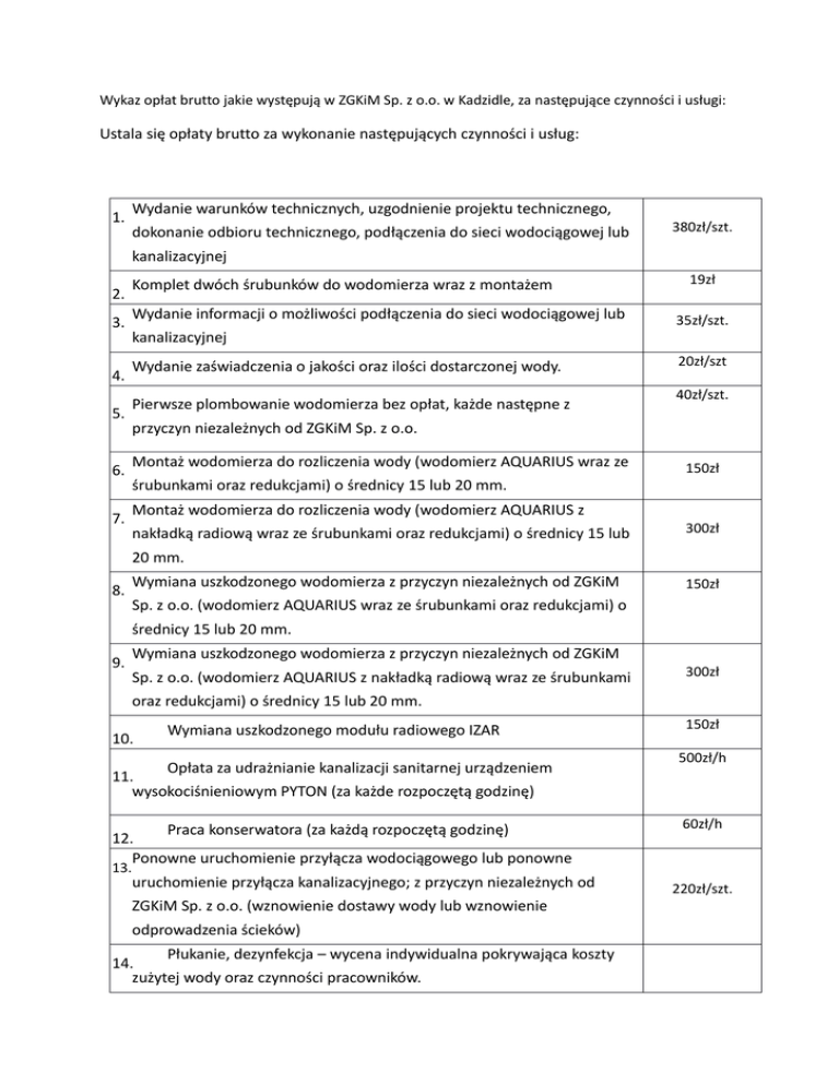 Wykaz opłat brutto jakie występują w ZGKiM Sp. z o.o. w Kadzidle, za następujące czynności i usługi: Ustala się opłaty brutto za wykonanie następujących czynności i usług: 1. Wydanie warunków technicznych, uzgodnienie projektu technicznego, dokonanie odbioru technicznego, podłączenia do sieci wodociągowej lub 380zł/szt. kanalizacyjnej 2. 3. 4. 5. 6. 7. Komplet dwóch śrubunków do wodomierza wraz z montażem Wydanie informacji o możliwości podłączenia do sieci wodociągowej lub 19zł 35zł/szt. kanalizacyjnej Wydanie zaświadczenia o jakości oraz ilości dostarczonej wody. Pierwsze plombowanie wodomierza bez opłat, każde następne z 20zł/szt 40zł/szt. przyczyn niezależnych od ZGKiM Sp. z o.o. Montaż wodomierza do rozliczenia wody (wodomierz AQUARIUS wraz ze 150zł śrubunkami oraz redukcjami) o średnicy 15 lub 20 mm. Montaż wodomierza do rozliczenia wody (wodomierz AQUARIUS z nakładką radiową wraz ze śrubunkami oraz redukcjami) o średnicy 15 lub 300zł 20 mm. 8. Wymiana uszkodzonego wodomierza z przyczyn niezależnych od ZGKiM 150zł Sp. z o.o. (wodomierz AQUARIUS wraz ze śrubunkami oraz redukcjami) o średnicy 15 lub 20 mm. 9. Wymiana uszkodzonego wodomierza z przyczyn niezależnych od ZGKiM Sp. z o.o. (wodomierz AQUARIUS z nakładką radiową wraz ze śrubunkami 300zł oraz redukcjami) o średnicy 15 lub 20 mm. 10. Wymiana uszkodzonego modułu radiowego IZAR Opłata za udrażnianie kanalizacji sanitarnej urządzeniem 150zł 500zł/h 11. wysokociśnieniowym PYTON (za każde rozpoczętą godzinę) Praca konserwatora (za każdą rozpoczętą godzinę) 12. Ponowne uruchomienie przyłącza wodociągowego lub ponowne 13. uruchomienie przyłącza kanalizacyjnego; z przyczyn niezależnych od ZGKiM Sp. z o.o. (wznowienie dostawy wody lub wznowienie odprowadzenia ścieków) Płukanie, dezynfekcja – wycena indywidualna pokrywająca koszty 14. zużytej wody oraz czynności pracowników. 60zł/h 220zł/szt. Opłata za ujawnienie nielegalnego wpięcia do sieci wodociągowej 15. lub kanalizacyjnej ZGKiM Sp. z o.o. 600zł/szt. Wodomierz sucho bieżny przystosowany do pracy z modułem 16. radiowym 50zł/szt. 17.Odbiór odpadów komunalnych z pojemnika 80 litrów 18. 19. 20. 21. 22. 15,12zł/szt Odbiór odpadów komunalnych z pojemnika 120 litrów 18,90zł/szt. Odbiór odpadów komunalnych z pojemnika 1100 litrów 75,60zł/szt. Odbiór odpadów komunalnych /kg 0,35zł/kg Pojemnik na śmieci 80 litrów 73,80zł/szt. Pojemnik na śmieci 120 litrów 84,87zł/szt Wywóz nieczystości płynnych w granicach miejscowości Kadzidło, 23. beczką o pojemności 5000 litrów. 80zł/szt. Wywóz nieczystości płynnych poza granicami miejscowości 24. Kadzidło, beczką o pojemności 5000 litrów. 90zł/szt. Wywóz nieczystości płynnych w granicach miejscowości Kadzidło, 25. beczką o pojemności 9000 litrów. 120zł/szt. Wywóz nieczystości płynnych poza granicami miejscowości 26. Kadzidło, beczką o pojemności 9000 litrów. 130zł/szt. Wynajem wozu asenizacyjnego 5000 litrów (za każdą rozpoczętą 27. godzinę) 100zł/h Wynajem wozu asenizacyjnego 9000 litrów (za każdą rozpoczętą 28. godzinę) 130zł/h Wynajem ładowarki KRAMER wraz z obsługą operatora. 100zł/h Wynajem ciągnika rolniczego za każdą rozpoczętą godzinę 70zł/h 29. 30. Koszenie kosą spalinową bez zgrabiania (za każde rozpoczęte 15 31. minut) 15zł Koszenie kosą spalinową ze zgrabianiem (za każde rozpoczęte 15 32. minut) 25zł Wynajem agregatu prądotwórczego o mocy 17 kW (osoba która 33. wynajmuje agregat zapewnia transport, olej napędowy, 2 akumulatory) Wynajem samochodu dostawczego VOLKSWAGEN T5 (za każdą 34. rozpoczętą godzinę) 30zł/mtg 70zł/h lub 2,70zł/km 35. 36. Woda 2,40zł/m3 Odprowadzanie ścieków 4,44zł/m3