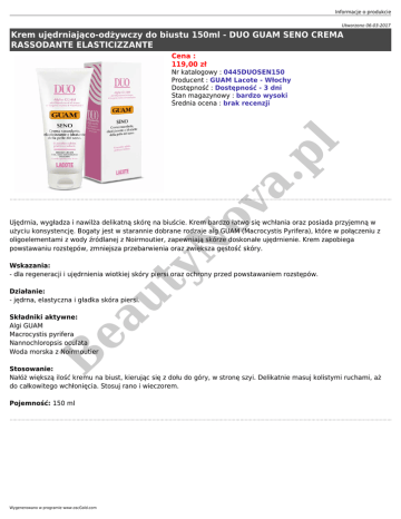 Informacje o produkcie Utworzono 06-03-2017 Krem ujędrniająco-odżywczy do biustu 150ml - DUO GUAM SENO CREMA RASSODANTE ELASTICIZZANTE Cena : 119,00 zł ov a. pl Nr katalogowy : 0445DUOSEN150 Producent : GUAM Lacote - Włochy Dostępność : Dostępność - 3 dni Stan magazynowy : bardzo wysoki Średnia ocena : brak recenzji yN Ujędrnia, wygładza i nawilża delikatną skórę na biuście. Krem bardzo łatwo się wchłania oraz posiada przyjemną w użyciu konsystencję. Bogaty jest w starannie dobrane rodzaje alg GUAM (Macrocystis Pyrifera), które w połączeniu z oligoelementami z wody źródlanej z Noirmoutier, zapewniają skórze doskonałe ujędrnienie. Krem zapobiega powstawaniu rozstępów, zmniejsza przebarwienia oraz zwiększa gęstość skóry. ut Wskazania: - dla regeneracji i ujędrnienia wiotkiej skóry piersi oraz ochrony przed powstawaniem rozstępów. Działanie: - jędrna, elastyczna i gładka skóra piersi. B ea Składniki aktywne: Algi GUAM Macrocystis pyrifera Nannochloropsis oculata Woda morska z Noirmoutier Stosowanie: Nałóż większą ilość kremu na biust, kierując się z dołu do góry, w stronę szyi. Delikatnie masuj kolistymi ruchami, aż do całkowitego wchłonięcia. Stosuj rano i wieczorem. Pojemność: 150 ml Wygenerowano w programie www.oscGold.com