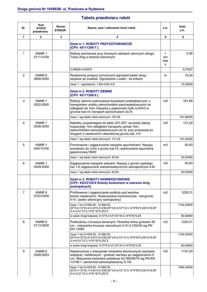 Droga gminna Nr 105893B- ul. Piaskowa w Rydzewie Tabela przedmiaru robót Nr Kod pozycji przedmiaru 1 2 Numer STWiOR B 3 Nazwa, opis i obliczenie ilości robót 4 J.m. Ilość j.m. 5 6 Dział nr 1. ROBOTY PRZYGOTOWAWCZE [CPV: 45111290-7 ] 1 KNNR 1 0111-0100 Roboty pomiarowe przy liniowych robotach ziemnych (drogi). Trasa dróg w terenie równinnym 1 km tras y 0,26655+0,00972 2 KNNR 6 0808-0300 0,28 0,27627 Rozebranie poręczy ochronnych,ogrodzeń,barier drog.i słupków do znaków. Ogrodzenie z siatki - na linkach m trasa 1 - ogrodzenie: 1,80+4,60+3,9 10,30 10,30000 Dział nr 2. ROBOTY ZIEMNE [CPV: 45111200-0 ] 3 KNNR 1 0202-0500 Roboty ziemne wykonywane koparkami podsiębiernymi, z transportem urobku samochodami samowyładowczymi na odległość do 1km. Koparką o pojemności łyżki 0,40m3 w gruncie kat.I-II; transport samochodami do 5t m3 trasa 1 wg tabeli robót ziemnych: 181,85 4 KNNR 1 0208-0200 Nakłady uzupełniające do tablic 201-207; za każdy dalszy rozpoczęty 1km odległości transportu ponad 1km, samochodami samowyładowczymi do 5t, przy przewozie po drogach o nawierzchni utwardzonej gruntu kat. I-IV 181,85000 m3 trasa 1 wg tabeli robót ziemnych: 131,02 5 KNNR 1 0407-0100 Formowanie i zagęszczanie nasypów spycharkami. Nasypy wysokości do 3,0m z gruntu kat.I-II, wykonywane spycharką gąsienicową 55kW KNNR 1 0409-0300 Zagęszczenie nasypów walcami. Nasypy z gruntu sypkiego kat. I-II zagęszczane walcamistatycznymi samojezdnymi 4-6t 131,02 131,02000 m3 trasa 1 wg tabeli robót ziemnych: 50,83 6 181,85 50,83 50,83000 m3 trasa 1 wg tabeli robót ziemnych: 50,83 50,83 50,83000 Dział nr 3. ROBOTY NAWIERZCHNIOWE [CPV: 45233120-6 Roboty budowlane w zakresie dróg podrzędnych] 7 KNNR 6 0103-0300 Profilowanie i zagęszczanie podłoża pod warstwy konstr.nawierzchni. Wykonywane mechanicznie - kat.gruntu II-VI. (walec wibracyjny samojezdny) m2 trasa 1 km 0+000,00 - 0+266,55: 20*5,4+10*(5,4+3,9)*0,5+236,55*3,9+((12*12-3,14*6*6)*0,25)*2+9,50* 3,4+((12*12-3,14*6,*6)*0,25)*2 1140,30500 w pasie drogi krajowej: 9,72*5,4+2*(16*16-3,14*8*8)*0,25 8 KNNR 6 0113-0200 Podbudowy z kruszyw łamanych. Warstwa dolna grubości 20 cm - mieszanka kruszyw naturalnych 0-31,5 C50/30 wg PN EN 13285 80,00800 m2 trasa 1 km 0+000,00 - 0+266,55: 20*5,4+10*(5,4+3,9)*0,5+236,55*3,9+((12*12-3,14*6*6)*0,25)*2+9,50* 3,4+((12*12-3,14*6,*6)*0,25)*2 KNNR 6 0308-0203 Nawierzchnie z mieszanek mineralno-bitumicznych (warstwa wiążąca). Asfaltowych - grubość warstwy po zagęszczeniu 5 cm. Mieszanka mineralno-asfaltowa AC16W50/70 wg PN EN 13108-1, samochód samowyładowczy 5-10t trasa 1 km 0+000,00 - 0+266,55: 20*5,1+10*(5,1+3,6)*0,5+236,55*3,6+((12*12-3,14*6*6)*0,25)*2+9,50* 3,4+((12*12-3,14*6,*6)*0,25)*2 -1- 1220,31 1140,30500 w pasie drogi krajowej: 9,72*5,4+2*(16*16-3,14*8*8)*0,25 9 1220,31 80,00800 m2 1137,43 1060,34000 3. ROBOTY NAWIERZCHNIOWE Nr Kod pozycji przedmiaru 1 2 Numer STWiOR B 3 Nazwa, opis i obliczenie ilości robót 4 J.m. 5 w pasie drogi krajowej: 9,72*5,1+2*(16*16-3,14*8*8)*0,25 10 KNNR 6 0308-0701 Nawierzchnie z mieszanek mineralno-bitumicznych (warstwa wiążąca). Dodatek za dalszy 1 km przewozu ponad 5 km, samochód samowyładowczy 5-10t Krotność = 20 KNNR 6 1005-0700 1t Oczyszczenie i skropienie bitumem nawierzchni drogowych. Skropienie nawierzchni asfaltem m2 Nawierzchnie z mieszanek mineralno-bitumicznych (warstwa ścieralna). Grubość warstwy po zagęszczeniu 3 cm. Mieszanka mineralno AC8S50/70 wg PN EN 13108-1, samochód samowyładowczy 5-10 t 77,09200 m2 trasa 1 km 0+000,00 - 0+266,55: 20*5,0+10*(5,0+3,5)*0,5+236,55*3,5+((12*12-3,14*6*6)*0,25)*2+9,50* 3,4+((12*12-3,14*6,*6)*0,25)*2 KNNR 6 0309-0701 Nawierzchnie z mieszanek mineralno-bitumicznych (warstwa ścieralna). Dodatek za dalszy 1 km przewozu ponad 5 km, samochód samowyładowczy 5-10 t Krotność = 20 1109,81 1033,68500 w pasie drogi krajowej: 9,72*5,0+2*(16*16-3,14*8*8)*0,25 13 1137,43 1060,34000 w pasie drogi krajowej: 9,72*5,1+2*(16*16-3,14*8*8)*0,25 KNNR 6 0309-0103 141,50 141,49630 trasa 1 km 0+000,00 - 0+266,55: 20*5,1+10*(5,1+3,6)*0,5+236,55*3,6+((12*12-3,14*6*6)*0,25)*2+9,50* 3,4+((12*12-3,14*6,*6)*0,25)*2 12 6 77,09200 141,4963 11 Ilość j.m. 76,12000 1t 84,9005 84,90 84,90050 Dział nr 4. ORGANIZACJA RUCHU [CPV: 45233290-8 ] 14 KNNR 6 0702-0101 Pionowe znaki drogowe. Słupki z rur stalowych # 70 mm szt trasa 1 km 0+000,00 - 0+266,55: 7 15 KNNR 6 0702-0500 Pionowe znaki drogowe. Znaki zakazu,nakazu,ostrzegawcze i informacyjne o pow.ponad 0.3 m2 7,00000 szt A-7: 1 16 KNNR 6 0702-0500 7,00 1,00 1,00000 Pionowe znaki drogowe. Znaki zakazu,nakazu,ostrzegawcze i informacyjne o pow.ponad 0.3 m2 szt 6,00 D-1: 2 2,00000 B-43: 2 2,00000 B-44: 2 2,00000 -2-