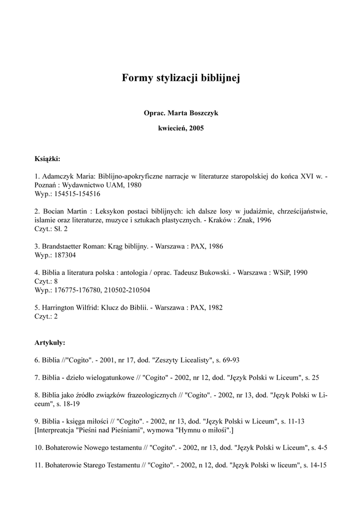 Formy stylizacji biblijnej Oprac. Marta Boszczyk kwiecieñ, 2005 Ksi¹¿ki: 1. Adamczyk Maria: Biblijno-apokryficzne narracje w literaturze staropolskiej do koñca XVI w. Poznañ : Wydawnictwo UAM, 1980 Wyp.: 154515-154516 2. Bocian Martin : Leksykon postaci biblijnych: ich dalsze losy w judaiŸmie, chrzeœcijañstwie, islamie oraz literaturze, muzyce i sztukach plastycznych. - Kraków : Znak, 1996 Czyt.: S³. 2 3. Brandstaetter Roman: Kr¹g biblijny. - Warszawa : PAX, 1986 Wyp.: 187304 4. Biblia a literatura polska : antologia / oprac. Tadeusz Bukowski. - Warszawa : WSiP, 1990 Czyt.: 8 Wyp.: 176775-176780, 210502-210504 5. Harrington Wilfrid: Klucz do Biblii. - Warszawa : PAX, 1982 Czyt.: 2 Artyku³y: 6. Biblia //"Cogito". - 2001, nr 17, dod. "Zeszyty Licealisty", s. 69-93 7. Biblia - dzie³o wielogatunkowe // "Cogito" - 2002, nr 12, dod. "Jêzyk Polski w Liceum", s. 25 8. Biblia jako Ÿród³o zwi¹zków frazeologicznych // "Cogito". - 2002, nr 13, dod. "Jêzyk Polski w Liceum", s. 18-19 9. Biblia - ksiêga mi³oœci // "Cogito". - 2002, nr 13, dod. "Jêzyk Polski w Liceum", s. 11-13 [Interpreatcja "Pieœni nad Pieœniami", wymowa "Hymnu o mi³oœi".] 10. Bohaterowie Nowego testamentu // "Cogito". - 2002, nr 13, dod. "Jêzyk Polski w Liceum", s. 4-5 11. Bohaterowie Starego Testamentu // "Cogito". - 2002, n 12, dod. "Jêzyk Polski w liceum", s. 14-15 Formy stylizacji biblijnej 2 12. Kot Wies³aw : Biblijny apokryf literacki. Próba analizy zjawiska na przyk³adach polskich // "¯ycie i Myœl". - 1986, nr 1, s. 24-36 13. Liskowacki Artur D. : Wed³ug ucznia // "Twórczoœæ". - 2001, nr 5, s. 79-96 [Analiza i interpretacja Biblii , postaæ Judasza Iskarioty.] 14. Miko³ejko Zbigniew : Iskariota, zdrajca i mêczenni : trzy fragmenty na temat pewnego apostolstwa // "Twórczoœæ". - 2001, nr 5, s. 54-78 [Analiza i interpretacja Biblii, postaæ Judasza Iskarioty.] 15. Semczuk Ma³gorzata : Cz³owiek cz³owiekowi...? : tradycja biblijna we wspó³czesnej poezji polskiej w swym negatywnym i pozytywnym obrazie // "Przegl¹d Humanistyczny". - 1995, nr 2, s. 91-104 16. ¯ak Stanis³aw : Biblijne inspiracje. Przywrócone szkole // "Przemiany". - 1982, nr 1, s. 33-35 Opracowania utworów: Kochowski Wespazjan "Psalmodia polska" 17. Eustachiewicz Maria : "Psalmodia polska" Wespazjana Kochowskiego na tle staropolskich stylizacji biblijnych // "Pamiêtnik Literacki". - 1974, z. 2, s. 45-78 18. Kochowski Wespazjan : Utwory poetyckie: wybór. - Wroc³aw : Ossolineum, 1991 Czyt.: BN sI [Rozdzia³ "Psalmodia" str. LX] 19. Kochowski Wespazjan : Psalmodia polska oraz wybór liryków i fraszek. - Kraków : Krakowska Spó³dzielnia Wydawnicza, b.r. Czyt.: BN [Wstêp] 20. Sawicka-Jurek Jolanta : Cz³owiek a œwiat. Rozwa¿ania na podstawie "Psalmodii polskiej" Wespazjana Kochowskiego // W: Literatura i kultura polska po "potopie" / pod red. B. Otwinowskiej i J. Pelca. - Wroc³aw, 1992. - S. 165-172 21. Starnawski Jerzy : Wespazjan Kochowski. - Wroc³aw ; Kraków: Ossolineum, 1988 Czyt.: 92 Mickiewicz Adam "Dziady cz. III" 22. Cieœla-Korytowska Maria : "Dziady" Adama Mickiewicza. - Warszawa : WSiP, 1995 Czyt.: 92 23. Dopart Bogus³aw : Piêtno buntu metafizycznego. Z symboliki III czêœci "Dziadów" //"Ruch Literacki". - 1989, z. 4, s. 301 - 316 24. Dopart Bogus³aw : Widzenie ksiêdza Piotra a wieszczba Oleszkiewicza. Stopnie proroczych wtajemniczeñ w III czêœci "Dziadów" // "Przegl¹d Humanistyczny". - 1993, nr 1, s. 79 90 Formy stylizacji biblijnej 3 25. Jankowski Andrzej : Dziady czêœæ III Adama Mickiewicza. - Warszawa : Wydaw. Suplement, 1990. - Lektury do matury 15 Czyt.: 208993 Podr. 26. Kleiner Juliusz : Problematy improwizacji Konrada. - Lublin : Towarzystwo Naukowe, 1947 Czyt.: 92 27. Kleiner Juliusz : W krêgu historii i teorii literatury. - Warszawa, 1981 [Str.: 261 - 285: Proroctwo ksiêdza Piotra.] Czyt.: 8 28. Kubacki Wac³aw : Arcydramat Mickiewicza . Studia na III czêœci¹ "Dziadów". - Kraków : Wydaw. M. Kot", 1951 Czyt.: 92 29. Wielkie dramaty romantyczne : "Dziady" Adama Mickiewicza // "Cogito". - 2002, nr 19, s. 31-34 Mickiewicz Adam "Ksiêgi Narodu i Pielgrzymstwa Polskiego" 30. Mickiewicz Adam : Ksiêgi Narodu Polskiego i Pielgrzymstwa Polskiego. - Wroc³aw : Osslineum, 1956 Czyt.: BN 31. Stefanowska Zofia : "By³a wolnoœæ z porz¹dkiem" // "Pamiêtnik Literacki". - 1956, zeszyt specjalny w setn¹ rocznicê zgonu A. Mickiewicza 1855-1955, s. 93-101 [Analiza ideologii "Ksi¹g Narodu i Pielgrzymstwa Polskiego".] 32. Witkowska Alina : Jak by³o, a jak byæ powinno. Miêdzy histori¹ a "Ksiêgami Pielgrzymstwa Polskiego" // "Teksty Drugie". - 1993, nr 2, s. 19-30 Mi³osz Czes³aw " Piosenka o koñcu œwiata" 33. B³oñski Jan : Mi³osz jak œwiat. - Kraków : Znak, 1998 Czyt.: 92 [Str. 26-28: "Piosenka o koñcu œwiata"] 34. Chrz¹stowska Bo¿ena: Poezje Czes³awa Mi³osza. - Warszawa : WSiP, 1993 Czyt.: 92 [Str. 102 - analiza wiersza "Piosenka o koñcu œwiata".] 35. Dwa wiersze wspó³czesne o koñcu œwiata // "Cogito". - 2002, nr 13, dod. "Jêzyk Polski w Liceum", s. 16-17 [Interpretacja wiersza Cz. Mi³osza, Z. Herberta "U wrót doliny".] 36. Mi³osz, Czes³aw : "Podró¿ny œwiata" : rozmowy / Czes³aw Mi³osz, Renata Gorczyñska. - Kraków : Wydaw. Literackie, 2002 Czyt.: 92 [Str. 209: O "Ksiêdze Psalmów".] Formy stylizacji biblijnej 4 37. Poznawanie Mi³osza : studia i szkice o twórczoœci poety / pod red. Jerzego Kwiatkowskiego. - Kraków ; Wroc³aw: Wydawnictwo Literackie, 1985 Czyt.: 92 [Str. 375-376: analiza "Piosenki o koñcu œwiata"] Mi³osz Czes³aw "Ksiêga Psalmów" 38. Biblia. Ksiêga Psalmów / t³. Z hebr. Czes³aw Mi³osz - Paris: Editions Dialogue, 1981 Czyt.: 2 [Wstêp] 39. Bieñkowska Ewa : Mi³osz i psalmy // "Zeszyty Literackie". - 2005, nr 1, s. 71-77 [Psalmy "Starego Testamentu" w t³umaczeniu Czes³awa Mi³osza. ] 40. Kuchmeister Micha³ : Do Mi³oszowego przek³adu "Ksiêgi Psalmów" przyczynek // "Poezja" . 1981, nr 7, s. 62-70 Skarga Piotr "Ka