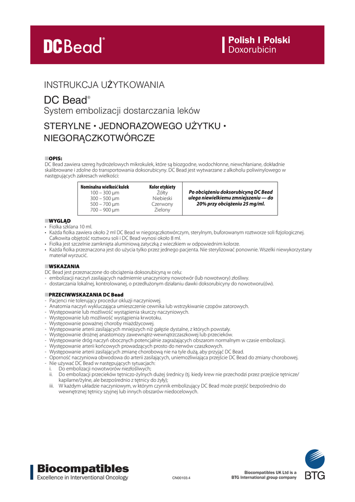 Polish I Polski Doxorubicin INSTRUKCJA UŻYTKOWANIA DC Bead ® System embolizacji dostarczania leków STERYLNE • JEDNORAZOWEGO UŻYTKU • NIEGORĄCZKOTWÓRCZE NOPIS: DC Bead zawiera szereg hydrożelowych mikrokulek, które są biozgodne, wodochłonne, niewchłaniane, dokładnie skalibrowane i zdolne do transportowania doksorubicyny. DC Bead jest wytwarzane z alkoholu poliwinylowego w następujących zakresach wielkości: Nominalna wielkość kulek 100 – 300 μm 300 – 500 μm 500 – 700 μm 700 – 900 μm Kolor etykiety Żółty Niebieski Czerwony Zielony Po obciążeniu doksorubicyną DC Bead ulega niewielkiemu zmniejszeniu — do 20% przy obciążeniu 25 mg/ml. NWYGLĄD t 'JPMLBT[LMBOBNM t ,BƒEBmPMLB[BXJFSBPLPPNM%$#FBEXOJFHPSŕD[LPUXØSD[ZNTUFSZMOZNCVGPSPXBOZNSP[UXPS[FTPMJm[KPMPHJD[OFK Całkowita objętość roztworu soli i DC Bead wynosi około 8 ml. t 'JPMLBKFTUT[D[FMOJF[BNLOJŢUBBMVNJOJPXŕ[BUZD[Lŕ[XJFD[LJFNXPEQPXJFEOJNLPMPS[F t ,BƒEBmPMLBQS[F[OBD[POBKFTUEPVƒZDJBUZMLPQS[F[KFEOFHPQBDKFOUB/JFTUFSZMJ[PXBŗQPOPXOJF8T[FMLJOJFXZLPS[ZTUBOZ materiał wyrzucić. NWSKAZANIA DC Bead jest przeznaczone do obciążenia doksorubicyną w celu: - embolizacji naczyń zasilających nadmiernie unaczyniony nowotwór (lub nowotwory) złośliwy. - dostarczania lokalnej, kontrolowanej, o przedłużonym działaniu dawki doksorubicyny do nowotworu(ów). NPRZECIWWSKAZANIA DC Bead - Pacjenci nie tolerujący procedur okluzji naczyniowej. - Anatomia naczyń wykluczająca umieszczenie cewnika lub wstrzykiwanie czopów zatorowych. - Występowanie lub możliwość wystąpienia skurczy naczyniowych. - Występowanie lub możliwość wystąpienia krwotoku. - Występowanie poważnej choroby miażdżycowej. - Występowanie arterii zasilających mniejszych niż gałęzie dystalne, z których powstały. - Występowanie drożnej anastomozy zawewnątrz-wewnątrzczaszkowej lub przecieków. - Występowanie dróg naczyń obocznych potencjalnie zagrażających obszarom normalnym w czasie embolizacji. - Występowanie arterii końcowych prowadzących prosto do nerwów czaszkowych. - Występowanie arterii zasilających zmianę chorobową nie na tyle dużą, aby przyjąć DC Bead. - Oporność naczyniowa obwodowa do arterii zasilających, uniemożliwiająca przejście DC Bead do zmiany chorobowej. - Nie używać DC Bead w następujących sytuacjach: i. Do embolizacji nowotworów niezłośliwych; ii. Do embolizacji przecieków tętniczo-żylnych dużej średnicy (tj. kiedy krew nie przechodzi przez przejście tętnicze/ kapilarne/żylne, ale bezpośrednio z tętnicy do żyły); iii. W każdym układzie naczyniowym, w którym czynnik embolizujący DC Bead może przejść bezpośrednio do wewnętrznej tętnicy szyjnej lub innych obszarów niedocelowych. Biocompatibles Excellence in Interventional Oncology CN00103.4 Biocompatibles UK Ltd is a BTG International group company Polish I Polski Doxorubicin NPRZECIWWSKAZANIA - DOKSORUBICYNA - Przeciwwskazania dotyczące zastosowania patrz wkładka w opakowaniu doksorubicyny. 0453;&Lj&/*&#BEBOJBXZLB[BZȈF%$#FBEOJFUXPS[ZTLVQJTLQS[F[DPQFOFUSVKnjVLBEOBD[ZOJPXZ HǗCJFKOJȈQPEPCOFKXJFMLPǴDJD[njTULJ17" NOSTRZEŻENIA t /JFTUPTPXBŗLJFEZmPMLBMVCPQBLPXBOJFXZHMŕEBKŕOBVT[LPE[POF t 8ZCSBŗXJFMLPžŗJJMPžŗ%$#FBEPEQPXJFEOJPEP[NJBOZQBUPMPHJD[OFKLUØSBNBCZŗMFD[POB t &NCPMJ[BDKB[BQPNPDŕ%$#FBEQPXJOOBCZŗXZLPOZXBOBKFEZOJFQS[F[MFLBS[B[PEQPXJFEOJNQS[FT[LPMFOJFNX zakresie okluzji interwencyjnej w obszarze, który ma podlegać embolizacji. t 1S[FLSPD[FOJFPCDJnjȈFOJBEBXLnjEPLTPSVCJDZOZQPOBENHOBNM%$#FBENPȈFQSPXBE[JǎEP PHØMOPVTUSPKPXFHPEPQSPXBE[FOJBEPLTPSVCJDZOZJ[XJnj[BOZDI[UZNFGFLUØXVCPD[OZDI NPOTENCJALNE POWIKŁANIA t /JFQPƒŕEBOZSFnVLTMVCQS[FKžDJF%$#FBEEPOPSNBMOZDIUŢUOJDXQPCMJƒVEPDFMPXFK[NJBOZDIPSPCPXFKMVCQS[F[ zmianę chorobową do innych tętnic lub łożyska naczyniowego. t &NCPMJ[BDKBNJFKTDBJOOFHPOJƒDIPSPCPXF t &NCPMJ[BDKBOBD[ZŴQVDOZDI t /JFEPLSXJFOJFXOJFQPƒŕEBOZNNJFKTDV t /BTZDFOJFTJFDJOBD[ZŴXPTLPXBUZDIJVT[LPE[FOJFULBOLJ t 6EBSOJFEPLSXJFOOZMVC[BXBOJFEPLSXJFOOZ t 1ŢLOJŢDJFOBD[ZOJBMVCNJFKTDB[NJBOZDIPSPCPXFKJLSXBXJFOJF t %FmDZUZOFVSPMPHJD[OFXUZNQPSBƒFOJFOFSXØXD[BT[LPXZDI t 4LVSD[OBD[ZŴ t ĽNJFSŗ t 8UØSOFVESPƒOJFOJFTJŢOBD[ZOJB t 0ED[ZOOBDJBPPCDFXZNBHBKŕDZJOUFSXFODKJNFEZD[OFK t *OGFLDKBXZNBHBKŕDBJOUFSXFODKJNFEZD[OFK t ;BLS[FQOBLPŴDVDFXOJLBJOBTUŢQPXFKFHP[BNLOJŢDJF NINSTRUKCJA OBCIĄŻANIA LEKIEM %$#FBEOBEBKFTJǗEPPCDJnjȈBOJB5:-,0EPLTPSVCJDZOnj)$*-JQPTPNBMOBQPTUBǎEPLTPSVCJDZOZOJFKFTU PEQPXJFEOJBEPQS[FOPT[FOJBX%$#FBE "CZV[ZTLBǎLPǩDPXFPCDJnjȈFOJFNHEPLTPSVCJDZOZOBöPMLǗNM%$#FBE J 3FLPOTUZUVPXBŗmPMLŢ[BXJFSBKŕDŕNHEPLTPSVCJDZOZ[BQPNPDŕNMTUFSZMOFKXPEZEPJOJFLDKJ8ZNJFT[BŗEPCS[F XDFMVV[ZTLBOJBD[FSXPOFHPSP[UXPSVNHNM JJ ;BQPNPDŕTUS[ZLBXLJ[DJFOLŕJHŕVTVOŕŗKBLOBKXJŢDFKTPMJm[KPMPHJD[OFK[mPLJ%$#FBE JJJ ;BQPNPDŕTUS[ZLBXLJJJHZEPEBŗNMSFLPOTUZUVPXBOFHPSP[UXPSVEPLTPSVCJDZOZCF[QPžSFEOJPEPmPMLJ%$#FBE iv. Wstrząsnąć roztwór DC Bead/doksorubicyny, aby przyspieszyć jego mieszanie, aż DC Bead stanie się czerwone. Chociaż roztwór zachowa kolor czerwony, doksorubicynya zostanie załadowana. W 0CDJŕƒBOJFCŢE[JFUSXBŗPENJOVUEMBOBKNOJFKT[ZDIIZESPƒFMPXZDINJLSPLVMFL%$#FBEEPNJOVUEMB największych. vi. Przed użyciem przenieść DC Bead obciążone doksorubicyną do strzykawki i dodać jednakową objętość niejonowego środka kontrastowego. Delikatnie odwrócić strzykawkę w celu uzyskania jednorodnej zawiesiny DC Bead. vii. Załadowana może zostać dawka doksorubicyny do 37,5 mg na 1 ml DC Bead. viii. ;BMFDBOBNBLTZNBMOBDBLPXJUBEBXLBEPLTPSVCJDZOZOBQSPDFEVSǗXZOPTJNH Excellence in Interventional Oncology Biocompatibles CN00103.4 Biocompatibles UK Ltd is a BTG International group company Polish I Polski Doxorubicin NPRZECHOWYWANIE DC BEAD OBCIĄŻONYCH LEKIEM J %$#FBEPCDJŕƒPOZEPLTPSVCJDZOŕNPƒFCZŗQS[FDIPXZXBOZQS[F[PLSFTEPHPE[JOXMPEØXDFXUFNQFSBUVS[F¡$[ niejonowym środkiem kontrastowym lub bez niego. NINSTRUKCJA PODAWANIA t 1S[FESP[QPD[ŢDJFNQSPDFEVSZFNCPMJ[BDKJEPLBEO