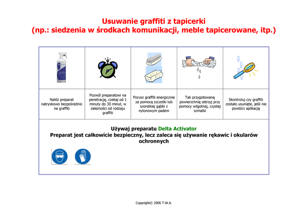 Usuwanie graffiti z tapicerki (np.: siedzenia w środkach komunikacji, meble tapicerowane, itp.) Nałóż preparat natryskowo bezpośrednio na graffiti Pozwól preparatowi na penetrację, czekaj od 1 minuty do 30 minut, w zależności od rodzaju graffiti Porusz graffiti energicznie za pomocą szczotki lub szorstkiej gąbki z nylonowym padem Tak przygotowaną powierzchnię zetrzyj przy pomocy wilgotnej, czystej szmatki Skontroluj czy graffiti zostało usunięte, jeśli nie powtórz aplikację Używaj preparatu Delta Activator Preparat jest całkowicie bezpieczny, lecz zaleca się używanie rękawic i okularów ochronnych Copyright© 2006 T.W.A.