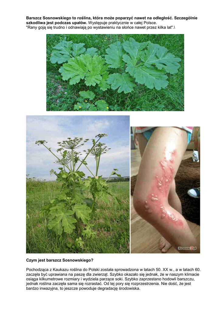 Barszcz Sosnowskiego to roślina, która może poparzyć nawet na odległość. Szczególnie szkodliwa jest podczas upałów. Występuje praktycznie w całej Polsce. "Rany goją się trudno i odnawiają po wystawieniu na słońce nawet przez kilka lat".\ Czym jest barszcz Sosnowskiego? Pochodząca z Kaukazu roślina do Polski została sprowadzona w latach 50. XX w., a w latach 60. zaczęła być uprawiana na paszę dla zwierząt. Szybko okazało się jednak, że w naszym klimacie osiąga kilkumetrowe rozmiary i wydziela parzące soki. Szybko zaprzestano hodowli barszczu, jednak roślina zaczęła sama się rozrastać. Od tej pory się rozprzestrzenia. Nie dość, że jest bardzo inwazyjna, to jeszcze powoduje degradację środowiska. Poważne poparzenia Barszcz Sosnowskiego jest niebezpieczny dla ludzi, bo jego sok zawiera furanokumaryny. Są to związki, które powodują oparzenia skóry I i II stopnia. Reakcje na jego działanie są różne: jedni czują pieczenie po kilku minutach, inni - nawet po tygodniu. Stan zapalny zaczyna ustępować zwykle po trzech dniach, ale ciemne zabarwienie skóry może się utrzymywać miesiącami. Warto pamiętać, że oparzone miejsca są wrażliwe na promieniowanie ultrafioletowe nawet przez kilka lat. Odnotowano przypadki osób szczególnie wrażliwych na substancję wydzielaną przez barszcz Sosnowskiego, a poparzenia zagrażały nawet ich życiu. Jak z nim walczyć? Barszcz Sosnowskiego jest szczególnie niebezpieczny podczas upalnych dni. Wokół rośliny powstaje silne stężenie parzącej substancji, więc oparzenie może wywołać samo zbliżenie się do barszczu. W takiej sytuacji należy pamiętać o ochronie nie tylko skóry, ale także dróg oddechowych. Barszcz Sosnowskiego jest bardzo trudny w zwalczaniu, bo jedna roślina wytwarza mnóstwo nasion, które mogą kiełkować nawet po kilku latach. Dlatego zaleca się obcinanie kwiatostanów, wykopywanie roślin, a także niszczenie ich za pomocą środków chemicznych takich jak Roundup. Jeżeli dojdzie do kontaktu z rośliną, należy jak najszybciej umyć zaatakowane miejsce wodą z mydłem i przez dwa-trzy dni nie wystawiać go na słońce. W przypadku rozległych oparzeń lub reakcji alergicznej należy skontaktować się z lekarzem. Za zwalczanie barszczu Sosnowskiego odpowiada właściciel na terenie, którego roślina się znajduje. Usuwanie barszczu Sosnowskiego z terenów, którego właścicielem jest miasto Gorzów Wlkp. zajmuje się Pan Dawid Smoliński z Wydziału Gospodarki Komunalnej i Transportu Publicznego – tel. 95 7355855 lub 697522616.