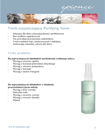 Tonik oczyszczający Purifying Toner • • • • Zalecany dla skóry mieszanej/tłustej i problemowej Bez środków zapachowych Nie powoduje powstawania zaskórników Usuwa nadmiar łoju, zanieczyszczeń i makijażu, zachowując naturalny odczyn pH skóry Cechy produktu: Do najważniejszych składników pochodzenia roślinnego należą: • Wyciąg z owoców ogórka • Wyciąg z korzenia prawoślazu lekarskiego • Wyciąg z owoców pomarańczy • Wyciąg z lawendy • Wyciąg z nasion winogron Do najważniejszych składników o działaniu przeciwbakteryjnym należą: • Wyciąg z kory wierzby • Salicylan sodu • Wyciąg z owoców cytryny • Wyciąg z owoców limonki • Mentol www.epionce.pl 7 Korzyści ze stosowania produktu: Tonik oczyszczający Tonik oczyszczający Purifying Toner jednocześnie usuwa zaskórniki i ma działanie keratolityczne: • Delikatnie przenika do mieszków włosowych, gdzie wspomaga usunięcie martwych komórek naskórka, zanieczyszczeń, łoju oraz resztek makijażu, które mogą prowadzić do zatkania porów i być przyczyną powstawania zmian zapalnych • Usuwa i hamuje wydzielanie nadmiaru wydzieliny gruczołów łojowych, matuje skórę i jednocześnie pomaga utrzymać naturalny odczyn pH skóry • Pozwala na ograniczenie aktywności bakterii i grzybów na powierzchni skóry, zmniejszając podrażnienia i podatność na pojawianie się wykwitów trądzikowych • Zwiększa skuteczność preparatów leczniczych dzięki optymalizacji działania ich aktywnych składników Produkt ten działa najlepiej na skórze tłustej i skłonnej do zmian trądzikowych, wspomagając leczenie trądziku oraz zmniejszając nadmiar łoju i niwelując błyszczenie się skóry; może być również stosowany jako preparat do punktowego leczenia zmian trądzikowych na skórze suchej i normalnej. Podczas gorących letnich miesięcy Tonik oczyszczający pomaga pozbyć się nadmiaru łoju i potu ze skóry, co zapobiega pojawianiu się nowych wykwitów trądzikowych. Jest to znakomity produkt dla nastolatków, jako następny preparat po żelu do oczyszczania skóry, stosowany w celu zmniejszenia widoczności zmian trądzikowych oraz zapobiegania ich pojawianiu się. Zaleca się go również jako produkt wspomagający przy leczeniu zmian typu rogowacenia mieszkowego (czerwonych, szorstkich grudek) na tylnych powierzchniach ramion/ud. Toniku tego można także używać do przecierania zmian trądzikowych na klatce piersiowej i/lub na plecach. 8 Porady Specjalisty Epionce Klientka: Czy Tonik oczyszczający jest koniecznym etapem programu pielęgnacji skóry Epionce? Specjalista Epionce: Preparaty do oczyszczania skóry Cleanser Epionce posiadają zrównoważony i odpowiedni dla skóry odczyn pH, a zatem tonik nie jest niezbędny do przywrócenia tego odczynu. Purifying Toner powinien być stosowny jako dodatkowy produkt zmniejszający wydzielanie łoju i matujący skórę. Klientka: W którym momencie mojego codziennego programu Epionce powinnam zastosować Tonik oczyszczający? Specjalista Epionce: Zastosuj swój Tonik oczyszczający ja ko drugi krok w pielęgnacji, po preparacie oczyszczającym i przed produktem litycznym z serii Lytic. Klientka: Czy Tonik oczyszczający jest skuteczny tylko na skórze tłustej i skłonnej do zmian trądzikowych? Specjalista Epionce: Wszystkie rodzaje skóry mogą odnieść korzyść ze stosowania tego toniku. Można używać Tonik oczyszczający punktowo na zmiany trądzikowe pojawiające się okresowo na skórze suchej lub wrażliwej lub też stosować go codziennie na obszarach skóry z tendencją do większego przetłuszczania się lub błyszczenia, aby kontrolować ten niepożądany efekt. Klientka: Jaki jest najlepszy sposób stosowania Toniku oczyszczającego? Specjalista Epionce: Można spryskać skórę tonikiem bezpośrednio kilkoma naciśnięciami pompki (chroniąc okolice oczu) lub też zwilżyć wacik lub płatek kosmetyczny, a następnie nałożyć na skórę. Klientka: Jak mogę zwalczyć wykwity trądzikowe pojawiające się na ciele? Specjalista Epionce: Tonik oczyszczający jest idealnym produktem do stosowania przy wykwitach na plecach i klatce piersiowej, działa też na zmiany typu rogowacenia mieszkowego (czerwone, szorstkie grudki) na tylnych powierzchniach ramion lub ud. W celu uzyskania najlepszych efektów należy najpierw oczyścić skórę przy pomocy Litycznego żelu oczyszczjącego. Klientka: Pomocy! Co możecie polecić na moje zmęczone i piekące stopy? Specjalista Epionce: Tonik oczyszczający znakomicie odświeża stopy po długim i upalnym dniu! Składniki przeciwdrobnoustrojowe pomagają także zwalczyć nieprzyjemny zapach stóp. www.epionce.pl 9