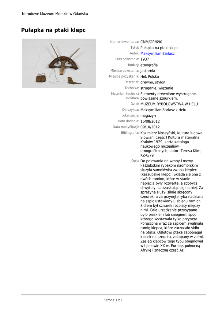 Narodowe Muzeum Morskie w Gdańsku Pułapka na ptaki klepc Numer inwentarza: CMM/OR/690 Tytuł: Pułapka na ptaki klepc Autor: Maksymilian Barlasz Czas powstania: 1937 Rodzaj: etnografia Miejsce powstania: Jastarnia Miejsce pozyskania: Hel, Polska Materiał: drewno, stylon Technika: struganie, wiązanie Materiał i technika Elementy drewniane wystrugane, opisowo: powiązane sznurkiem. Dział: MUZEUM RYBOŁÓWSTWA W HELU Darczyńca: Maksymilian Barlasz z Helu Lokalizacja: magazyn Data dodania: 16/08/2012 Data modyfikacji: 09/10/2012 Bibliografia: Kazimierz Moszyński, Kultura ludowa Słowian, część I Kultura materialna, Kraków 1929; karta katalogu naukowego muzealiów etnograficznych, autor: Teresa Klim; KZ-6/79 Opis: Do polowania na wrony i mewy kaszubskim rybakom nadmorskim służyła samołówka zwana klepiec (kaszubskie klepc). Składa się ona z dwóch ramion, które w stanie napięcia były rozwarte, a zdobycz chwytały, zatrzaskując się na niej. Za sprężynę służył silnie skręcony sznurek, a za przynętę ryba nadziana na szpic ustawiony u zbiegu ramion. Sidłem był sznurek rozpięty między nimi. Całe urządzenie przysypane było piaskiem lub śniegiem, spod którego wystawała tylko przynęta. Poruszona wraz ze szpicem zwalniała ramię klepca, które zarzucało sidło na ptaka. Odlotowi ptaka zapobiegał klocek na sznurku, zakopany w ziemi. Zasięg klepców tego typu obejmował w I połowie XX w. Europę, północną Afrykę i znaczną część Azji. Strona 1 z 1