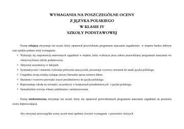 WYMAGANIA NA POSZCZEGÓLNE OCENY Z JĘZYKA POLSKIEGO W KLASIE IV SZKOŁY PODSTAWOWEJ Ocenę celującą otrzymuje ten uczeń, który opanował przewidziane programem nauczania zagadnienia w stopniu bardzo dobrym oraz spełnia podane niżej wymagania: Wykazuje się znajomością omawianych zagadnień w stopniu, który wykracza poza zakres przewidziany programem nauczania we właściwej klasie szkoły podstawowej. Aktywnie uczestniczy w lekcjach. Systematycznie i starannie wykonuje polecenia nauczyciela, prezentuje wzorowy stosunek do nauki języka polskiego. Uzupełnia swoją wiedzę czytając utwory literackie spoza zestawu lektur. Starannie i wzorowo prowadzi zeszyt przedmiotowy do języka polskiego. Reprezentuje szkołę na zewnątrz, uczestniczy w konkursach przedmiotowych z języka polskiego. Samodzielnie rozwija własne uzdolnienia i zainteresowania. Ocenę niedostateczną otrzymuje ten uczeń, który nie opanował przewidzianych programem nauczania zagadnień na poziomie oceny dopuszczającej. Aby otrzymać poszczególne oceny uczeń musi spełniać również wymagania z poziomów niższych. Kształcenie językowe – wypowiedzi ustne Bardzo dobry Dobry Czytanie ciche i głośne Wypowiedzi ustne są całkowicie poprawne. Wykazuje się bardzo dobrą znajomością przeczytanego tekstu. Potrafi nazwać niektóre stany psychiczne i ich przejawy. Ma bogaty zasób słownictwa i umiejętnie posługuje się nim. Analizuje utwór poetycki wskazując epitety, porównania, wersy, rymy, osobę mówiącą w wierszu. Samodzielnie wyodrębnia i nazywa elementy świata przedstawionego. Rozumie i potrafi wskazać motywy postępowania bohaterów. Podaje poprawnie cechy baśni i jej elementy, potrafi odróżnić baśń od innych utworów literackich. Odróżnia pojęcie narratora i osoby mówiącej w wierszu. Identyfikuje nadawcę i odbiorcę wypowiedzi (autora, narratora, czytelnika, słuchacza). Zna i potrafi wymienić elementy świata przedstawionego, wyodrębnić je przy pomocy nauczyciela. Potrafi ocenić postępowanie bohatera literackiego. Potrafi przedstawić treść utworu literackiego w Czyta głośno poprawnie, wyraźnie, płynnie, uwzględniając interpunkcję, akcent. Zna na pamięć i potrafi wygłosić utwory poetyckie ze zwróceniem uwagi na interpunkcję. Potrafi czytać cicho rozumiejąc czytany tekst. Identyfikuje wypowiedź jako tekst informacyjny, literacki, reklamowy. Korzysta z różnorodnych słowników, encyklopedii. Przekazuje wrażenia, omawia oglądaną sztukę teatralną, film, słuchowisko, audycję TV. Zna treść wszystkich wymaganych programem nauczania lektur (w całości lub reprezentatywnych fragmentach, zgodnie z zaleceniami nauczyciela). Kształcenie językowe – wypowiedzi pisemne Czyta poprawnie stosując zasady poprawnego przestankowania. Recytuje poprawnie, z nielicznymi błędami w zakresie intonacji, tempa oraz akcentowania. Ciche czytanie ze zrozumieniem jest Nauka o języku – wymagania dotyczące gramatyki języka polskiego Wypowiedzi ustne i pisemne są całkowicie poprawne. Doskonale potrafi posługiwać się poznanymi w klasie IV formami wypowiedzi (opowiadanie twórcze, opowiadanie odtwórcze, dziennik – pisany z perspektywy bohatera literackiego lub własnej, list prywatny, opis postaci literackiej, opis przedmiotu, opis krajobrazu, zaproszenie, przepis, dialog, ramowy plan odtwórczy, życzenia, gratulacje). Samodzielnie sporządza plan odtwórczy. Stosuje akapity. Posiada umiejętność przekształcania zdań mówionych na pisane oraz dialogu w spójną wypowiedź kilkuzdaniową (i odwrotnie). Pisze czytelnie, starannie, dba o właściwy kształt liter. Samodzielnie i sprawnie posługuje się słownikiem ortograficznym. Redaguje krótkie opowiadanie twórcze oparte na własnych doświadczeniach lub losach bohaterów, redaguje życzenia, dziennik – pisany z perspektywy bohatera literackiego lub własnej, opis postaci literackiej, opis Rozróżnia biegle poznane części mowy: czasownik, przymiotnik, rzeczownik, przysłówek. Poprawnie stosuje formy liczby, osoby, rodzaju, czasu. Biegle odmienia rzeczowniki i przymiotniki przez przypadki, poprawnie je stosuje w zdaniach. Biegle stopniuje przymiotniki i przysłówki. Odróżnia głoskę od litery, samogłoskę od spółgłoski. Dzieli wyrazy na sylaby. Stosuje zasady ortograficzne i pisze poprawnie wyrazy z ó, u, ż, rz, h, ch wymiennym i niewymiennym; rz po spółgłoskach i wyjątki od tej zasady; wielkie litery w nazwach świąt, części świata, miast i ich mieszkańców, tytułach utworów; zakończenia bezokolicznika i form czasu przeszłego; wyrazy z ą, ę, on, om, en, em; nie z różnymi częściami mowy. Rozróżnia części mowy: czasownik, przymiotnik, rzeczownik, przysłówek. Odróżnia głoskę od litery, samogłoskę od spółgłoski. Stopniuje przymiotniki i przysłówki. Dzieli wyrazy na sylaby. formie ilustracji, scenki dramatycznej lub krótkiej inscenizacji. Wskazuje w baśniach kontrast dobra i zła, prawdy i kłamstwa. Rozumie morał wynikający z utworu baśniowego. Wskazuje w wierszu epitet, porównanie, rymy, strofy. prawidłowe (występują nieliczne błędy dotyczące właściwego doboru materiału – potrzebna jest czasami pomoc nauczyciela). Zna treść większości lektur, których wymaga program nauczania i potrafi podać podstawowe fakty związane z treścią utworów. Dostateczny Dopuszczający Potrafi opowiadać poznany tekst ustnie przy pomocy dodatkowych pytań. Zna elementy świata przedstawionego. Odróżnia baśń od innych utworów. Odróżnia postaci zmyślone od rzeczywistych, fantastyczne od realistycznych. Wskazuje epitety, porównania, wersy, strofy, rymy. Uczeń ma poważne problemy z przedstawieniem poprawnej wypowiedzi. Występują liczne błędy w treści, składni oraz ubogie słownictwo. Uczeń rozpoznaje tylko niektóre zagadnienia z teorii literatury i tylko przy pomocy nauczyciela. Uczeń czyta głośno i recytuje z pamięci z licznymi b