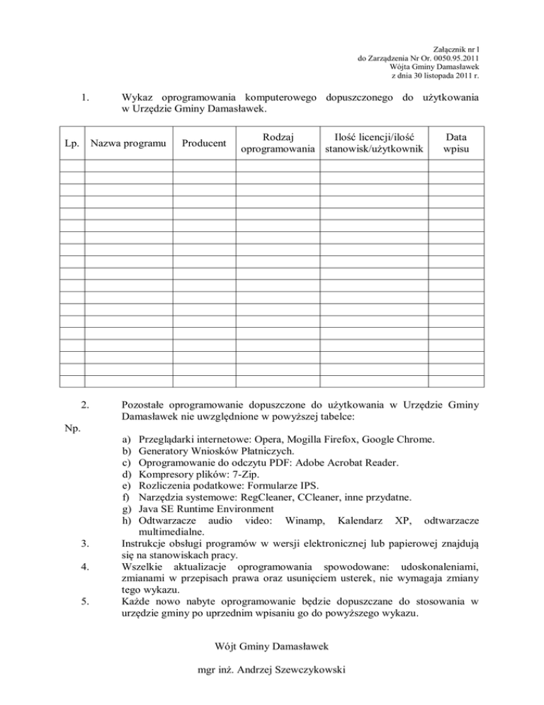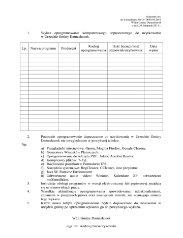 Załącznik nr l do Zarządzenia Nr Or. 0050.95.2011 Wójta Gminy Damasławek z dnia 30 listopada 2011 r. 1. Lp. Wykaz oprogramowania komputerowego dopuszczonego do użytkowania w Urzędzie Gminy Damasławek. Nazwa programu 2. Producent Rodzaj Ilość licencji/ilość oprogramowania stanowisk/użytkownik Data wpisu Pozostałe oprogramowanie dopuszczone do użytkowania w Urzędzie Gminy Damasławek nie uwzględnione w powyższej tabelce: Np. Przeglądarki internetowe: Opera, Mogilla Firefox, Google Chrome. Generatory Wniosków Płatniczych. Oprogramowanie do odczytu PDF: Adobe Acrobat Reader. Kompresory plików: 7-Zip. Rozliczenia podatkowe: Formularze IPS. Narzędzia systemowe: RegCleaner, CCleaner, inne przydatne. Java SE Runtime Environment Odtwarzacze audio video: Winamp, Kalendarz XP, odtwarzacze multimedialne. Instrukcje obsługi programów w wersji elektronicznej lub papierowej znajdują się na stanowiskach pracy. Wszelkie aktualizacje oprogramowania spowodowane: udoskonaleniami, zmianami w przepisach prawa oraz usunięciem usterek, nie wymagaja zmiany tego wykazu. Każde nowo nabyte oprogramowanie będzie dopuszczane do stosowania w urzędzie gminy po uprzednim wpisaniu go do powyższego wykazu. a) b) c) d) e) f) g) h) 3. 4. 5. Wójt Gminy Damasławek mgr inż. Andrzej Szewczykowski