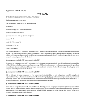Sygnatura akt IIIK 981/14 WYROK W IMIENIU RZECZYPOSPOLITEJ POLSKIEJ Dnia 15 stycznia 2015roku Sąd Rejonowy w Wałbrzychu III Wydział Karny w składzie: Przewodniczący: SSR Paweł Augustowski Protokolant: Ewa Modlińska po rozpoznaniu w dniu 15 stycznia 2015 roku sprawy P. T. córki M. i W. z domu W. urodzonej (...) w W. oskarżonej o to, że: I. w dniu 23 marca 2014 roku w W., województwie (...)działając w celu osiągnięcia korzyści majątkowej wprowadziła w błąd P. D.za pośrednictwem portalu internetowego Tablica.pl co do zamiaru wywiązania się z transakcji sprzedaży tabletu (...)Notę czym doprowadziła do niekorzystnego rozporządzenia mieniem P. D.w kwocie 355 złotych, przy czym uczyniła sobie z tego stałe źródło dochodu tj. o czyn z art. 286§1 KK w zw. z art. 65§1 KK II. w dniu 05 maja 2014 roku w W., województwie (...)działając w celu osiągnięcia korzyści majątkowej wprowadziła w błąd M. Z.za pośrednictwem portalu internetowego Tablica.pl co do zamiaru wywiązania się z transakcji sprzedaży konsoli czym doprowadziła do niekorzystnego rozporządzenia mieniem M. Z.w kwocie 1365 złotych, przy czym uczyniła sobie z tego stałe źródło dochodu tj. o czyn z art. 286§1 KK w zw. z art. 65§1 KK III. w dniu 20 stycznia 2014 roku w W., województwie (...)działając w celu osiągnięcia korzyści majątkowej wprowadziła w błąd Ł. B.za pośrednictwem portalu internetowego Tablica.pl co do zamiaru wywiązania się z transakcji sprzedaży konsoli oraz telefonu komórkowego czym doprowadziła do niekorzystnego rozporządzenia mieniem Ł. B. w kwocie 700 złotych, przy czym uczyniła sobie z tego stałe źródło dochodu tj. o czyn z art. 286§1 KK w zw. z art. 65§1 KK IV. w dniu 20 lutego 2014 roku w W., województwie (...)działając w celu osiągnięcia korzyści majątkowej wprowadziła w błąd M. G.za pośrednictwem portalu internetowego Tablica.pl co do zamiaru wywiązania się z transakcji sprzedaży konsoli czym doprowadziła do niekorzystnego rozporządzenia mieniem M. G.w kwocie 500 złotych, przy czym uczyniła sobie z tego stałe źródło dochodu tj. o czyn z art. 286§1 KK w zw. z art. 65§1 KK V. w dniu 23 lutego 2014 roku w W., województwie (...)działając w celu osiągnięcia korzyści majątkowej wprowadziła w błąd P. S.za pośrednictwem portalu internetowego Tablica.pl co do zamiaru wywiązania się z transakcji sprzedaży konsoli czym doprowadziła do niekorzystnego rozporządzenia mieniem Patryka Skorupę w kwocie 500 złotych, przy czym uczyniła sobie z tego stałe źródło dochodu tj. o czyn z art. 286§1 KK w zw. z art. 65§1 KK VI. w dniu 23 lutego 2014 roku w W., województwie (...)działając w celu osiągnięcia korzyści majątkowej wprowadziła w błąd B. T.za pośrednictwem portalu internetowego Tablica.pl co do zamiaru wywiązania się z transakcji sprzedaży telefonu komórkowego marki L. (...)czym doprowadziła do niekorzystnego rozporządzenia mieniem B. T.w kwocie 1100 złotych, przy czym uczyniła sobie z tego stałe źródło dochodu tj. o czyn z art. 286§1 KK w zw. z art. 65§1 KK VII. w dniu 15 marca 2014 roku w W., województwie (...)działając w celu osiągnięcia korzyści majątkowej wprowadziła w błąd P. P.za pośrednictwem portalu internetowego Tablica.pl co do zamiaru wywiązania się z transakcji sprzedaży konsoli czym doprowadziła do niekorzystnego rozporządzenia mieniem P. P.w kwocie 555 złotych, przy czym uczyniła sobie z tego stałe źródło dochodu tj. o czyn z art. 286§1 KK w zw. z art. 65§1 KK VIII. w dniu 11 lutego 2014 roku w W., województwie (...)działając w celu osiągnięcia korzyści majątkowej wprowadziła w błąd Aleksandrę Kwiatkowską za pośrednictwem portalu internetowego Tablica.pl co do zamiaru wywiązania się z transakcji sprzedaży konsoli czym doprowadziła do niekorzystnego rozporządzenia mieniem A. K.w kwocie 500 złotych, przy czym uczyniła sobie z tego stałe źródło dochodu tj. o czyn z art. 286§1 KK w zw. z art. 65§1 KK IX. w dniu 21 lutego 2014 roku w W., województwie (...)działając w celu osiągnięcia korzyści majątkowej wprowadziła w błąd M. B.za pośrednictwem portalu internetowego Tablica.pl co do zamiaru wywiązania się z transakcji sprzedaży wózka dziecięcego czym doprowadziła do niekorzystnego rozporządzenia mieniem M. B.w kwocie 600 złotych, przy czym uczyniła sobie z tego stałe źródło dochodu tj. o czyn z art. 286§1 KK w zw. z art. 65§1 KK X. w dniu 14 kwietnia 2014 roku w W., województwie (...)działając w celu osiągnięcia korzyści majątkowej wprowadziła w błąd W. T.za pośrednictwem portalu internetowego Tablica.pl co do zamiaru wywiązania się z transakcji sprzedaży telefonu komórkowego marki L. (...)czym doprowadziła do niekorzystnego rozporządzenia mieniem W. T.w kwocie 50 złotych, przy czym uczyniła sobie z tego stałe źródło dochodu tj. o czyn z art. 286§1 KK w zw. z art. 65§1 KK I. Oskarżoną P. T. uznaje za winną popełnienia zarzucanych jej czynów opisanych w części wstępnej wyroku, tj. występków z art. 286§1 kk w zw. z art. 65§1 kki za czyny te przy przyjęciu, że stanowią ciąg przestępstw na podstawie art. 286§1 kk w zw. z art. 65§1 kk w zw. z art. 91§1 kk wymierza jej karę 1 (jednego) roku i 6 (sześciu) miesięcy pozbawienia wolności; II. na podstawie art. 69 § 1 k.k. wykonanie orzeczonej kary warunkowo zawiesza na okres 3 (trzech ) lat próby; III. na podstawie art. 46 § 1 k.k. orzeka środek karny w postaci obowiązku naprawienia szkody poprzez zapłatę: - 700 złotych na rzecz Ł. B. - 355 złotych na rzecz P. D. - 1365 złotych na rzecz M. Z. - 500 złotych na rzecz M. G. - 500 złotych na rzecz P. S. - 1100 złotych na rzecz B. T. - 500 złotych na rzecz A. K. - 600 złotych na rzecz M. B. - 50 złotych na rzecz W. T.; IV. na podstawie art. 415§1 kpk zasądza od oskarżonej P. T.na rzecz powoda P. P.kwotę 555 złotych wraz z ustawowymi odsetkam