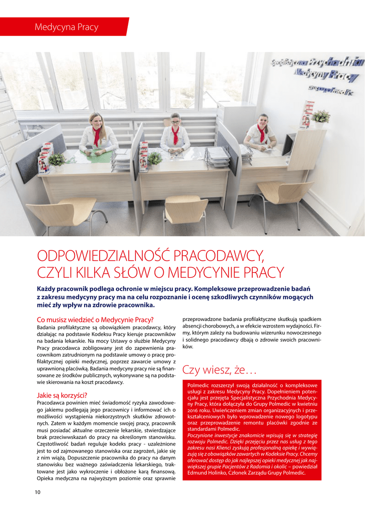 Medycyna Pracy ODPOWIEDZIALNOŚĆ PRACODAWCY, CZYLI KILKA SŁÓW O MEDYCYNIE PRACY Każdy pracownik podlega ochronie w miejscu pracy. Kompleksowe przeprowadzenie badań z zakresu medycyny pracy ma na celu rozpoznanie i ocenę szkodliwych czynników mogących mieć zły wpływ na zdrowie pracownika. Co musisz wiedzieć o Medycynie Pracy? Badania profilaktyczne są obowiązkiem pracodawcy, który działając na podstawie Kodeksu Pracy kieruje pracowników na badania lekarskie. Na mocy Ustawy o służbie Medycyny Pracy pracodawca zobligowany jest do zapewnienia pracownikom zatrudnionym na podstawie umowy o pracę profilaktycznej opieki medycznej, poprzez zawarcie umowy z uprawnioną placówką. Badania medycyny pracy nie są finansowane ze środków publicznych, wykonywane są na podstawie skierowania na koszt pracodawcy. Jakie są korzyści? Pracodawca powinien mieć świadomość ryzyka zawodowego jakiemu podlegają jego pracownicy i informować ich o możliwości wystąpienia niekorzystnych skutków zdrowotnych. Zatem w każdym momencie swojej pracy, pracownik musi posiadać aktualne orzeczenie lekarskie, stwierdzające brak przeciwwskazań do pracy na określonym stanowisku. Częstotliwość badań reguluje kodeks pracy - uzależnione jest to od zajmowanego stanowiska oraz zagrożeń, jakie się z nim wiążą. Dopuszczenie pracownika do pracy na danym stanowisku bez ważnego zaświadczenia lekarskiego, traktowane jest jako wykroczenie i obłożone karą finansową. Opieka medyczna na najwyższym poziomie oraz sprawnie 10 przeprowadzone badania profilaktyczne skutkują spadkiem absencji chorobowych, a w efekcie wzrostem wydajności. Firmy, którym zależy na budowaniu wizerunku nowoczesnego i solidnego pracodawcy dbają o zdrowie swoich pracowników. Czy wiesz, że… Polmedic rozszerzył swoją działalność o kompleksowe usługi z zakresu Medycyny Pracy. Dopełnieniem potencjału jest przejęta Specjalistyczna Przychodnia Medycyny Pracy, która dołączyła do Grupy Polmedic w kwietniu 2016 roku. Uwieńczeniem zmian organizacyjnych i przekształceniowych było wprowadzenie nowego logotypu oraz przeprowadzenie remontu placówki zgodnie ze standardami Polmedic. Poczynione inwestycje znakomicie wpisują się w strategię rozwoju Polmedic. Dzięki przejęciu przez nas usług z tego zakresu nasi Klienci zyskują profesjonalną opiekę i wywiązują się z obowiązków zawartych w Kodeksie Pracy. Chcemy oferować dostęp do jak najlepszej opieki medycznej jak największej grupie Pacjentów z Radomia i okolic – powiedział Edmund Holinko, Członek Zarządu Grupy Polmedic. foto: Łukasz Bator Jakie badania realizujemy? wstępne – przed zatrudnieniem lub po zmianie stanowiska jeżeli występują nowe czynniki szkodliwe i uciążliwe na stanowisku pracy okresowe – dla osób pracujących już na danym stanowisku lub przed zakończeniem ważności poprzedniego zaświadczenia lub wydawane w związku z pogorszeniem stanu zdrowia np. wada wzroku kontrolne – obowiązkowe przed ponownym rozpoczęciem pracy przez pracownika, który przebywał na zwolnieniu lekarskim dłużej niż 30 dni sanitarno-epidemiologiczne z wydaniem orzeczenia lub wpisem do książeczki SANEPID, dla pracowników mających kontakt z żywnością oraz nauczycieli i opiekunów ośrodków wychowawczych wysokościowe – dla pracowników pracujących na wysokości powyżej 3 metrów kierowców – badania lekarskie i psychologiczne przeznaczone dla osób kierujących pojazdami oraz kierowców zawodowych badania do Prawo Jazdy wszystkich kategorii badania kwalifikacji zawodowej min. badania do pozwolenia na broń, badania celników, pracowników ochrony, strażaków, pracowników obsługi lotniska uczniów i studentów, którzy w trakcie nauki są narażeni na działanie czynników szkodliwych, uciążliwych lub niebezpiecznych dla zdrowia badanie osób zawodowo narażonych na działanie promieniowania jonizującego Co musisz wiedzieć o szczepieniach pracowniczych? Zgodnie z Rozporządzeniem Rady Ministrów pracodawcy zobowiązani są również do informowania oraz zapewnienia możliwości wykonania szczepień pracowniczych zalecanych na ich stanowiskach pracy. W Polmedic szczepienia pracownicze wykonywane są we własnych placówkach lub podczas akcji szczepień wyjazdowych w siedzibie firmy. Warunkiem ich organizacji są: minimalna liczba chętnych wynosząca 25 osób oraz zamykane pomieszczenie biurowe. W sezonie jesienno-zimowym przeprowadzane są również akcje szczepień przeciw grypie. 11 Jak skorzystać z usług Medycyny Pracy? Badania z zakresu Medycyny Pracy realizujemy w ciągu jednego dnia na podstawie skierowania wystawionego przez pracodawcę. Na miejscu wykonujemy badania laboratoryjne, diagnostyczne oraz wymaganie konsultacje wykwalifikowanych lekarzy specjalistów (medycyny pracy, laryngologów, okulistów, neurologów). Zapisy odbywają się telefonicznie, mailowo lub osobiście w przychodni od poniedziałku do piątku od godz. 7.30. Koordynator omówi dokładnie ścieżkę realizacji skierowania oraz wyznaczy godzinę poszczególnych badań. Wzory skierowań można znaleźć na naszej stronie internetowej: www.polmedic.com.pl w zakładce Medycyna Pracy – wzory dokumentów. Zapraszamy do skorzystania z naszych usług zarówno firmy jak i klientów indywidualnych. Zaufało nam już ponad 1200 pracodawców, współpracując z nami w zakresie profilaktycznej opieki medycznej i medycyny pracy. Sposób płatności dostosujemy do indywidualnych potrzeb przedsiębiorcy: Abonament medyczny – stała miesięczna kwota oraz nielimitowana liczba badań objętych umową. Płatność za wykonane usługi – płatność tylko za wykonane badania. Do faktury zostanie załączony dokument zawierający imienną listę przebadanych osób wraz z wykazem przeprowadzonych badań. Jeśli chcesz zapoznać się ze szczegółową ofertą „Medycyna Pracy Dla Firm” skontaktuj się z Doradcą Polmedic pod adresem mailowym: [e