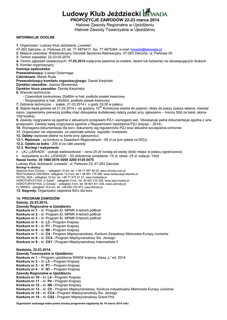 Ludowy Klub Jeździecki PROPOZYCJE ZAWODÓW 22-23 marca 2014 Halowe Zawody Regionalne w Ujeżdżeniu Halowe Zawody Towarzyskie w Ujeżdżeniu INFORMACJE OGÓLNE 1. Organizator: Ludowy Klub Jeździecki „Lewada”, 47-263 Zakrzów, ul. Parkowa 23; tel. 77 4875417, fax. 77 4875364, e-mail: [email protected] 2. Miejsce zawodów: Wielofunkcyjny Ośrodek Sportowo-Rekreacyjny, 47-263 Zakrzów, ul. Parkowa 20 3. Termin zawodów: 22-23.03.2014 4. Termin zgłoszeń ostatecznych: 17.03.2014 wyłącznie pisemne (e-mailem, faxem lub listownie) na obowiązujących drukach 5. Komitet organizacyjny: Komisja sędziowska: Przewodniczący: Łukasz Dziarmaga Członkowie: Marek Ruda Przewodniczący komitetu organizacyjnego: Daniel Karpiński Dyrektor zawodów: Joanna Skowerska Dyrektor biura zawodów: Dorota Karpińska 6. Warunki techniczne: - Czworobok konkursowy 20x60m w hali, podłoże piasek kwarcowy - Rozprężalnia w hali, 20x50m, podłoże piasek kwarcowy 7. Zebranie techniczne - piątek, 21.03.2014 r. o godz.19:30 w pałacu 00 8. Stajnie będą gotowe od 21.03.2014 r. od godziny 10 Konieczne wiadra do pojenia i żłoby do paszy (pasza własna, również siano, zapewniamy pierwszą ściółkę chęć dokupienia dodatkowej należy podać przy zgłoszeniu – trociny 50zł za balot, słoma 10zł kostka). 9. Zawody rozgrywane są zgodnie z aktualnymi przepisami PZJ i wymogami wet. Obowiązuje pełna dokumentacja zgodna z w/w. przepisami. Zawody będą rozgrywane zgodnie z Regulaminem Ujeżdżenia PZJ (edycja – 2014). 10. Wymagana dokumentacja dla koni: dokumenty wg regulaminów PZJ oraz aktualne szczepienia ochronne 11. Organizator nie odpowiada za zaistniałe szkody, wypadki i kradzieże. 12. Opłaty (wpisowe płatne na konto przy zgłoszeniu): 12.1. Wpisowe - za konkurs w Zawodach Regionalnych - 65 zł (w tym opłata na WZJ). 12.2. Opłata za boks - 200 zł za całe zawody 12.3. Noclegi i wyżywienie: LKJ „LEWADA” - pokoje wieloosobowe – cena 25 zł/ nocleg od osoby (ilość miejsc w pałacu ograniczona) wyżywienie w LKJ „LEWADA” - 55 zł/dziennie (śniadanie -15 zł, obiad -25 zł, kolacja -15zł) Nasze konto: 39 1060 0076 0000 3200 0120 0475 Ludowy Klub Jeździecki „Lewada”, ul. Parkowa 23; 47-263 Zakrzów Noclegi w okolicy: Stadnina Koni Chrósty – odległość 10 km, tel. + 48 77 487 46 22, www.chrosty.com.pl RESTAURACA DWOREK -odległość 12,5 km, tel.+ 48 501 175 396, www.restauracja-dworek.pl HOTEL ADA - odległość 12 km, tel. +48 77 472 21 21, www.hotelada.pl AGROTURYSTYKA „U Sylwii” - odległość 5 km , tel. 48 501 210 328, www.agro-sylwia.pl AGROTURYSTYKA „U Donaty” - odległość 5 km, tel. 48 601 811 334, www.udonaty.pl FLORRES - odległość 10,5 km, tel. +48 693 232 873, www.florres.pl 13. Nagrody: Organizator zapewnia flot’s dla koni. 14. PROGRAM ZAWODÓW Sobota, 22.03.2014, Zawody Regionalne w Ujeżdżeniu Konkurs nr 1 – kl. Program El. MPMK 4-letnich półfinał Konkurs nr 2 – kl. Program El. MPMK 5-letnich półfinał Konkurs nr 3 – kl. Program El. MPMK 6-letnich półfinał Konkurs nr 4 – kl. L3 - Program Krajowy Konkurs nr 5 – kl. P1 - Program Krajowy Konkurs nr 6 – kl. N6 - Program Krajowy Konkurs nr 7 – kl. C4 - Program Międzynarodowy, Konkurs Zespołowy Mistrzostw Europy Juniorów Konkurs nr 8 – kl. CC4 - Program Międzynarodowy Św. Jerzego Konkurs nr 9 – kl. CS1 - Program Międzynarodowy Intermediate II Niedziela, 22.03.2014, Zawody Towarzyskie w Ujeżdżeniu Konkurs nr 1 – Program ujeżdżenia WKKW krajowy, klasa „L” ed. 2014 Konkurs nr 2 – kl. L3 – Program Krajowy Konkurs nr 3 – kl. P1 – Program Krajowy Konkurs nr 4 – kl. N7 – Program Krajowy Zawody Regionalne w Ujeżdżeniu Konkurs nr 10 – kl. L4 - Program Krajowy Konkurs nr 11 – kl. P4 - Program Krajowy Konkurs nr 12 – kl. N8 - Program Krajowy Konkurs nr 13 – kl. C5 - Program Międzynarodowy, Konkurs Indywidualny Mistrzostw Europy Juniorów Konkurs nr 14 – kl. CC4 - Program Międzynarodowy Św. Jerzego Konkurs nr 15 – kl. CS2 - Program Międzynarodowy Grand Prix Organizator zastrzega sobie prawo zmiany programów najpóźniej do 19 marca 2014 roku Kodeks postępowania zgodnego z dobrem konia FEI wymaga, od wszystkich osób zaangażowanych w jakikolwiek sposób w międzynarodowy sport jeździecki, przestrzegania Kodeksu Postępowania z Koniem oraz uznania i zaakceptowania zasady, że dobro konia zawsze jest najważniejsze i nigdy nie może być podporządkowane rywalizacji sportowej ani wpływom komercyjnym. 1. Dobro konia jest wartością nadrzędną ponad wszelkimi innymi wymaganiami na wszystkich etapach treningu i przygotowań konia do startu w zawodach. a) Prawidłowe postępowanie z koniem Warunki stajenne, karmienie i trening muszą być zgodne z zasadami prawidłowego postępowania z koniem oraz nie mogą zaburzać jego dobrostanu. Nie będzie tolerowane jakiekolwiek postępowanie, które może spowodować cierpienie fizyczne lub psychiczne konia podczas trwania zawodów lub poza nimi. b) Metody treningowe Konie mogą być poddawane jedynie takiemu treningowi, który odpowiada ich możliwościom fizycznym i poziomowi dojrzałości do danej dyscypliny. Nie mogą być poddawane żadnym metodom szkoleniowym, które są brutalne i powodują strach, lub do których konie nie zostały odpowiednio przygotowane. c) Kucie i sprzęt Dbałość o kopyta i kucie musi spełniać wysokie standardy. Sprzęt musi być tak zaprojektowany i dopasowany, aby uniknąć ryzyka uszkodzenia ciała. d) Transport Podczas transportu konie muszą być w pełni zabezpieczone przed urazami i innymi zagrożeniami zdrowia. Pojazd musi być bezpieczny, dobrze wentylowany, utrzymany w wysokim standardzie technicznym, regularnie dezynfekowany i prowadzony przez kompetentnych kierowców. Kompetentna towarzysząca obsługa musi być zawsze gotowa do zaopiekowania się koniem. e) Przejazd Wszystkie transporty koni muszą być starannie zaplanowane. Muszą być uwzględnio