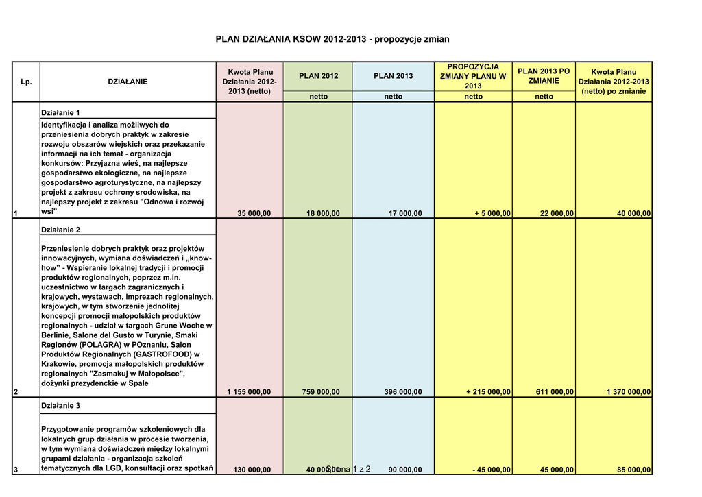 PLAN DZIAŁANIA KSOW 2012-2013 - propozycje zmian DZIAŁANIE Lp. Kwota Planu Działania 20122013 (netto) PLAN 2012 PLAN 2013 netto netto PROPOZYCJA ZMIANY PLANU W 2013 netto PLAN 2013 PO ZMIANIE netto Kwota Planu Działania 2012-2013 (netto) po zmianie Działanie 1 1 Identyfikacja i analiza możliwych do przeniesienia dobrych praktyk w zakresie rozwoju obszarów wiejskich oraz przekazanie informacji na ich temat - organizacja konkursów: Przyjazna wieś, na najlepsze gospodarstwo ekologiczne, na najlepsze gospodarstwo agroturystyczne, na najlepszy projekt z zakresu ochrony srodowiska, na najlepszy projekt z zakresu "Odnowa i rozwój wsi" 35 000,00 18 000,00 17 000,00 + 5 000,00 22 000,00 40 000,00 1 155 000,00 759 000,00 396 000,00 + 215 000,00 611 000,00 1 370 000,00 90 000,00 - 45 000,00 45 000,00 85 000,00 Działanie 2 Przeniesienie dobrych praktyk oraz projektów innowacyjnych, wymiana doświadczeń i „knowhow” - Wspieranie lokalnej tradycji i promocji produktów regionalnych, poprzez m.in. uczestnictwo w targach zagranicznych i krajowych, wystawach, imprezach regionalnych, krajowych, w tym stworzenie jednolitej koncepcji promocji małopolskich produktów regionalnych - udział w targach Grune Woche w Berlinie, Salone del Gusto w Turynie, Smaki Regionów (POLAGRA) w POznaniu, Salon Produktów Regionalnych (GASTROFOOD) w Krakowie, promocja małopolskich produktów regionalnych "Zasmakuj w Małopolsce", dożynki prezydenckie w Spale 2 Działanie 3 3 Przygotowanie programów szkoleniowych dla lokalnych grup działania w procesie tworzenia, w tym wymiana doświadczeń między lokalnymi grupami działania - organizacja szkoleń tematycznych dla LGD, konsultacji oraz spotkań 130 000,00 Strona 1 z 2 40 000,00 Działanie 4 4 4.1 4.2 4.3 Zarządzanie siecią 450 000,00 Finansowanie Małopolskiej Sieci LGD Konferencje, spotkania, seminaria, warsztaty z zakresu rozwoju obszarów wiejskich Wydawnictwa dotyczące rozwoju obszarów wiejskich, wydawnictwa/albumy/ulotki promujące działania LGD i obszar ich funkcjonowania itp., w tym m.in.: 163 000,00 287 000,00 - 172 000,00 115 000,00 278 000,00 5 000,00 10 000,00 10 000,00 5 000,00 5 000,00 165 000,00 57 000,00 108 000,00 - 58 000,00 50 000,00 107 000,00 275 000,00 101 000,00 174 000,00 - 114 000,00 60 000,00 161 000,00 Działanie 5 5 Pomoc techniczna dla współpracy międzyterytorialnej i transnarodowej - wyjazdy w celu wymiany informacji, doświadczeń i knowhow z zakresu rozwoju obszarów wiejskich wyjazdy studyjne 380 000,00 155 000,00 225 000,00 - 30 000,00 205 000,00 360 000,00 80 000,00 40 000,00 40 000,00 - 13 000,00 27 000,00 67 000,00 - 40 000,00 - - Działanie 6 6 6.1 Wspieranie współpracy międzyinstytucjonalnej, w tym międzynarodowej - współpraca regionalna i międzynarodowa z instytucjami zajmującymi się rozwojem obszarów wiejskich, w tym m.in.: Międzynarodowa Wystawa Rolnicza AGROPROMOCJA w Nawojowej SPARTAKIADA ZIMOWA partnerów KSOW 40 000,00 Działanie 7 7 Wymiana wiedzy oraz ocena polityki w zakresie rozwoju obszarów wiejskich - badania SUMA 120 000,00 2 350 000,00 120 000,00 1 175 000,00 + 30 000,00 1 175 000,00 150 000,00 150 000,00 1 175 000,00 2 350 000,00 PROPOZYCJE ZMIAN W PLANIE DZIAŁANIA W 2013 zwiększenia 1 Działanie 1 - konkursy 2 Dzialanie 2 - dożynki prezydenckie w Spale zmniejszenia 5 000,00 25 000,00 Dzialanie 2 - zamiana w 2013 promocji agroturystyki na kontynuację promocji produktów regionalnych i zwiększenie 3 kwoty 4 Działanie 6 - AGROPROMOCJA 190 000,00 27 000,00 5 Działanie 7 - badania RAZEM 30 000,00 Strona 2 z 2 277 000,00 1 Dzialanie 3 - szkolenia dla LGD Działanie 4 - spotkania, konferencje, 2 seminaria 3 Działanie 4 - Wydawnictwa 4 Działanie 5 - wyjazd studyjny LGD Działanie 6 - rezygnacja z zimowej 5 Spartakiady 2013 RAZEM 45 000,00 58 000,00 114 000,00 20 000,00 40 000,00 277 000,00