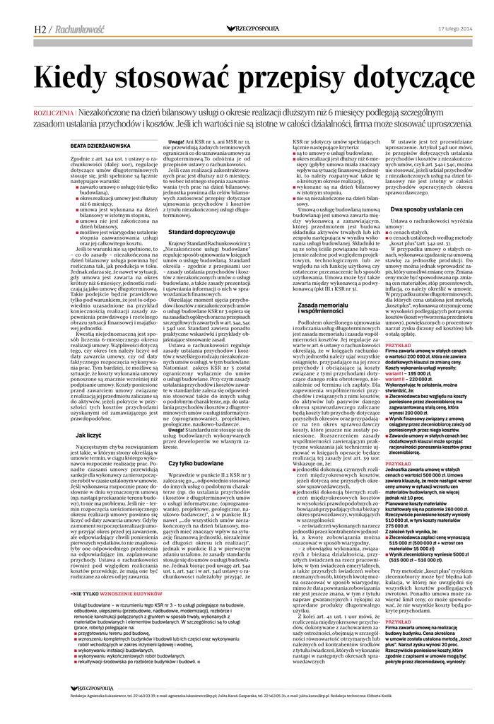 H2 / Rachunkowość 17 lutego 2014 Kiedy stosować przepisy dotyczące ROZLICZENIA | Niezakończone na dzień bilansowy usługi o okresie realizacji dłuższym niż 6 miesięcy podlegają szczególnym zasadom ustalania przychodów i kosztów. Jeśli ich wartości nie są istotne w całości działalności, firma może stosować uproszczenia. Beata Dzierżanowska Zgodnie z art. 34a ust. 1 ustawy o rachunkowości (dalej: uor), regulacje dotyczące umów długoterminowych stosuje się, jeśli spełnione są łącznie następujące warunki: ∑ zawarto umowę o usługę (nie tylko budowlaną), ∑ okres realizacji umowy jest dłuższy niż 6 miesięcy, ∑ umowa jest wykonana na dzień bilansowy w istotnym stopniu, ∑ umowa nie jest zakończona na dzień bilansowy, ∑ możliwe jest wiarygodne ustalenie stopnia zaawansowania usługi oraz jej całkowitego kosztu. Jeśli te warunki nie są spełnione, to – co do zasady – niezakończona na dzień bilansowy usługa powinna być rozliczana tak, jak produkcja w toku. Jednak zdarza się, że nawet w sytuacji, gdy umowa jest zawarta na okres krótszy niż 6 miesięcy, jednostki rozliczają ją jako umowę długoterminową. Takie podejście będzie prawidłowe tylko pod warunkiem, że jest to odpowiednio uzasadnione na przykład koniecznością realizacji zasady zapewnienia prawdziwego i rzetelnego obrazu sytuacji finansowej i majątkowej jednostki. Kwestią niejednoznaczną jest sposób liczenia 6-miesięcznego okresu realizacji umowy. Wątpliwości dotyczą tego, czy okres ten należy liczyć od daty zawarcia umowy, czy od daty faktycznego rozpoczęcia wykonywania prac. Tym bardziej, że możliwe są sytuacje, że koszty wykonania umowy ponoszone są znacznie wcześniej niż podpisanie umowy. Koszty poniesione przed zawarciem umowy związane z realizacją jej przedmiotu zaliczane są do aktywów, jeżeli pokrycie w przyszłości tych kosztów przychodami uzyskanymi od zamawiającego jest prawdopodobne. Jak liczyć Najczęstszym chyba rozwiązaniem jest takie, w którym strony określają w umowie termin, w ciągu którego wykonawca rozpocznie realizację prac. Ponadto czasami umowy przewidują sankcje dla wykonawcy za nierozpoczęcie robót w czasie ustalonym w umowie. Jeśli wykonawca rozpocznie prace dosłownie w dniu wyznaczonym umową (np. nastąpi przekazanie terenu budowy), to nie ma problemu. Jeśli nie – termin rozpoczęcia sześciomiesięcznego okresu realizacji umowy powinno się liczyć od daty zawarcia umowy. Gdyby za moment rozpoczęcia realizacji umowy przyjąć okres przed jej zawarciem, ale odpowiadający chwili poniesienia pierwszych wydatków, to nie znajdowałyby one odpowiedniego przełożenia na odpowiadające im, zaplanowane przychody. Ustawa o rachunkowości również pod względem rozliczania kosztów przewiduje, że mają one być rozliczane za okres od jej zawarcia. Uwaga! Ani KSR nr 3, ani MSR nr 11, nie przewidują żadnych terminowych ograniczeń co do uznawania umowy za długoterminową.To odróżnia je od przepisów ustawy o rachunkowości. Jeśli czas realizacji zakontraktowanych prac jest dłuższy niż 6 miesięcy, to wobec istotnego stopnia zaawansowania tych prac na dzień bilansowy. jednostka powinna dla celów bilansowych zastosować przepisy dotyczące ujmowania przychodów i kosztów z tytułu niezakończonej usługi długoterminowej. Standard doprecyzowuje Krajowy Standard Rachunkowości nr 3 „Niezakończone usługi budowlane” reguluje sposób ujmowania w księgach umów o usługę budowlaną. Standard określa – zgodnie z przepisami uor – zasady ustalania przychodów i kosztów z niezakończonych umów o usługi budowlane, a także zasady prezentacji i ujawniania informacji o nich w sprawozdaniach finansowych. Określając moment ujęcia przychodów i kosztów z niezakończonych umów o usługi budowlane KSR nr 3 opiera się na zasadach ogólnych oraz na przepisach szczegółowych zawartych w art. 34a, 34c i 34d uor. Standard zawiera ponadto praktyczne wskazówki i przykłady objaśniające stosowanie zasad. Ustawa o rachunkowości reguluje zasady ustalania przychodów i kosztów z wszelkiego rodzaju niezakończonych umów o usługi, w tym budowlane. Natomiast zakres KSR nr 3 został ograniczony wyłącznie do umów o usługi budowlane. Przy czym zasady ustalania przychodów i kosztów zawarte w standardzie zaleca się odpowiednio stosować także do innych usług o podobnym charakterze, np. do ustalania przychodów i kosztów z długoterminowych umów o usługi informatyczne (oprogramowanie), projektowe, geologiczne, naukowo-badawcze. Uwaga! Standardu nie stosuje się do usług budowlanych wykonywanych przez deweloperów we własnym zakresie. Czy tylko budowlane Wprawdzie w punkcie II.2 KSR nr 3 zaleca się go „…odpowiednio stosować do innych usług o podobnym charakterze (np. do ustalania przychodów i kosztów z długoterminowych umów o usługi informatyczne, (oprogramowanie), projektowe, geologiczne, naukowo-badawcze)”, a w punkcie II.3 nawet „…do wszystkich umów niezakończonych na dzień bilansowy, mogących mieć znaczący wpływ na sytuację finansową jednostki, niezależnie od długości okresu ich realizacji”, jednak w punkcie II.2 w pierwszym zdaniu ustalono, że zasady standardu stosuje się do umów o usługi budowlane. Jednak biorąc pod uwagę art. 34a ust. 1, art. 34c i w art. 34d ustawy o rachunkowości należałoby przyjąć, że >Nie tylko wznoszenie budynków Usługi budowlane – w rozumieniu tego KSR nr 3 – to usługi polegające na budowie, odbudowie, ulepszeniu (przebudowie, nadbudowie, modernizacji), rozbiórce i remoncie konstrukcji połączonych z gruntem w sposób trwały, wykonanych z materiałów budowlanych i elementów budowlanych. W szczególności są to usługi (prace, roboty) polegające na: ∑ przygotowaniu terenu pod budowę, ∑ wznoszeniu kompletnych budynków i budowli lub ich części oraz wykonywaniu robót wchodzących w zakres in