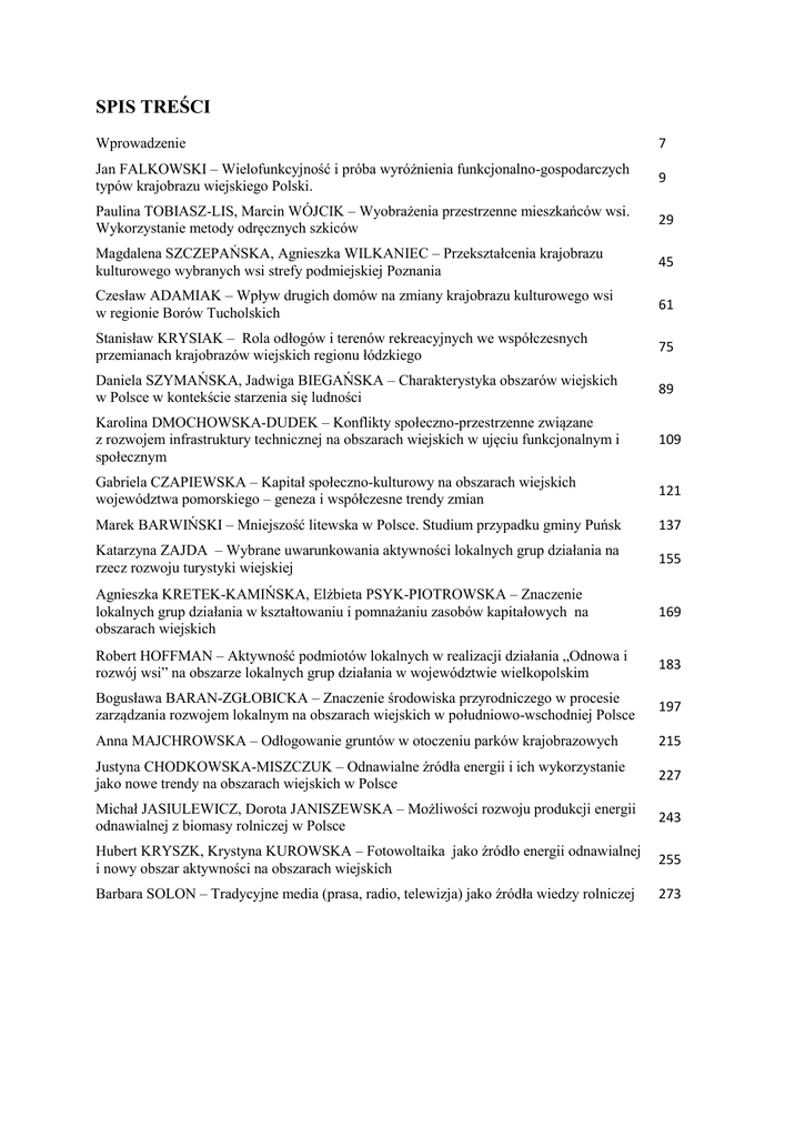 SPIS TREŚCI Wprowadzenie 7 Jan FALKOWSKI – Wielofunkcyjność i próba wyróżnienia funkcjonalno-gospodarczych typów krajobrazu wiejskiego Polski. 9 Paulina TOBIASZ-LIS, Marcin WÓJCIK – Wyobrażenia przestrzenne mieszkańców wsi. Wykorzystanie metody odręcznych szkiców 29 Magdalena SZCZEPAŃSKA, Agnieszka WILKANIEC – Przekształcenia krajobrazu kulturowego wybranych wsi strefy podmiejskiej Poznania 45 Czesław ADAMIAK – Wpływ drugich domów na zmiany krajobrazu kulturowego wsi w regionie Borów Tucholskich 61 Stanisław KRYSIAK – Rola odłogów i terenów rekreacyjnych we współczesnych przemianach krajobrazów wiejskich regionu łódzkiego 75 Daniela SZYMAŃSKA, Jadwiga BIEGAŃSKA – Charakterystyka obszarów wiejskich w Polsce w kontekście starzenia się ludności 89 Karolina DMOCHOWSKA-DUDEK – Konflikty społeczno-przestrzenne związane z rozwojem infrastruktury technicznej na obszarach wiejskich w ujęciu funkcjonalnym i społecznym 109 Gabriela CZAPIEWSKA – Kapitał społeczno-kulturowy na obszarach wiejskich województwa pomorskiego – geneza i współczesne trendy zmian 121 Marek BARWIŃSKI – Mniejszość litewska w Polsce. Studium przypadku gminy Puńsk 137 Katarzyna ZAJDA – Wybrane uwarunkowania aktywności lokalnych grup działania na rzecz rozwoju turystyki wiejskiej 155 Agnieszka KRETEK-KAMIŃSKA, Elżbieta PSYK-PIOTROWSKA – Znaczenie lokalnych grup działania w kształtowaniu i pomnażaniu zasobów kapitałowych na obszarach wiejskich 169 Robert HOFFMAN – Aktywność podmiotów lokalnych w realizacji działania „Odnowa i rozwój wsi” na obszarze lokalnych grup działania w województwie wielkopolskim 183 Bogusława BARAN-ZGŁOBICKA – Znaczenie środowiska przyrodniczego w procesie zarządzania rozwojem lokalnym na obszarach wiejskich w południowo-wschodniej Polsce 197 Anna MAJCHROWSKA – Odłogowanie gruntów w otoczeniu parków krajobrazowych 215 Justyna CHODKOWSKA-MISZCZUK – Odnawialne źródła energii i ich wykorzystanie jako nowe trendy na obszarach wiejskich w Polsce 227 Michał JASIULEWICZ, Dorota JANISZEWSKA – Możliwości rozwoju produkcji energii odnawialnej z biomasy rolniczej w Polsce 243 Hubert KRYSZK, Krystyna KUROWSKA – Fotowoltaika jako źródło energii odnawialnej i nowy obszar aktywności na obszarach wiejskich 255 Barbara SOLON – Tradycyjne media (prasa, radio, telewizja) jako źródła wiedzy rolniczej 273