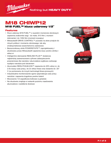 M18 CHIWP12 M18 FUEL™ klucz udarowy 1/2˝ Features • Klucz udarowy M18 FUEL™ o wysokim momencie obrotowym zapewnia znakomite osigi - do maks. 813 Nm ( moment dokrcania) i do 1354 Nm (moment zrywajcy) • Milwaukee® DRIVE CONTROL™ pozwala na atwe przejcie do rónych prdkoci i momentu obrotowego, tak aby zmaksymalizowa wszechstronno zastosowa • Bezszczotkowy silnik POWERSTATE™ zaprojektowany i zbudowany przez Milwaukee® zapewnia dusz ywotno silnika i wiksz si • Inteligentne sterowanie REDLINK PLUS™ dostarcza najbardziej zaawansowane cyfrowe zabezpieczenie przecieniowe dla narzdzia i akumulatora wyjtkowo zwikszajc wydajno narzdzia pod obcieniem • Akumulator REDLITHIUM-ION™ zapewnia do 20% wiksz si, do 2.5x duszy czas pracy, do 2x wiksz trwao oraz dziaanie do -20° C (w porównaniu do innych technologii litowo-jonowych) • Indywidualne monitorowanie ogniw optymalizuje czas pracy narzdzia i zapewnia dugotrwa ywotno baterii • Mocowanie 1/2 zapadkowo-kolkowe w gniedzie • Na obudowie znajduje si wskanik poziomu naadowania akumulatora i owietlenie diodowe P.1 of 2 RANGE SPEC (1) Poziom cinienia akustycznego (dB(A)) Błd poziomu cinienia akustycznego (dB(A)) Poziom natenia hałasu (dB(A)) Błd poziomu natenia hałasu (dB(A)) Poziom wibracji przy wkrcaniu (m/s²) Błd poziomu wibracji przy wkrcaniu (m/s²) M18 CHIWP12402C M18 CHIWP12502X M18 CHIWP12502C 94.4 94.4 94.4 3 3 3 105.4 105.4 105.4 3 3 3 11.08 11.08 11.08 1.5 1.5 1.5 Prdko bez obcienia (obr/min) 0 - 1200 / 0 - 1700 0 - 1200 / 0 - 1700 0 - 1200 / 0 - 1700 Napicie (V) Pojemno akumulatora (Ah) Typ akumulatora Czst. udaru (ud./min) 18 18 18 4.0 5.0 5.0 Li-ion Li-ion Li-ion 0 - 1700 / 0 - 2300 0 - 1700 / 0 - 2300 0 - 1700 / 0 - 2300 Opakowanie Walizka Walizka Walizka Ładowarka w wyposaeniu 80 min 59 min 100 min 2 2 2 4933446253 4933451400 4933448150 3.2 3.2 3.2 474 / 813 474 / 813 474 / 813 1354 1354 1354 Ilo akumulatorów Nazwa: Numer Artykułu Waga z akumulatorem (kg) Maks. moment dokrcania (Nm) Moment zrywajcy (Nm) P.2 of 2 RANGE SPEC (2) Poziom cinienia akustycznego (dB(A)) Błd poziomu cinienia akustycznego (dB(A)) Poziom natenia hałasu (dB(A)) Błd poziomu natenia hałasu (dB(A)) Poziom wibracji przy wkrcaniu (m/s²) Błd poziomu wibracji przy wkrcaniu (m/s²) Prdko bez obcienia (obr/min) Napicie (V) Pojemno akumulatora (Ah) Typ akumulatora Czst. udaru (ud./min) M18 CHIWP12-0 94.4 3 105.4 3 11.08 1.5 0 - 1200 / 0 - 1700 18 − Li-ion 0 - 1700 / 0 - 2300 Opakowanie − Ładowarka w wyposaeniu − Ilo akumulatorów 0 Nazwa: Numer Artykułu Waga z akumulatorem (kg) Maks. moment dokrcania (Nm) Moment zrywajcy (Nm) 4933446247 − 474 / 813 1354 P.3 of 2
