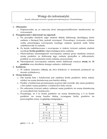 Wstęp do informatyki Zasady zaliczania ćwiczeń w grupie prowadzonej przez T.Jurdzińskiego 1. Obecności: a. Dopuszczalne są co najwyżej dwie nieusprawiedliwione nieobecności na ćwiczeniach. 2. Przygotowanie i aktywność na zajęciach a. Na początku każdych zajęć student składa deklarację określającą, które zadania z bieżącej listy potrafi rozwiązać. Prowadzący ćwiczenia wybiera osobę prezentującą rozwiązanie każdego zadania spośród osób, które zadeklarowały to zadanie. b. Za każde zadeklarowane i rozwiązane w trakcie ćwiczeń zadanie student uzyskuje liczbę punktów odpowiadającą temu zadaniu. c. Nieświadoma nieumiejętność rozwiązania zadania przez studenta oznacza utratę punktów za deklarację tego zadania (pomyłka w obliczeniach, problem ze zrozumieniem treści zadania, przeoczenie). d. Nieznajomość rozwiązania zadania mimo deklaracji oznacza utratę do 15 punktów oraz skreślenie danego zadania z deklaracji. 3. Kolokwia a. W trakcie semestru odbędą się dwa kolokwia w terminach podanych na stronie wykładowcy. 4. Ocena końcowa: a. Dla każdej listy i kolokwium jest ustalona liczba punktów, które należy zdobyć na ocenę dostateczną oraz bardzo dobrą. b. Punkty z kolokwium przemnażane są przez taki czynnik, aby suma punktów z list zadań i suma punktów z kolokwiów były równe c. Do zaliczenia ćwiczeń należy uzbierać sumę punktów na ocenę dostateczną ze wszystkich list i kolokwiów. d. Przyjmując, że d to liczba punktów na ocenę dostateczną, a b to liczba punktów na ocenę bardzo dobrą, wymagane liczby punktów na poszczególne oceny wyglądają następująco: Punkty 0 d d+r/4 d+r/2 d + 3r / 4 b gdzie r = b – d. Ocena 2 3 3.5 4 4.5 5