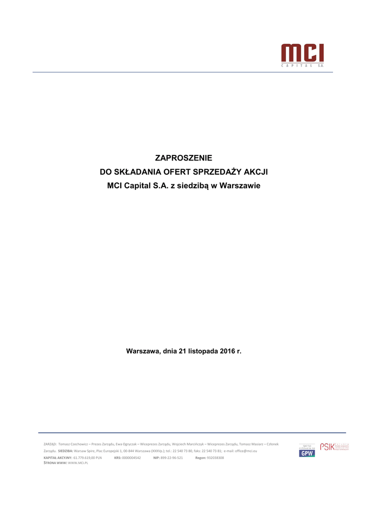 ZAPROSZENIE DO SKŁADANIA OFERT SPRZEDAŻY AKCJI MCI Capital S.A. z siedzibą w Warszawie Warszawa, dnia 21 listopada 2016 r. ZARZĄD: Tomasz Czechowicz – Prezes Zarządu, Ewa Ogryczak – Wiceprezes Zarządu, Wojciech Marcińczyk – Wiceprezes Zarządu, Tomasz Masiarz – Członek Zarządu. SIEDZIBA: Warsaw Spire, Plac Europejski 1, 00-844 Warszawa (XXXVp.); tel.: 22 540 73 80, faks: 22 540 73 81; e-mail: [email protected] KAPITAŁ AKCYJNY: 61.779.619,00 PLN STRONA WWW: WWW.MCI.PL KRS: 0000004542 NIP: 899-22-96-521 Regon: 932038308 Zaproszenie do składania ofert sprzedaży akcji MCI Capital S.A. z siedzibą w Warszawie NOTA PRAWNA Niniejsze Zaproszenie nie stanowi wezwania do zapisywania się na sprzedaż lub zamianę akcji, o którym mowa w art. 72 i następnych Ustawy o ofercie publicznej. Zaproszenie nie stanowi rekomendacji, ani porady inwestycyjnej, a jedynie zawiera opis szczegółowych warunków nabywania akcji własnych przez Spółkę. Żadne z postanowień Zaproszenia nie stanowi również jakiejkolwiek innej rekomendacji, porady prawnej lub podatkowej, ani też nie jest wskazaniem, iż jakakolwiek inwestycja lub strategia jest odpowiednia w indywidualnej sytuacji osoby lub podmiotu, który zamierza skorzystać z Zaproszenia. Zaproszenie nie stanowi oferty w rozumieniu art. 66 Kodeksu cywilnego, w tym nie stanowi oferty zakupu, nie zachęca ani nie nakłania do złożenia oferty sprzedaży akcji Spółki w żadnym systemie prawnym, w którym składanie tego rodzaju oferty, zachęcanie lub nakłanianie do sprzedaży papierów wartościowych, bądź adresowanie takich czynności do określonych osób byłoby niezgodne z prawem lub wymagałoby jakichkolwiek zezwoleń, powiadomień lub rejestracji. Zaproszenie podlega realizacji wyłącznie na terytorium Rzeczypospolitej Polskiej. Poza granicami Rzeczypospolitej Polskiej Zaproszenie nie może być traktowane jako podstawa do realizacji czynności w nim wskazanych. Akcje objęte Zaproszeniem nie były przedmiotem rejestracji, zatwierdzenia lub notyfikacji w jakimkolwiek państwie poza Rzeczpospolitą Polską, a w szczególności zgodnie z przepisami amerykańskiej ustawy o papierach wartościowych z 1933 r. ze zmianami [ang. Securities Act of 1933, as amended]. Zaproszenie – z uwagi na brak takiego wymogu – nie zostało zatwierdzone przez żaden sąd, urząd, organ lub instytucję, w tym przez Komisję Nadzoru Finansowego lub Giełdę Papierów Wartościowych w Warszawie S.A., ani nie będzie przedmiotem ubiegania się o rejestrację lub o zatwierdzenie przez jakikolwiek sąd, urząd, organ lub instytucję. Podmiotem pośredniczącym w realizacji programu nabywania przez Spółkę akcji własnych jest dom maklerski Noble Securities S.A. z siedzibą w Warszawie (adres: 01-208 Warszawa, ul. Przyokopowa 33). Osoby i podmioty zainteresowane sprzedażą akcji, o których mowa w Zaproszeniu, powinny we własnym zakresie zapoznać się szczegółowo z treścią Zaproszenia oraz z publicznie dostępnymi informacjami dotyczącymi Spółki i wyemitowanych przez Spółkę akcji, w szczególności z raportami bieżącymi i okresowymi Spółki, a także dokładnie przeanalizować i ocenić informacje zawarte w Zaproszeniu oraz inne publicznie dostępne informacje o Spółce i wyemitowanych przez nią akcjach, a ich decyzja odnośnie sprzedaży akcji Spółki powinna być oparta na takiej analizie, jaką sami uznają za stosowną. Ani Spółka, ani Noble Securities S.A. nie ponoszą odpowiedzialności za efekty i skutki decyzji podjętych na podstawie Zaproszenia lub jakiejkolwiek informacji w nim zawartej. Odpowiedzialność za decyzje podjęte na podstawie Zaproszenia ponoszą wyłącznie osoby lub podmioty z niego korzystające, w szczególności podejmujące decyzję o złożeniu wobec Spółki oferty sprzedaży wyemitowanych przez Spółkę akcji będących przedmiotem Zaproszenia albo powstrzymujące się od podjęcia takiej decyzji. Ani Spółka, ani Noble Securities S.A. nie składają żadnych oświadczeń odnoszących się do kwestii podatkowych, które mogłyby być związane z płatnościami lub otrzymywaniem środków finansowych związanych z akcjami będącymi przedmiotem niniejszego Zaproszenia lub jakimkolwiek świadczeniem Spółki. Wskazane jest, aby każdy Akcjonariusz rozważający sprzedaż akcji, o których mowa w Zaproszeniu, zasięgnął porady profesjonalnego konsultanta w tym zakresie i we wszelkich innych aspektach związanych z akcjami będącymi przedmiotem niniejszego Zaproszenia. Noble Securities S.A. świadczy lub może świadczyć w przyszłości różnego rodzaju usługi maklerskie, w tym na rzecz Spółki, w związku z czym mogą, ale nie muszą wystąpić sytuacje mogące prowadzić do potencjalnych lub rzeczywistych konfliktów interesów, które mogłyby się wiązać z ryzykiem naruszenia interesów potencjalnych zbywców akcji będących przedmiotem Zaproszenia. Treść Zaproszenia została podana przez Spółkę do publicznej wiadomości w raporcie bieżącym nr 104 z dnia 21 listopada 2016 roku i jest dostępna na stronie internetowej Spółki pod adresem: www.mci.pl. W okresie przyjmowania ofert sprzedaży treść Zaproszenia będzie również dostępna na stronie internetowej Domu Maklerskiego pod adresem www.noblesecurities.pl w zakładce Bankowość inwestycyjna. Strona | 2 Zaproszenie do składania ofert sprzedaży akcji MCI Capital S.A. z siedzibą w Warszawie I. 1.1. DEFINICJE Jeżeli z treści Zaproszenia nie wynika wyraźnie inaczej, zastosowane w Zaproszeniu, pojęcia pisane wielką literą mają następujące znaczenie: „Akcje” oznacza akcje na okaziciela (wszelkich serii), o wartości nominalnej 1,00 zł (jeden złoty) każda, wyemitowane przez Spółkę, zdematerializowane i oznaczone kodem ISIN PLMCIMG00012 nadanym przez KDPW, wprowadzone do obrotu na rynku regulowanym prowadzonym przez GPW, które Spółka zamierza nabyć za pośrednictwem Domu Maklerskiego w liczbie, za cenę