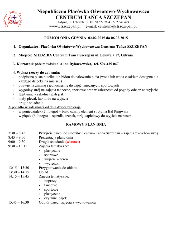 Niepubliczna Placówka Oświatowo-Wychowawcza CENTRUM TAŃCA SZCZEPAN Gdynia, ul. Lelewela 17, tel. 58 622 76 43, 502 547 479 www.ctszczepan.pl e-mail: [email protected] PÓŁKOLONIA GDYNIA 02.02.2015 do 06.02.2015 1. Organizator: Placówka Oświatowo-Wychowawcza Centrum Tańca SZCZEPAN 2. Miejsce: SIEDZIBA Centrum Tańca Szczepan ul. Lelewela 17, Gdynia 3. Kierownik półzimowiska: Alina Rykaczewska, tel. 504 435 047 4. Wykaz rzeczy do zabrania: • podpisana pusta butelka lub bidon do nalewania picia (woda lub woda z sokiem dostępna dla każdego dziecka na miejscu) • obuwie na zmianę i jednocześnie do zajęć tanecznych, sportowych • wygodny strój na zajęcia taneczne, sportowe oraz w zależności od pogody odzież na wyjście • legitymacja szkolna (jeśli jest) • mały plecak lub torba na wyjścia • drugie śniadanie A ponadto w zależności od dnia dzieci zabierają: • w poniedziałek (2. lutego) – biało czarny element stroju na Bal Pingwina • w piątek (6. lutego) – ręcznik, czepek, strój kąpielowy do wyjścia na basen RAMOWY PLAN DNIA 7:30 – 8:45 8:45 – 9:00 9:00 – 9:30 9:30 – 13:15 13:15 – 13:30 13:30 – 14:15 14:15 – 15:45 15.45 – 16.30 Przyjście dzieci do siedziby Centrum Tańca Szczepan – zajęcia z wychowawcą Prezentacja planu dnia Drugie śniadanie (własne!) Zajęcia tematyczne: • plastyczne • sportowe • wyjście w teren • wycieczki Przygotowanie do obiadu Obiad Zajęcia tematyczne: • imprezy • taneczne • sportowe • plastyczne • czytanie bajek Odbiór dzieci, zajęcia z wychowawcą