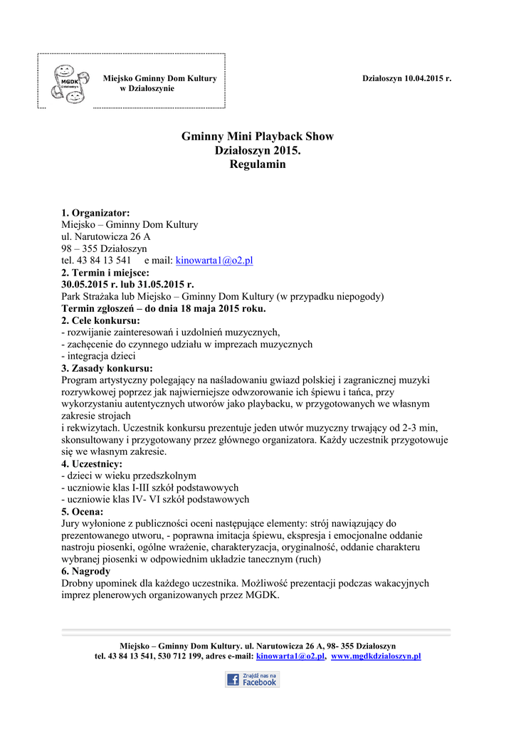 Miejsko Gminny Dom Kultury w Działoszynie Działoszyn 10.04.2015 r. Gminny Mini Playback Show Działoszyn 2015. Regulamin 1. Organizator: Miejsko – Gminny Dom Kultury ul. Narutowicza 26 A 98 – 355 Działoszyn tel. 43 84 13 541 e mail: [email protected] 2. Termin i miejsce: 30.05.2015 r. lub 31.05.2015 r. Park Strażaka lub Miejsko – Gminny Dom Kultury (w przypadku niepogody) Termin zgłoszeń – do dnia 18 maja 2015 roku. 2. Cele konkursu: - rozwijanie zainteresowań i uzdolnień muzycznych, - zachęcenie do czynnego udziału w imprezach muzycznych - integracja dzieci 3. Zasady konkursu: Program artystyczny polegający na naśladowaniu gwiazd polskiej i zagranicznej muzyki rozrywkowej poprzez jak najwierniejsze odwzorowanie ich śpiewu i tańca, przy wykorzystaniu autentycznych utworów jako playbacku, w przygotowanych we własnym zakresie strojach i rekwizytach. Uczestnik konkursu prezentuje jeden utwór muzyczny trwający od 2-3 min, skonsultowany i przygotowany przez głównego organizatora. Każdy uczestnik przygotowuje się we własnym zakresie. 4. Uczestnicy: - dzieci w wieku przedszkolnym - uczniowie klas I-III szkół podstawowych - uczniowie klas IV- VI szkół podstawowych 5. Ocena: Jury wyłonione z publiczności oceni następujące elementy: strój nawiązujący do prezentowanego utworu, - poprawna imitacja śpiewu, ekspresja i emocjonalne oddanie nastroju piosenki, ogólne wrażenie, charakteryzacja, oryginalność, oddanie charakteru wybranej piosenki w odpowiednim układzie tanecznym (ruch) 6. Nagrody Drobny upominek dla każdego uczestnika. Możliwość prezentacji podczas wakacyjnych imprez plenerowych organizowanych przez MGDK. Miejsko – Gminny Dom Kultury. ul. Narutowicza 26 A, 98- 355 Działoszyn tel. 43 84 13 541, 530 712 199, adres e-mail: [email protected], www.mgdkdzialoszyn.pl