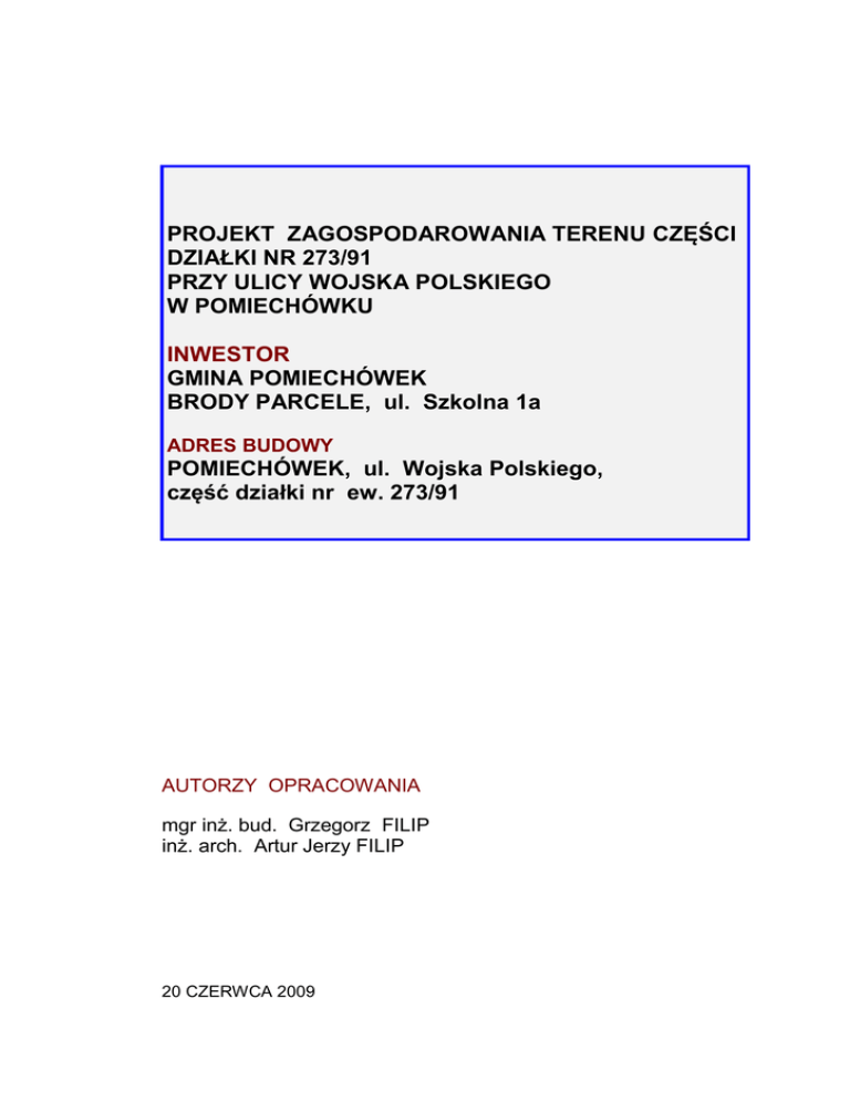 PROJEKT ZAGOSPODAROWANIA TERENU CZĘŚCI DZIAŁKI NR 273/91 PRZY ULICY WOJSKA POLSKIEGO W POMIECHÓWKU INWESTOR GMINA POMIECHÓWEK BRODY PARCELE, ul. Szkolna 1a ADRES BUDOWY POMIECHÓWEK, ul. Wojska Polskiego, część działki nr ew. 273/91 AUTORZY OPRACOWANIA mgr inż. bud. Grzegorz FILIP inż. arch. Artur Jerzy FILIP 20 CZERWCA 2009 SPIS TREŚCI ZAŁĄCZNIKI FORMALNO – PRAWNE - kopia uprawnień projektanta - kopia zaświadczenia projektanta o przynależności do Izb Inżynierów Budownictwa - oświadczenie projektanta - informacja BIOZ - opis techniczny - opinia ZUD nr 052-62/2009 - mapa do celów projektowych – załącznik graficzny do opinii ZUD RYSUNKI 1. Projekt zagospodarowania działki 2. Zakres opracowania 3. Rodzaje nawierzchni 4. Układ zieleni 5. Projekt zagospodarowania terenu 6. Przekrój A-A 7 Przekrój B-B 8. Przekrój C-C 9. Ściana oporowa 10. Ściana oporowa – konstrukcja 11. Murek ogrodzeniowy 12. Mostek 13. Mostek – konstrukcja 14. Detal balustrady – aksonometria 15. Balustrada – detale 16. Balustrada – elementy 17. Balustrada – elementy 18. Chodnik na gruncie 19. Chodnik na mostku 20. Chodnik na mostku 1:500 1:500 1:500 1:200 1:50 1:100 1:100 1:100 1:50 1:20 1:50 1:50 1:20 1:10 1:20 1:5 1:10 1:10 1:10 strona 2 strona strona strona strona strona strona 4 5 6 10 23a 23b strona 24 25 26 27 28 29 30 31 32 33 34 35 36 37 38 39 40 41 42 43 OŚWIADCZENIE NINIEJSZYM OŚWIADCZA SIĘ, ŻE PROJEKT ZAGOSPODAROWANIA TERENU DZIAŁKI PRZY ULICY WOJSKA POLSKIEGO W POMIECHÓWKU WYKONANY ZOSTAŁ ZGODNIE Z OBOWIĄZUJĄCYMI PRZEPISAMI ORAZ ZASADAMI WIEDZY TECHNICZNEJ. INFORMACJA DOTYCZĄCA BEZPIECZEŃSTWA I OCHRONY ZDROWIA Nazwa obiektu: Teren rekreacyjny Pomiechówek, ul. Wojska Polskiego Inwestor: Gmina Pomiechówek ul. Szkolna 1A Brody – Parcele 05-180 Pomiechówek, Informacja dotycząca bezpieczeństwa i ochrony zdrowia 1. Zakres robót - roboty ziemne - roboty betonowe - roboty zbrojarskie - roboty murarskie i tynkarskie - roboty drogowe - roboty transportowe poziome i pionowe 2. Wykaz istniejących obiektów budowlanych : - na działce nie ma innych obiektów budowlanych 3. Elementy zagospodarowania terenu mogące stanowić zagrożenia: Droga – ruch samochodów 4. Przewidywane zagrożenia występujące podczas realizacji robót budowlanych oraz środki zapobiegające niebezpieczeństwom: Pracownicy zatrudnieni na budowie są narażeni na wpływy warunków atmosferycznych, przeciągi, wilgoć, brak higieny, zagrzybienie odzieży itp. Aby zapewnić pracownikom warunki socjalne i higieniczno-sanitarne należy przewidzieć dla nich pomieszczenie do spożywania posiłków, szatnię wraz z suszarnią odzieży roboczej oraz pomieszczenia higieniczno sanitarne w tym WC i do umycia się. Usytuowanie stanowisk pracy w budowanym budynku może powodować wzajemne kolizje pomiędzy rodzajami prowadzonych robót. Kolizje takie mogą prowadzić do wypadków przy pracy a nawet do katastrof. Stan ten wymaga opracowania: - harmonogramów prowadzonych prac gwarantujących ludziom bezpieczeństwo, - wzajemnego usytuowania stanowisk roboczych i ich rodzajów oraz lokalizacji składowisk materiałów w sposób nie powodujący wzajemnych kolizji, - usytuowania i poprowadzenia dróg komunikacyjnych w sposób bezpieczny zarówno dla pracowników budowlanych jak i dla pracowników remontowanego obiektu. Instalacje i urządzenia elektroenergetyczne użytkowane do zasilania urządzeń służących do produkcji budowlanej, mogą poprzez wadliwe prowadzenie przewodów lub przez niedbale wyłączanie zasilania, powodować porażenia prądem elektrycznym. Stan ten wymaga: -bezpiecznego poprowadzenia przewodów elektrycznych poprzez drogi komunikacyjne i transportowe wraz z przewidywanymi zabezpieczeniami od porażeń. Należy tu przewidzieć bezpieczne metody zabezpieczania przewodów leżących na posadzkach, lub metody podwieszania przewodów na konstrukcjach tak aby leżące na ziemi nie powodowały zagrożeń. Układanie przewodów na wysokości powyżej 1 m wymaga aby przewidziano zabezpieczenia dla elektryków układających te kable, w tym np. stosowanie szelek bezpieczeństwa z jednoczesnym przewidzeniem miejsc na uchwyty do karabińczyków od tych szelek. Należy także przewidzieć bezpieczne metody wyłączania zasilania sieci energetycznej, które wykluczą możliwość przypadkowego włączenia sieci w czasie trwania prac na przewodzie elektrycznym. Roboty na wysokości tj. powyżej 1 m mogą powodować zagrożenie upadku osób z wysokości lub spadnięcia w dół przedmiotów, z pomostu wzniesionego ponad poziom. Roboty takie będą występowały przy pracach murowych, ciesielskich, zbrojarskich, szalunkowych, pokrywczych, przy pracach tynkarskich i malarskich, przy układaniu przewodów instalacji elektrycznych, montażu pomostów rusztowań. Prace takie powinny zależnie od ich charakteru być prowadzone przy użyciu odpowiedniego sprzętu jak np. inwentaryzowane rusztowania stojakowe lub przejezdne albo sprzęt ochronny indywidualnego bezpieczeństwa taki jak np. szelki bezpieczeństwa. W przypadku wyboru zabezpieczeń przed upadkiem z wysokości w postaci szelek bezpieczeństwa, konieczne będzie ustalenie, przez osoby kierujące pracownikami na budowie, aby z góry przewidziały, wybrały, zorganizowały lub nakazały wykonać uchwyty, do których będą przypisane karabińczyki szelek bezpieczeństwa osób wykonujących prace na wysokości. a) b) c) d) e) f) g) h) Zamiast pojedynczych uchwytów, wolno stosować liny, poziomo rozciągnięte pomiędzy elementami istniejących konstrukcji nośnych. Wytrzymałość i sposób mocowania powyższych uchwytów lub lin powinny uwzględniać obciążenia dynamiczne wywołane spadającym człowiekiem. Roboty przewidziane projektem nie mogą być prowadzone z drabin przystawnych, opartych o ścianę i używanych bez mocowań stabilizujących ich położenie Ponadto nie wolno wykonywać robót na wysokości przy użyciu drabin wszęd