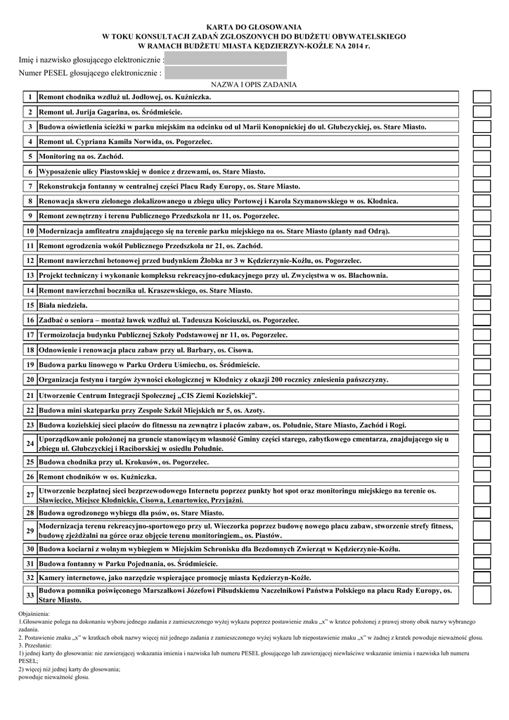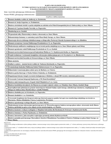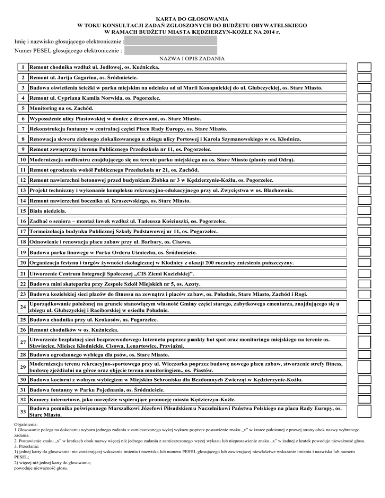 KARTA DO GŁOSOWANIA W TOKU KONSULTACJI ZADAŃ ZGŁOSZONYCH DO BUDŻETU OBYWATELSKIEGO W RAMACH BUDŻETU MIASTA KĘDZIERZYN-KOŹLE NA 2014 r. Imię i nazwisko głosującego elektronicznie : Numer PESEL głosującego elektronicznie : NAZWA I OPIS ZADANIA 1 Remont chodnika wzdłuż ul. Jodłowej, os. Kuźniczka. 2 Remont ul. Jurija Gagarina, os. Śródmieście. 3 Budowa oświetlenia ścieżki w parku miejskim na odcinku od ul Marii Konopnickiej do ul. Głubczyckiej, os. Stare Miasto. 4 Remont ul. Cypriana Kamila Norwida, os. Pogorzelec. 5 Monitoring na os. Zachód. 6 Wyposażenie ulicy Piastowskiej w donice z drzewami, os. Stare Miasto. 7 Rekonstrukcja fontanny w centralnej części Placu Rady Europy, os. Stare Miasto. 8 Renowacja skweru zielonego zlokalizowanego u zbiegu ulicy Portowej i Karola Szymanowskiego w os. Kłodnica. 9 Remont zewnętrzny i terenu Publicznego Przedszkola nr 11, os. Pogorzelec. 10 Modernizacja amfiteatru znajdującego się na terenie parku miejskiego na os. Stare Miasto (planty nad Odrą). 11 Remont ogrodzenia wokół Publicznego Przedszkola nr 21, os. Zachód. 12 Remont nawierzchni betonowej przed budynkiem Żłobka nr 3 w Kędzierzynie-Koźlu, os. Pogorzelec. 13 Projekt techniczny i wykonanie kompleksu rekreacyjno-edukacyjnego przy ul. Zwycięstwa w os. Blachownia. 14 Remont nawierzchni bocznika ul. Kraszewskiego, os. Stare Miasto. 15 Biała niedziela. 16 Zadbać o seniora – montaż ławek wzdłuż ul. Tadeusza Kościuszki, os. Pogorzelec. 17 Termoizolacja budynku Publicznej Szkoły Podstawowej nr 11, os. Pogorzelec. 18 Odnowienie i renowacja placu zabaw przy ul. Barbary, os. Cisowa. 19 Budowa parku linowego w Parku Orderu Uśmiechu, os. Śródmieście. 20 Organizacja festynu i targów żywności ekologicznej w Kłodnicy z okazji 200 rocznicy zniesienia pańszczyzny. 21 Utworzenie Centrum Integracji Społecznej „CIS Ziemi Kozielskiej”. 22 Budowa mini skateparku przy Zespole Szkół Miejskich nr 5, os. Azoty. 23 Budowa kozielskiej sieci placów do fitnessu na zewnątrz i placów zabaw, os. Południe, Stare Miasto, Zachód i Rogi. 24 Uporządkowanie położonej na gruncie stanowiącym własność Gminy części starego, zabytkowego cmentarza, znajdującego się u zbiegu ul. Głubczyckiej i Raciborskiej w osiedlu Południe. 25 Budowa chodnika przy ul. Krokusów, os. Pogorzelec. 26 Remont chodników w os. Kuźniczka. 27 Utworzenie bezpłatnej sieci bezprzewodowego Internetu poprzez punkty hot spot oraz monitoringu miejskiego na terenie os. Sławięcice, Miejsce Kłodnickie, Cisowa, Lenartowice, Przyjaźni. 28 Budowa ogrodzonego wybiegu dla psów, os. Stare Miasto. 29 Modernizacja terenu rekreacyjno-sportowego przy ul. Wieczorka poprzez budowę nowego placu zabaw, stworzenie strefy fitness, budowę zjeżdżalni na górce oraz objęcie terenu monitoringiem., os. Piastów. 30 Budowa kociarni z wolnym wybiegiem w Miejskim Schronisku dla Bezdomnych Zwierząt w Kędzierzynie-Koźlu. 31 Budowa fontanny w Parku Pojednania, os. Śródmieście. 32 Kamery internetowe, jako narzędzie wspierające promocję miasta Kędzierzyn-Koźle. 33 Budowa pomnika poświęconego Marszałkowi Józefowi Piłsudskiemu Naczelnikowi Państwa Polskiego na placu Rady Europy, os. Stare Miasto. Objaśnienia: 1.Głosowanie polega na dokonaniu wyboru jednego zadania z zamieszczonego wyżej wykazu poprzez postawienie znaku „x” w kratce położonej z prawej strony obok nazwy wybranego zadania. 2. Postawienie znaku „x” w kratkach obok nazwy więcej niż jednego zadania z zamieszczonego wyżej wykazu lub niepostawienie znaku „x” w żadnej z kratek powoduje nieważność głosu. 3. Przesłanie: 1) jednej karty do głosowania: nie zawierającej wskazania imienia i nazwiska lub numeru PESEL głosującego lub zawierającej niewłaściwe wskazanie imienia i nazwiska lub numeru PESEL; 2) więcej niż jednej karty do głosowania; powoduje nieważność głosu.