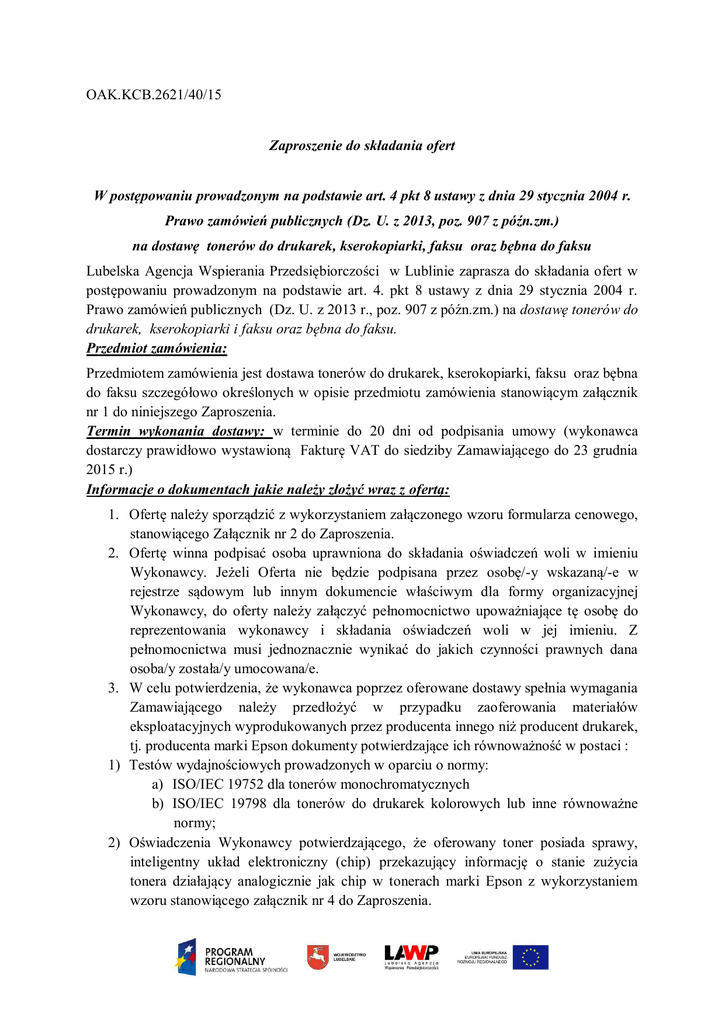OAK.KCB.2621/40/15 Zaproszenie do składania ofert W postępowaniu prowadzonym na podstawie art. 4 pkt 8 ustawy z dnia 29 stycznia 2004 r. Prawo zamówień publicznych (Dz. U. z 2013, poz. 907 z późn.zm.) na dostawę tonerów do drukarek, kserokopiarki, faksu oraz bębna do faksu Lubelska Agencja Wspierania Przedsiębiorczości w Lublinie zaprasza do składania ofert w postępowaniu prowadzonym na podstawie art. 4. pkt 8 ustawy z dnia 29 stycznia 2004 r. Prawo zamówień publicznych (Dz. U. z 2013 r., poz. 907 z późn.zm.) na dostawę tonerów do drukarek, kserokopiarki i faksu oraz bębna do faksu. Przedmiot zamówienia: Przedmiotem zamówienia jest dostawa tonerów do drukarek, kserokopiarki, faksu oraz bębna do faksu szczegółowo określonych w opisie przedmiotu zamówienia stanowiącym załącznik nr 1 do niniejszego Zaproszenia. Termin wykonania dostawy: w terminie do 20 dni od podpisania umowy (wykonawca dostarczy prawidłowo wystawioną Fakturę VAT do siedziby Zamawiającego do 23 grudnia 2015 r.) Informacje o dokumentach jakie należy złożyć wraz z ofertą: 1. Ofertę należy sporządzić z wykorzystaniem załączonego wzoru formularza cenowego, stanowiącego Załącznik nr 2 do Zaproszenia. 2. Ofertę winna podpisać osoba uprawniona do składania oświadczeń woli w imieniu Wykonawcy. Jeżeli Oferta nie będzie podpisana przez osobę/-y wskazaną/-e w rejestrze sądowym lub innym dokumencie właściwym dla formy organizacyjnej Wykonawcy, do oferty należy załączyć pełnomocnictwo upoważniające tę osobę do reprezentowania wykonawcy i składania oświadczeń woli w jej imieniu. Z pełnomocnictwa musi jednoznacznie wynikać do jakich czynności prawnych dana osoba/y została/y umocowana/e. 3. W celu potwierdzenia, że wykonawca poprzez oferowane dostawy spełnia wymagania Zamawiającego należy przedłożyć w przypadku zaoferowania materiałów eksploatacyjnych wyprodukowanych przez producenta innego niż producent drukarek, tj. producenta marki Epson dokumenty potwierdzające ich równoważność w postaci : 1) Testów wydajnościowych prowadzonych w oparciu o normy: a) ISO/IEC 19752 dla tonerów monochromatycznych b) ISO/IEC 19798 dla tonerów do drukarek kolorowych lub inne równoważne normy; 2) Oświadczenia Wykonawcy potwierdzającego, że oferowany toner posiada sprawy, inteligentny układ elektroniczny (chip) przekazujący informację o stanie zużycia tonera działający analogicznie jak chip w tonerach marki Epson z wykorzystaniem wzoru stanowiącego załącznik nr 4 do Zaproszenia. Kryteria wyboru oferty: Zamawiający wybierze najkorzystniejszą spośród ofert wykonawców, którzy zaoferują tonery do drukarek zgodne z opisem przedmiotu zamówienia. Przy wyborze oferty zostanie zastosowane kryterium 100% cena oferty. Termin oraz sposób złożenia oferty: 1) Ofertę należy złożyć do dnia 2 grudnia 2015 r. do godziny 12:00 (oferty niekompletne oraz złożone po terminie nie będą rozpatrywane). 2) Ofertę można złożyć wg wyboru: a) za pośrednictwem poczty elektronicznej: [email protected] b) pocztą/pocztą kurierska ( adres: Lubelska Agencja Wspierania Przedsiębiorczości w Lublinie, ul. Wojciechowska 9a 20-704 Lublin) c) osobiście w Kancelarii Ogólnej LAWP w Lublinie (adres jw.) 3) w przypadku składania oferty w sposób określony w pkt 2 lit. b lub lit. c, ofertę należy spiąć/zszyć (lub połączyć w inny sposób uniemożliwiający zdekompletowanie składanych dokumentów) i złożyć w kopercie lub innym opakowaniu, którą/które należy opisać: (nazwa i adres Wykonawcy) „Oferta w postępowaniu prowadzonym na podstawie art. 4 pkt 8 ustawy z dnia 29 stycznia 2004 r. Prawo zamówień publicznych na dostawę tonerów do drukarek, kserokopiarki, faksu oraz bębna do faksu. Dostarczyć do dnia 2 grudnia 2015 r. do godz. 12:00, do Kancelarii Ogólnej LAWP w Lublinie ul. Wojciechowska 9a, 20-704 Lublin” Informacja o wyborze oferty: O wyborze najkorzystniejszej oferty, Zamawiający poinformuje Wykonawców, którzy złożyli oferty, za pośrednictwem poczty elektronicznej (pod adres wskazany w ofercie). Załączniki: 1. 2. 3. 4. Opis przedmiotu zamówienia Wzór formularza cenowego Wzór umowy Wzór oświadczenia dotyczącego chipa W przypadku pytań dotyczących przedmiotowego zamówienia należy się kontaktować z: Panem Szymonem Sułkowskim (tel. 81 462 38 88)