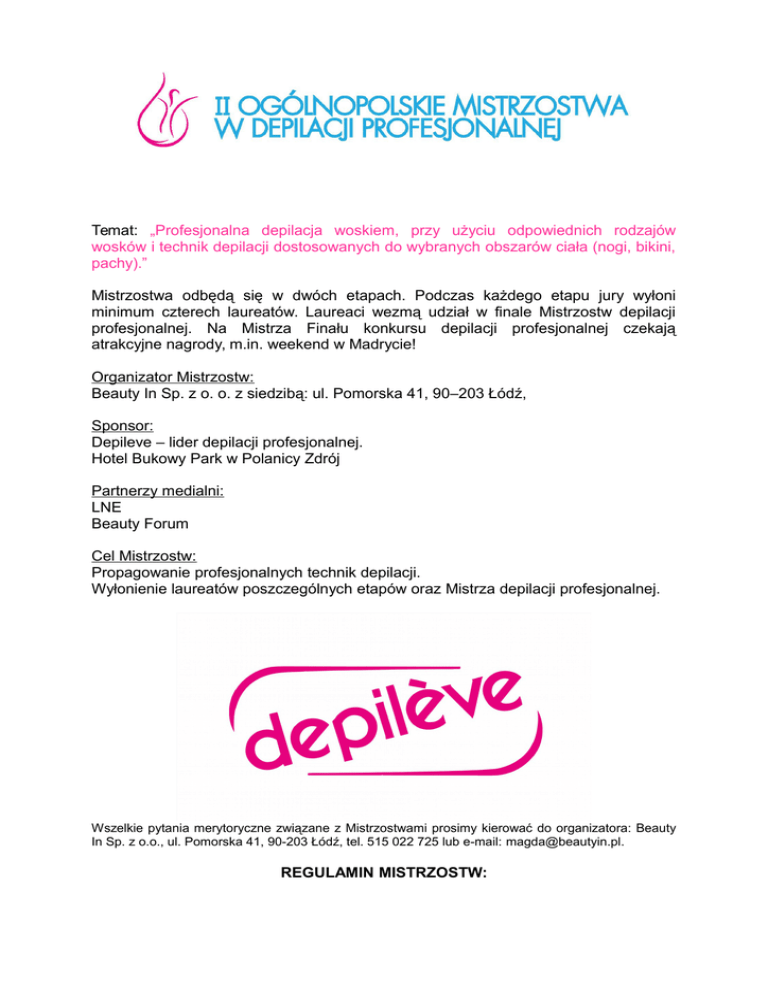 Temat: „Profesjonalna depilacja woskiem, przy użyciu odpowiednich rodzajów wosków i technik depilacji dostosowanych do wybranych obszarów ciała (nogi, bikini, pachy).” Mistrzostwa odbędą się w dwóch etapach. Podczas każdego etapu jury wyłoni minimum czterech laureatów. Laureaci wezmą udział w finale Mistrzostw depilacji profesjonalnej. Na Mistrza Finału konkursu depilacji profesjonalnej czekają atrakcyjne nagrody, m.in. weekend w Madrycie! Organizator Mistrzostw: Beauty In Sp. z o. o. z siedzibą: ul. Pomorska 41, 90–203 Łódź, Sponsor: Depileve – lider depilacji profesjonalnej. Hotel Bukowy Park w Polanicy Zdrój Partnerzy medialni: LNE Beauty Forum Cel Mistrzostw: Propagowanie profesjonalnych technik depilacji. Wyłonienie laureatów poszczególnych etapów oraz Mistrza depilacji profesjonalnej. Wszelkie pytania merytoryczne związane z Mistrzostwami prosimy kierować do organizatora: Beauty In Sp. z o.o., ul. Pomorska 41, 90-203 Łódź, tel. 515 022 725 lub e-mail: [email protected]. REGULAMIN MISTRZOSTW: Pierwszy etap Mistrzostw odbędzie się na 30. Międzynarodowym Kongresie i Targach Kosmetycznych LNE & SPA w Krakowie (15-16.11.2014r., w Międzynarodowym Centrum TargowoKongresowym EXPO Kraków). Zgłoszenia do I etapu przyjmowane są do dnia 10.11.2014r. Drugi etap Mistrzostw odbędzie się na 18. Międzynarodowych Targach Beauty Forum w Warszawie (7-8.03.2014r., w Centrum Targowo Kongresowym MT Polska). Zgłoszenia do II etapu przyjmowane są do dnia 27.02.2015r. Finał Mistrzostw odbędzie się na 31. Międzynarodowym Kongresie i Targach Kosmetycznych LNE & SPA w Krakowie (26-27.04.2015r., w Międzynarodowym Centrum Targowo-Kongresowym EXPO Kraków). 1. WARUNKI KONKURSU a) Mistrzostwa obejmują profesjonalną depilację następujących obszarów: - bikini (pełne lub częściowe) - pachy - łydki b) Podczas konkursu uczestnicy wykorzystują technikę paskową i bezpaskową. c) Uczestnicy korzystają z wosków miękkich i Film Wax. d) Każdy uczestnik zaprasza swoją modelkę przygotowaną do przeprowadzenia profesjonalnej depilacji. e) Technika i rodzaj wosku dobierany jest do rodzaju skóry i włosów modelki 2. NAGRODY a) W poszczególnych etapach jury wyłoni laureatów I–go, II–go, III–go i IV-ego miejsca. I MIEJSCE Certyfikat za zajęcie 1-ego miejsca w danym etapie Konkursu Kwalifikacja do finału II Ogólnopolskich Mistrzostw w Depilacji Profesjonalnej Pakiet Weekendowy dla 2 osób (2 noclegi ze śniadaniem – dla dwóch osób, wraz zabiegiem pielęgnacyjnym) w ekskluzywnym SPA Zestaw urządzeń, akcesoriów i kosmetyków do depilacji profesjonalnej marki Depileve o wartości 1500 PLN. Promocja laureata w pismach branżowych oraz na stronach: www.beautyin.pl, www.depilevepolska.pl II MIEJSCE Certyfikat za zajęcie 2-ego miejsca w danym etapie Konkursu Kwalifikacja do finału II Ogólnopolskich Mistrzostw w Depilacji Profesjonalnej Zestaw akcesoriów i kosmetyków do depilacji profesjonalnej marki Depileve o wartości 1000 PLN. Promocja laureata w pismach branżowych oraz na stronach: www.beautyin.pl, www.depilevepolska.pl III MIEJSCE Certyfikat za zajęcie 3- ego miejsca w danym etapie Konkursu Kwalifikacja do finału II Ogólnopolskich Mistrzostw w Depilacji Profesjonalnej Zestaw kosmetyków do depilacji profesjonalnej marki Depileve o wartości 500 PLN. Promocja laureata w pismach branżowych oraz na stronach: www.beautyin.pl, www.depilevepolska.pl IV MIEJSCE Certyfikat za zajęcie 4- ego miejsca w danym etapie Konkursu Kwalifikacja do finału II Ogólnopolskich Mistrzostw w Depilacji Profesjonalnej Bon o wartości 200zł na zakupy marki Depileve w firmie Beauty In. b) Nagrody Wielkiego Finału: I MIEJSCE Certyfikat Mistrza Depilacji 2015. Weekend dla dwóch osób w Madrycie oraz odwiedzenie siedziby marki Depileve. Stolik kosmetyczny marki Depileve. Promocja laureata w pismach branżowych oraz na stronach: www.beautyin.pl, www.depilevepolska.pl. II MIEJSCE Certyfikat za zajęcie 2-ego miejsca w Finale Mistrzostw. Stolik kosmetyczny marki Depileve oraz bon o wartości 200zł na zakupy marki Depileve w firmie Beauty In. Promocja laureata w pismach branżowych oraz na stronach: www.beautyin.pl, www.depilevepolska.pl III MIEJSCE Certyfikat za zajęcie 3- ego miejsca w Finale Mistrzostw. Stolik kosmetyczny marki Depileve. Promocja laureata w pismach branżowych oraz www.depilevepolska.pl. na stronach: www.beautyin.pl, 3. UCZESTNICY Warunkiem uczestnictwa w konkursie jest: - posiadanie dyplomu ukończenia szkoły kosmetycznej - min. 2-letnie doświadczenie w zawodzie kosmetyczki - znajomość paskowej i bezpaskowej techniki depilacji 4. ELIMINACJE a) Warunkiem uczestnictwa w konkursie jest przesłanie na adres e–mail: [email protected] następujących dokumentów: - formularz zgłoszeniowy - zgoda na przetwarzanie danych osobowych - kopię dyplomu ukończenia szkoły lub uczelni o profilu kosmetycznym - zgodę na publikację wizerunku uczestnika Mistrzostw oraz jego modelki b) Zgłoszenia przyjmowane są do: I etap do 10.11.2014 r., II etap do 27.02.2015r. c) Organizatorzy nie zwracają nadesłanych dokumentów 5. KRYTERIA OCENY W ELIMINACJACH a) Na podstawie nadesłanych dokumentów jury wyłoni 12-stu uczestników, którzy wezmą udział w poszczególnych etapach Mistrzostw. b) Głównym kryterium kwalifikacji jest staż wykonywania depilacji, znajomość techniki przy użyciu pasków i metody bezpaskowej oraz kolejność nadsyłania zgłoszeń. 6. ORGANIZATOR MISTRZOSTW ZAPEWNIA: a) wejście na Kongres/Targi uczestnika i modelki, b) miejsce do przygotowania modelki do depilacji, c) stanowiska do depilacji (fotele kosmetyczne, stoliki zabiegowe, urządzenia, akcesoria, woski i kosmetyki do depilacji), 7. POZOSTAŁE INFORMACJE: a) Organizator nie zwraca kosztów poniesionych przez uczestnika i modelkę w związku z udziałem w Mistrzostwach. b) Numery startującym uczestnikom przyznawane są w drodze losowania. c) Każdy z jurorów i ucze
