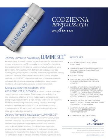 CODZIENNA ochrona REWITALIZACJA i Dzienny kompleks nawilżający LUMINESCE ™ jest silnym przeciwzmarszczkowym środkiem nawilżającym ze wskaźnikiem ochrony przeciwsłonecznej 30, pomagającym zmniejszyć występowanie zmarszczek i drobnych linii poprzez wspieranie naturalnej zdolności skóry KOR ZYŚ CI: NATYCHMIASTOWE, CAŁODOBOWE NAWILŻENIE kluczowych czynników wzrostu człowieka, które stymulują naturalne procesy ZMNIEJSZA WYSTĘPOWANIE ZMARSZCZEK I DROBNYCH LINII W CIĄGU ZALEDWIE DWÓCH GODZIN organizmu, zapewnia skórze niezbędne nawilżenie. Dzienny kompleks NACIĄGA SKÓRĘ do nawilżania. Ten wspaniały krem do twarzy, zawierający ponad 200 nawilżający LUMINESCE™, stanowiący doskonałe rozwiązanie w zakresie pielęgnacji skóry, znacznie poprawia wygląd poprzez wspomaganie nawilżania, odnowę i rewitalizację skóry na poziomie komórek. Skóra jest cennym zasobem, więc konieczna jest jej ochrona w celu utrzymania młodszego i bardziej promiennego wyglądu. Długa ekspozycja na słońce oraz inne potencjalnie szkodliwe czynniki mogą znacznie uszkodzić skórę i przyspieszyć proces starzenia. Z tego powodu ważne jest, aby korzystać z ochrony i intensywnego nawilżania twarzy, używając dziennego kompleksu nawilżającego LUMINESCE™ ze wskaźnikiem ochrony NATURALNIE CHRONI SKÓRĘ PRZED DZIAŁANIEM SZKODLIWYCH PROMIENI UVA/UVB ZAWIERA WYJĄTKOWĄ, ZGŁOSZONĄ DO OPATENTOWANIA FORMUŁĘ OPARTĄ NA DOROSŁYCH KOMÓRKACH MACIERZYSTYCH ZAWIERAJĄCĄ PONAD 200 CZYNNIKÓW WZROSTU CZŁOWIEKA, KTÓRE WSPIERAJĄ NATURALNY PROCES ODNOWY SKÓRY POMAGA OPÓŹNIĆ PROCES STARZENIA POPRZEZ STYMULOWANIE KOMÓREK SKÓRY DO ODNOWY I ODMŁODZENIA gdzie jest to najbardziej potrzebne. ZAPEWNIA NATURALNĄ BARIERĘ NAWILŻAJĄCĄ ZAPOBIEGAJĄCĄ ODWODNIENIU SKÓRY Dzienny kompleks nawilżający LUMINESCE™ SZYBKO WCHŁANIA SIĘ W SKÓRĘ przeciwsłonecznej 30, aby chronić, odżywiać i odnawiać skórę tam, zawiera połączenie wysokiej jakości składników starannie wybranych pod nadzorem cieszącego się światową sławą dermatologa dr Nathana Newmana ze względu na ich wysoką skuteczność, nawilżanie oraz cechy przeciwdziałające starzeniu. Ten nietłusty krem nawilżający wchłania się niezwłocznie po nałożeniu i przy codziennym stosowaniu może zapewnić znaczne korzyści zarówno dla mężczyzn, jak i dla kobiet. Nie warto czekać dłużej na odkrycie zdrowszej i młodziej wyglądającej skóry. Wyprodukowano w Stanach Zjednoczonych wyłącznie dla JEUNESSE® GLOBAL 650 Douglas Avenue | Altamonte Springs, FL 32714 Więcej informacji można uzyskać pod numerem: 407-215-7414 JEUNESSEGLOBAL.COM F E AT U R E S : • USES AN EXCLUSIVE, PATENT-PENDING STEM CELL TECHNOLOGY THAT RESTORES LUMINOSITY, FIRMNESS, AND SMOOTHNESS AT THE CELLULAR LEVEL • PARABEN AND OIL-FREE • IS BASED ON THE MOST ADVANCED, CUTTING-EDGE TECHNOLOGY AVAILABLE • NON-GREASY FORMULA • CONTAINS NO ARTIFICIAL COLORS • MADE WITH ALL-NATURAL INGREDIENTS • HYPOALLERGENIC • DERMATOLOGIST APPROVED AND RECOMMENDED • SPF 30 KLUCZOWE SKŁADNIKI: P O W I TA J S Z C Z Ę Ś L I WĄ , piękną skórę. WYCIĄGI Z JABŁKA, SOCZEWICY I ARBUZA* zapobiegają utracie wody przez skórę; w ciągu dwóch tygodni zwiększają nawilżenie wewnątrzkomórkowe o 85%. Testy wykazują również, że już zaledwie po dwóch godzinach zmniejsza się występowanie zmarszczek i drobnych linii. EKSTRAKT Z CZERWONYCH WODOROSTÓW MORSKICH† zapewnia naturalną, silną barierę nawilżającą. EKSTRAKT Z ZIELONYCH ALG‡ w sposób naturalny chroni przed promieniami UVA/UVB. KOMPLEKS WITAMIN DLA SKÓRY LUMINESCE™ wyjątkowa mieszanka niezbędnych witamin, stworzona do odżywiania i ochrony skóry, zawierająca specjalną stabilną formę witaminy C, która minimalizuje występowanie plam starczych i wyrównuje barwę skóry. KOMPLEKS CZYNNIKÓW WZROSTU LUMINESCE™ przywraca naturalny proces odnawiania skóry dzięki wyjątkowej, zgłoszonej do opatentowania formule, opierającej się na dorosłych komórkach macierzystych, zawierającej ponad 200 czynników wzrostu. S T O S O WA N I E : WSKAZANIA: Wziąć niewielką ilość na palce. Równo wmasowywać w twarz ruchem okrężnym skierowanym w górę oraz w szyję ruchem skierowanym w górę. W celu uzyskania najlepszych rezultatów należy stosować po użyciu komórkowego serum odmładzającego LUMINESCE™. UWAGA: Unikać kontaktu z oczami. W razie kontaktu przepłukać oczy wodą. Unikać wystawiania produktu na działanie promieni słonecznych i skrajnych temperatur. Przechowywać produkt w suchym, chłodnym (20-25°C) i ciemnym miejscu. W przypadku wystąpienia podrażnienia zaprzestać stosowania i skonsultować się z lekarzem. *Wielokrotne testy kliniczne wykazały wysoką skuteczność składników. †Raporty z testów klinicznych wskazują na lepsze nawilżenie skóry niż działanie kwasu hialuronowego na żywym ustroju. ‡Próba kliniczna. Powyższe stwierdzenia nie zostały ocenione przez FDA (ang. Food and Drug Administration, amerykańska Agencja ds. Żywności i Leków). Niniejszy produkt nie ma na celu diagnozowania, leczenia ani zapobiegania jakimkolwiek chorobom. Produkty do pielęgnacji skóry LUMINESCE™ zostały stworzone, aby działać synergicznie. W celu skorzystania z prawdziwie skutecznego odmładzającego programu pielęgnacji skóry należy codziennie stosować całą linię produktów LUMINESCE™. RANO KROK 1: Przemyj twarz za pomocą odmładzającego i oczyszczającego kompleksu LUMINESCE™, aby łagodnie oczyścić skórę. KROK 2: Nałóż komórkowe serum odmładzające LUMINESCE™, aby wspomóc naturalny proces odnawiania ciała. KROK 3: Nałóż dzienny kompleks nawilżający LUMINESCE™ ze wskaźnikiem ochrony przeciwsłonecznej 30, aby zapewnić ochronę i nawilżenie. WIECZOREM POWTÓRZ KROKI 1 I 2. KROK 3: Zaawansowany kompleks regenerujący na noc LUMINESCE™ w celu utrzymania poziomu nawilżenia oraz odn