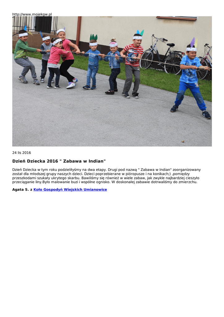 http://www.mojekgw.pl 24 lis 2016 Dzień Dziecka 2016 " Zabawa w Indian" Dzień Dziecka w tym roku podzieliłyśmy na dwa etapy. Drugi pod nazwą " Zabawa w Indian" zoorganizowany został dla młodszej grupy naszych dzieci. Dzieci poprzebierane w pióropusze i na konikach;) ,pomiędzy przeszkodami szukały ukrytego skarbu. Bawiliśmy się również w wiele zabaw, jak zwykle najbardziej cieszyło przeciąganie liny.Było malowanie buzi i wspólne ognisko. W doskonałej zabawie dotrwaliśmy do zmierzchu. Agata S. z Koło Gospodyń Wiejskich Umianowice