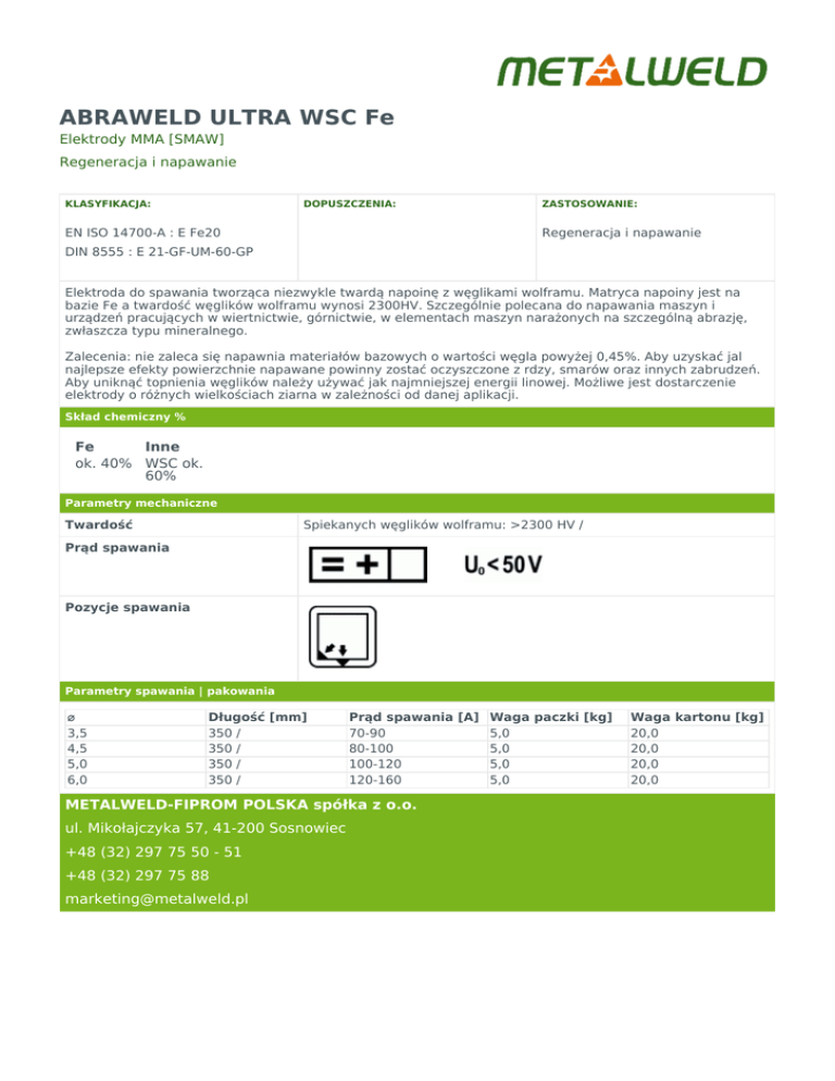 ABRAWELD ULTRA WSC Fe Elektrody MMA [SMAW] Regeneracja i napawanie KLASYFIKACJA: DOPUSZCZENIA: EN ISO 14700-A : E Fe20 ZASTOSOWANIE: Regeneracja i napawanie DIN 8555 : E 21-GF-UM-60-GP Elektroda do spawania tworząca niezwykle twardą napoinę z węglikami wolframu. Matryca napoiny jest na bazie Fe a twardość węglików wolframu wynosi 2300HV. Szczególnie polecana do napawania maszyn i urządzeń pracujących w wiertnictwie, górnictwie, w elementach maszyn narażonych na szczególną abrazję, zwłaszcza typu mineralnego. Zalecenia: nie zaleca się napawnia materiałów bazowych o wartości węgla powyżej 0,45%. Aby uzyskać jal najlepsze efekty powierzchnie napawane powinny zostać oczyszczone z rdzy, smarów oraz innych zabrudzeń. Aby uniknąć topnienia węglików należy używać jak najmniejszej energii linowej. Możliwe jest dostarczenie elektrody o różnych wielkościach ziarna w zależności od danej aplikacji. Skład chemiczny % Fe Inne ok. 40% WSC ok. 60% Parametry mechaniczne Twardość Spiekanych węglików wolframu: >2300 HV / Prąd spawania Pozycje spawania Parametry spawania | pakowania ⌀ 3,5 4,5 5,0 6,0 Długość [mm] 350 / 350 / 350 / 350 / Prąd spawania [A] Waga paczki [kg] 70-90 5,0 80-100 5,0 100-120 5,0 120-160 5,0 METALWELD-FIPROM POLSKA spółka z o.o. ul. Mikołajczyka 57, 41-200 Sosnowiec +48 (32) 297 75 50 - 51 +48 (32) 297 75 88 [email protected] Powered by TCPDF (www.tcpdf.org) Waga kartonu [kg] 20,0 20,0 20,0 20,0