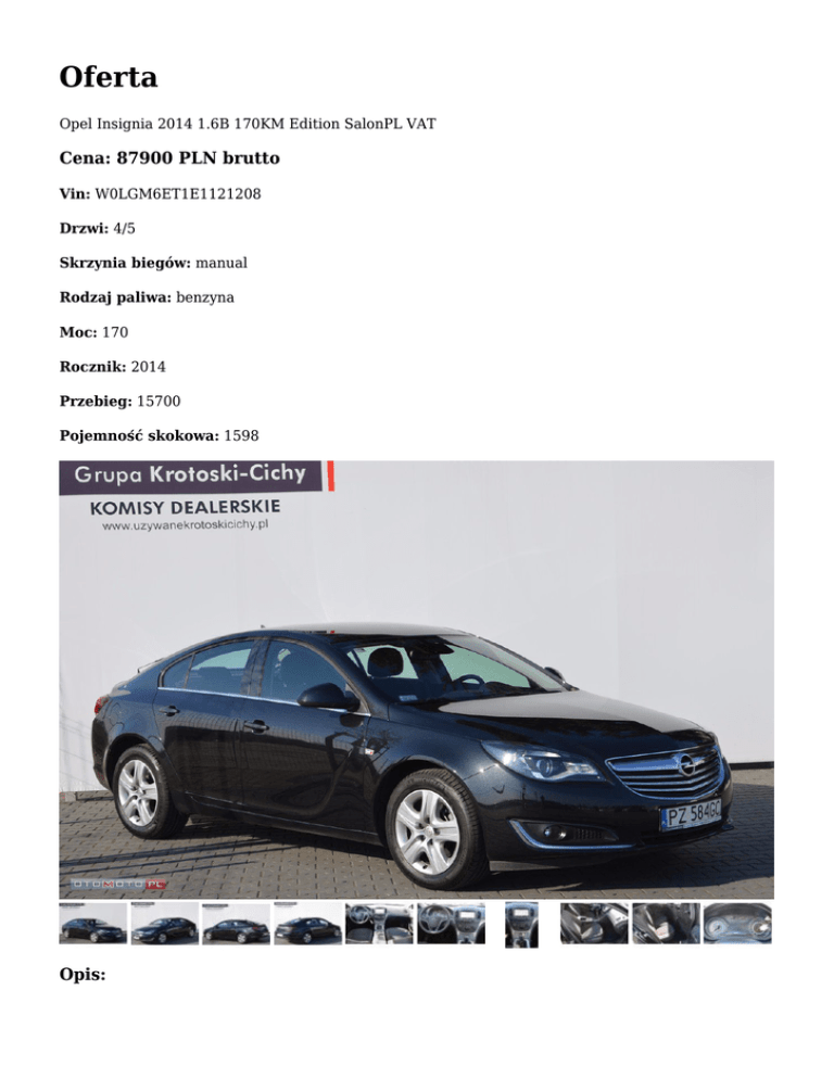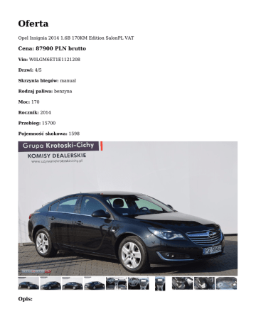 Oferta Opel Insignia 2014 1.6B 170KM Edition SalonPL VAT Cena: 87900 PLN brutto Vin: W0LGM6ET1E1121208 Drzwi: 4/5 Skrzynia biegów: manual Rodzaj paliwa: benzyna Moc: 170 Rocznik: 2014 Przebieg: 15700 Pojemność skokowa: 1598 Opis: Auto-Handel-Centrum Krotoski-Cichy Autoryzowany Dealer VW Audi Seat Skoda GWARANCJA POCHODZENIA MOŻLIWOŚĆ SPRAWDZENIA POJAZDU W STACJI OBSŁUGI. MOŻLIWOŚĆ POZOSTAWIENIA SWOJEGO SAMOCHODU UŻYWANEGO W ROZLICZENIU !!!UWAGA!!! * PRZY SKORZYSTANIU Z NASZEJ FORMY FINANSOWANIA - KREDYTU LUB LEASINGU DODATKOWY RABAT * -----------------------------------------------------------------------------------------------------------------------------------------------------Uwaga: Miejsce ekspozycji pojazdu - Grupa Krotoski-Cichy Salon Pojazdów Używanych Wysogotowo, ul. Skórzewska 8 Osoba kontaktowa tel: Maximilian Gera - 609 790 272 Przemysław Mantaj - 601 750 883 Mariusz Kowalewski - 609 795 053 Możliwa jazda próbna po wcześniejszym uzgodnieniu terminu -----------------------------------------------------------------------------------------------------------------------------------------------------OPEL INSIGNIA COSMO 1.6 TURBO 170KM Cena katalogowa nowego pojazdu 112 100 zł brutto Samochód kupiony w polskim salonie OPEL Pojazd posiada gwarancję fabryczną do 05.2016 Przebieg: 15 700km Silnik benzynowy: 1.6 Turbo 170KM Samochód posiada komplet książek serwisowych Pojazd bezwypadkowy Wyposażenie: Lekko przyciemniona szyba tylna Lekko przyciemniona szyba przednia Antena dachowa typu „płetwa rekina” z anteną dywersyfikującą na szybie Zewnętrzna listwa okienna w srebrnym kolorze Czujnik deszczu Reflektory przeciwmgielne Lampy przeciwmgielne z tyłu Elektrycznie regulowane i podgrzewane lusterka zewnętrzne Aktywne zagłówki foteli przednich z 2kierunkową regulacją Podłokietnik z tyłu z otworem na długie przedmioty Gniazdko zasilania 12V w konsoli środkowej Klimatyzacja elektroniczna Elektrycznie sterowane szyby tylne Ręczna regulacja fotela kierowcy w 4 kierunkach, wysokość fotela regulowana elektrycznie Przełącznik w schowku deaktywujący czołową poduszkę powietrzną dla przedniego fotela pasażera Elektryczne szyby przednie Regulacja kolumny kierownicy w dwóch płaszczyznach Fotele przednie komfortowe Regulacja odcinka lędźwiowego oparcia fotela kierowcy Kierownica pokryta skórą z chromowaną listwą Dźwignia zmiany biegów pokryta skórą Lusterko wewnętrzne światłoczułe Listwy wewnętrzne: trigo cool Elektryczne szyby, przód (po stronie kierowcy) Fotel pasażera z regulacją w czterech kierunkach (regulacja nachylenia oparcia, wzdłużna) System automatycznego sterowania oświetleniem Nawiewy powietrza w drugim rzędzie foteli 7 głośników Radio IntelliLink RF700 Touch (wyświetlacz dotykowy 8", podwójny tuner, AuxIn, USB, Bluetooth, Audiostreaming, odtwarzanie video, funkcje głosowe) Czytnik kart SD, drugie gniazdo USB Czujnik ciśnienia w oponach z funkcją autokalibracji Wyświetlacz pomiędzy zegarami komputer pokładowy 4,2" Sterowanie radiem w kole kierownicy Automatyczny włącznik świateł z czujnikiem tunelu Czujnik zapięcia pasów na fotelu pasażera Tempomat Elektrycznie sterowany hamulec postojowy System wspomagania ruszania na pochyłościach Zdalnie sterowany centralny zamek ESP program kontroli stabilności jazdy Napinacz pasów bezpieczeństwa pasażera Poduszki powietrzne przednie, boczne przednie oraz kurtynowe Dojazdowe koło zapasowe 4Tx17" stalowe Koła stalowe strukturalne 7Jx17" i inne -----------------------------------------------------------------------------------------------------------------------------------------------------Oferujemy kompleksową obsługę sprzedaży ratalnej na bardzo dogodnych warunkach - w celu bliższego zapoznania się z aktualną ofertą finansowania prosimy o kontakt : Katarzyna Świątkiewicz - 609 562 980 Oferujemy ubezpieczenia samochodowe z wiodących na rynku ubezpieczalni - możliwość zakupu pakietu ubezpieczeniowego na miejscu. Oferujemy możliwość jazdy próbnej przed zakupem oraz usługę inspekcji pojazdu. Przyjmujemy również w rozliczeniu każdy pojazd. -----------------------------------------------------------------------------------------------------------------------------------------------------Ogłoszenie ma charakter informacyjny i stanowi zaproszenie do zawarcia umowy (art. 71 Kodeksu cywilnego); nie stanowi natomiast oferty handlowej w rozumieniu art. 66 § 1 Kodeksu cywilnego. W celu sprawdzenia zgodności oferty oraz uzyskania wszelkich informacji prosimy kontaktować się z handlowcem d.s. samochodów używanych Auto możesz zobaczyć: ul. Skórzewska 8 tel: 61 816-38-06 62-081 Wysogotowo Przemysław Mantaj GSM: 601 750 883 e-mail: [email protected] Maximilian Gera GSM: 609 790 272 e-mail: [email protected]